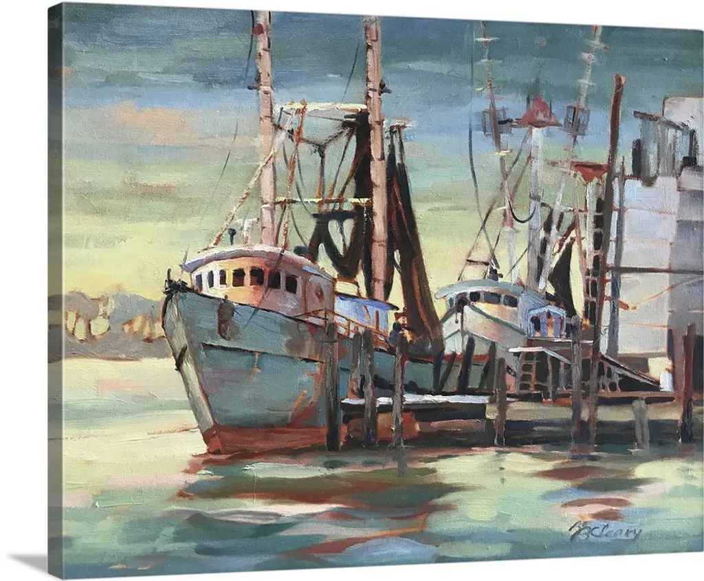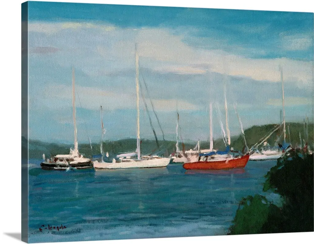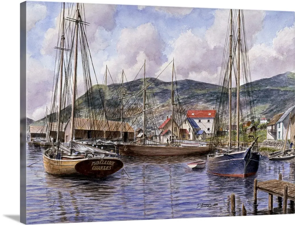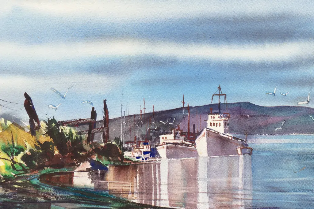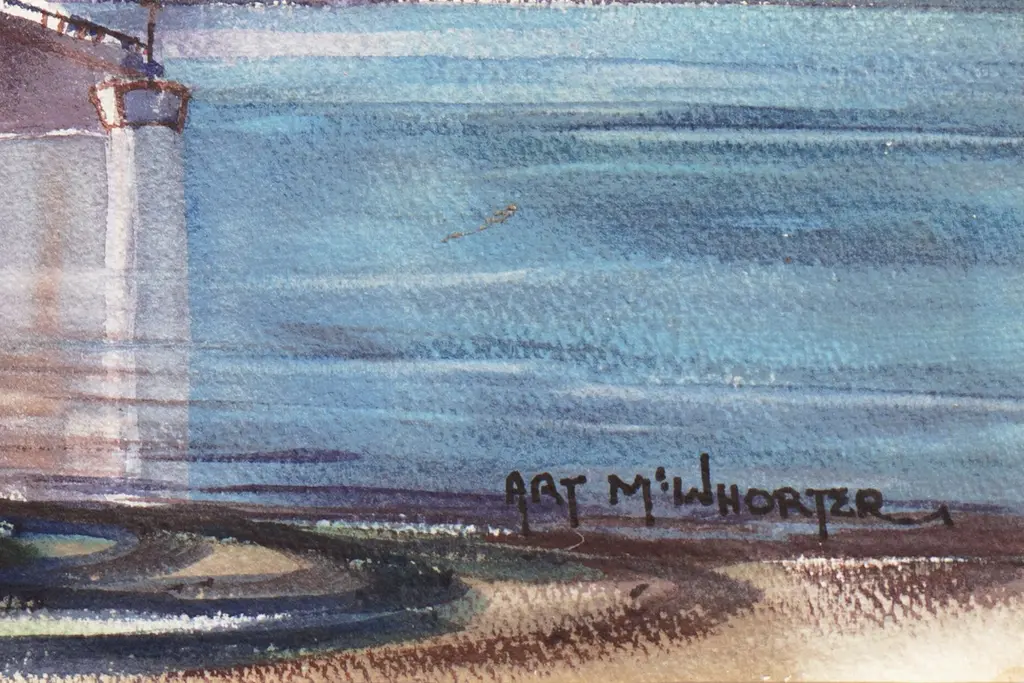 A finely-painted and period watercolor showing lights reflected in calm harbor waters beneath clouded, slate and blue skies and with a view beyond towards lavender-tinged hills. Signed "Art McWhorter" (American, 20th century). Art McWhorter studied at the American Artist's Professional League in New York. A member of the American Watercolor Society and the Society of Western Artists, he exhibited widely and with success and was the recipient of numerous medals, prizes and juried awards.