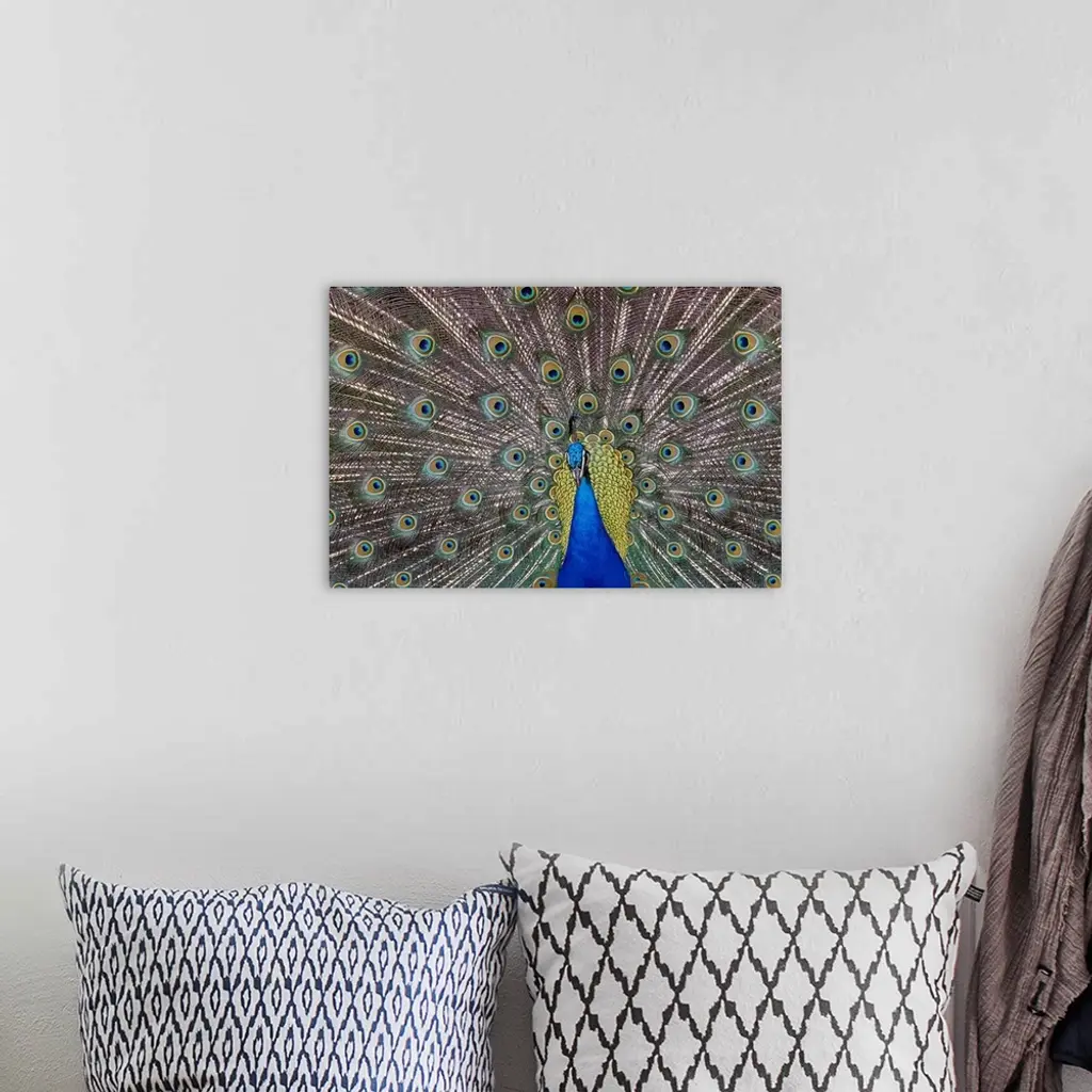 Landscape, large, close up photograph of a peacock with its colorful feathers spread out.