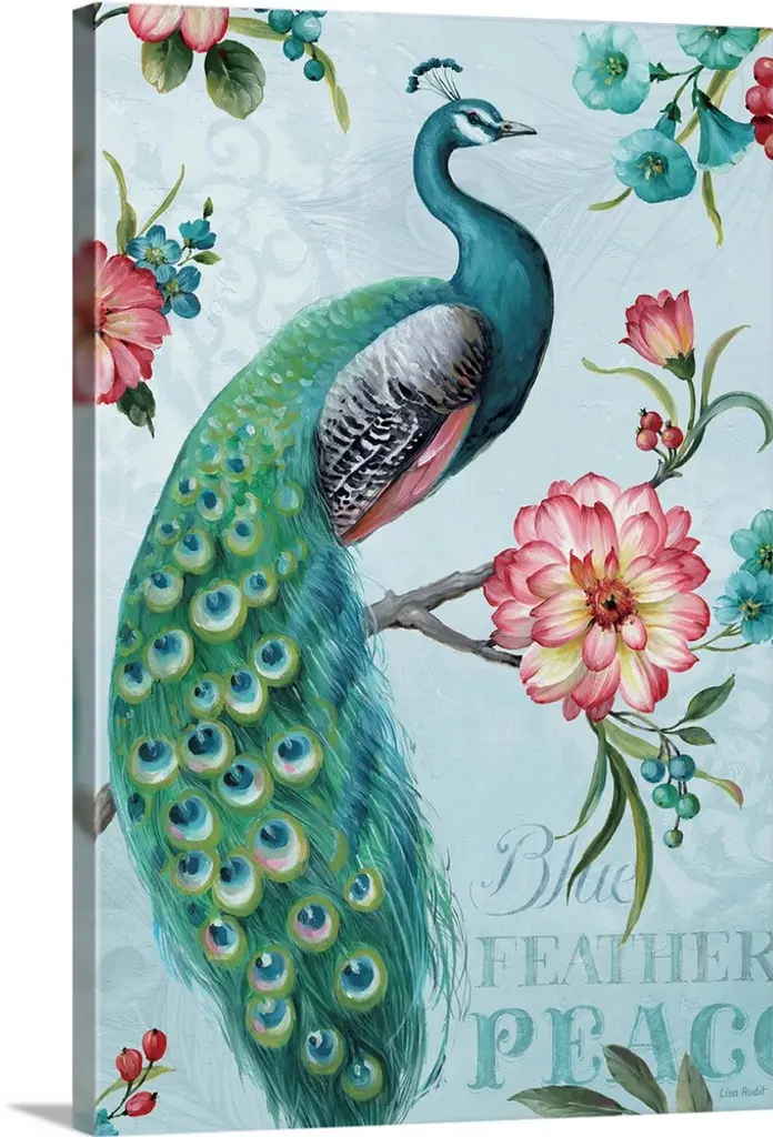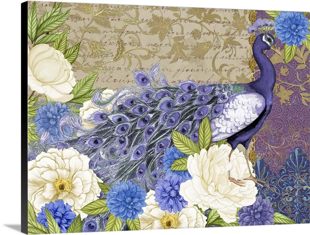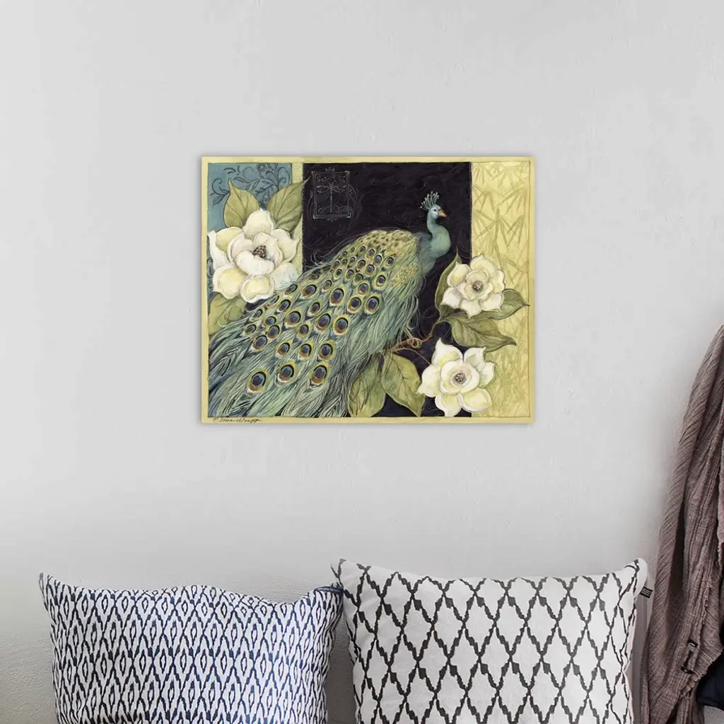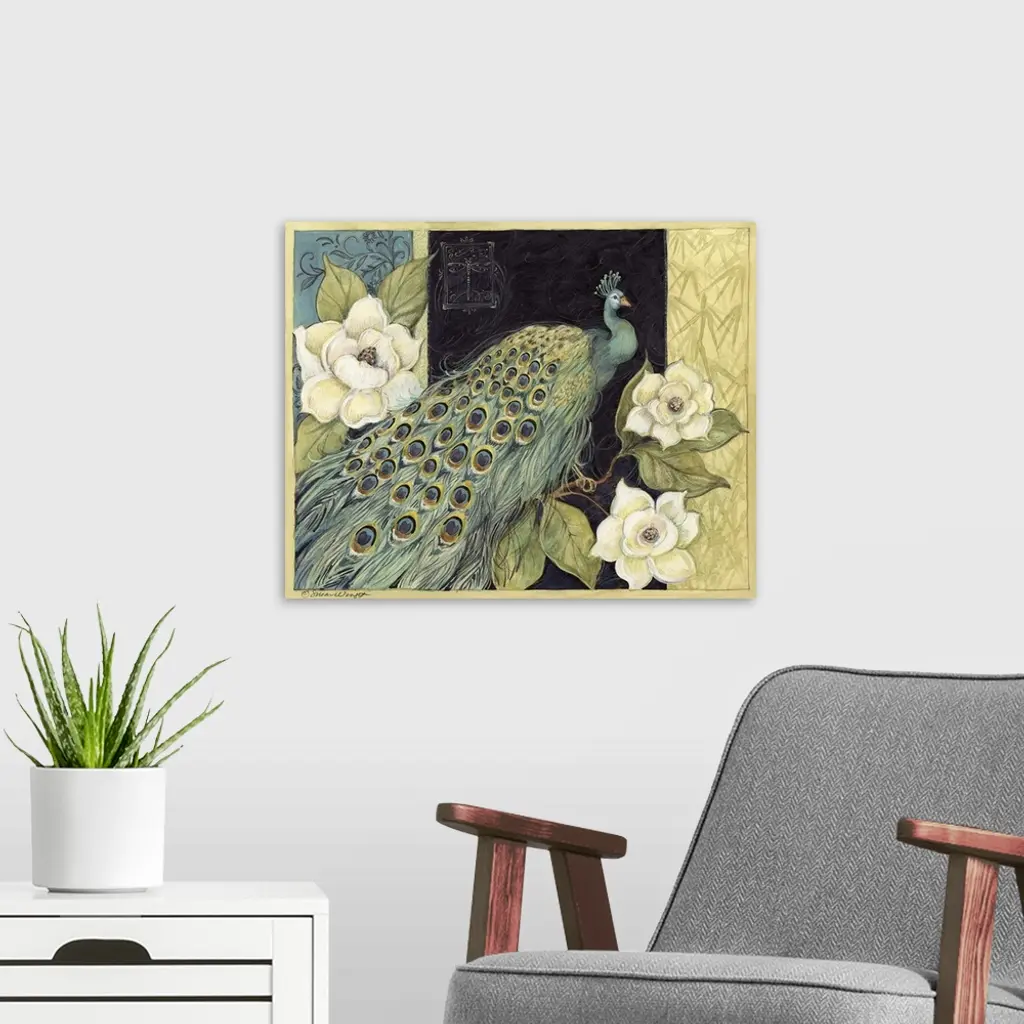 This decorative home accent is a painting of a peacock on branch with large floral blooms in front of a screen with textures traditionally found in lacquerware.