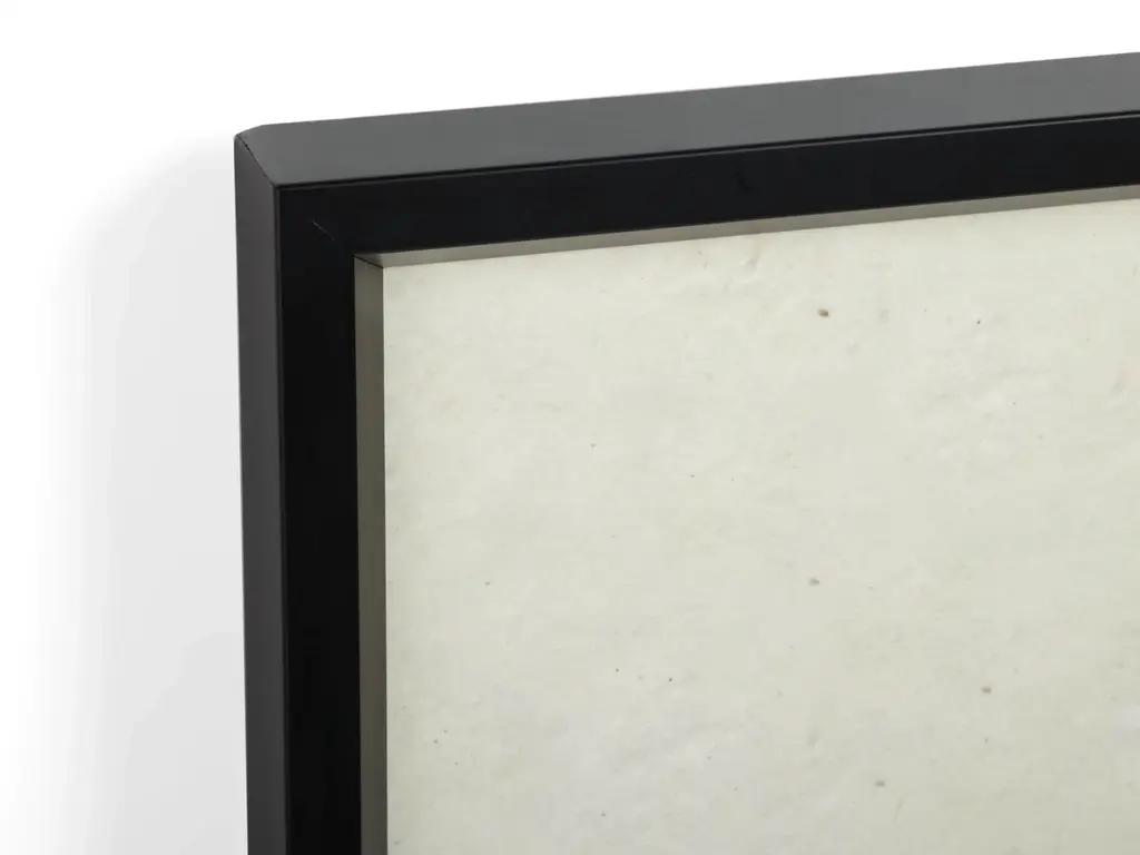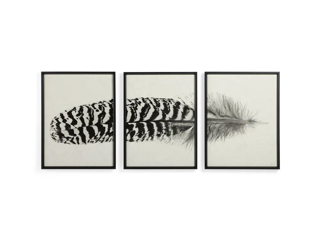 Enlarged to a grand scale, this black-and-white photo triptych of a peacock feather reveals the naturally elegant texture and delicate pattern not visible at the plume’s original size. Nepalese handmade paper continues to be a favorite for those seeking the most unique "old world" look for prints and stationary. Each sheet differs slightly in weight, color, and size, ensuring that no two pieces are exactly alike and you have a unique piece of art. Giclée-printed black-and-white photographs on Nepalese handmade paper. Wooden frame features a matte, black, painted finish. Sawtooth hanging. Weighs 5 lbs. per panel.