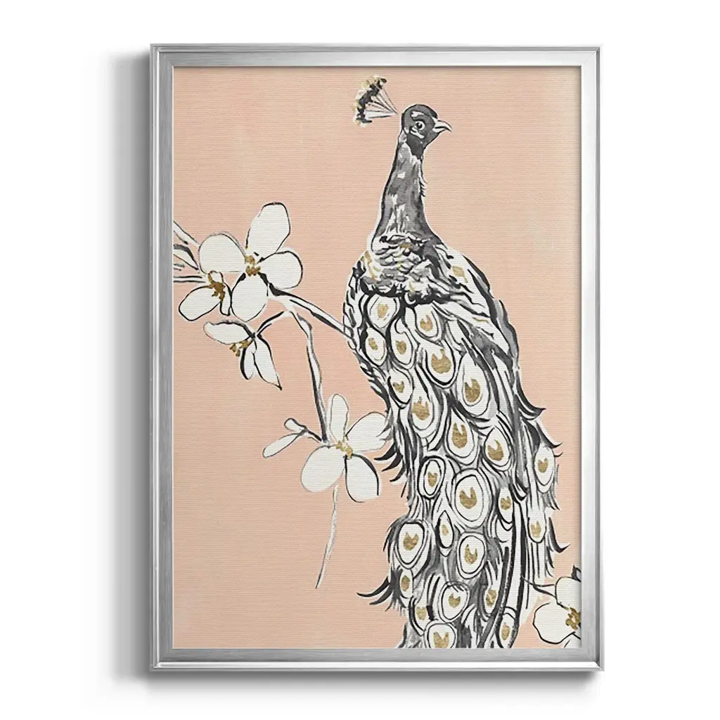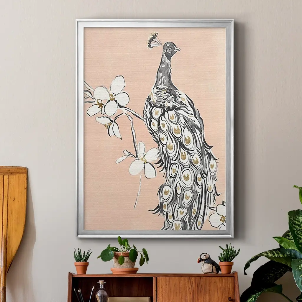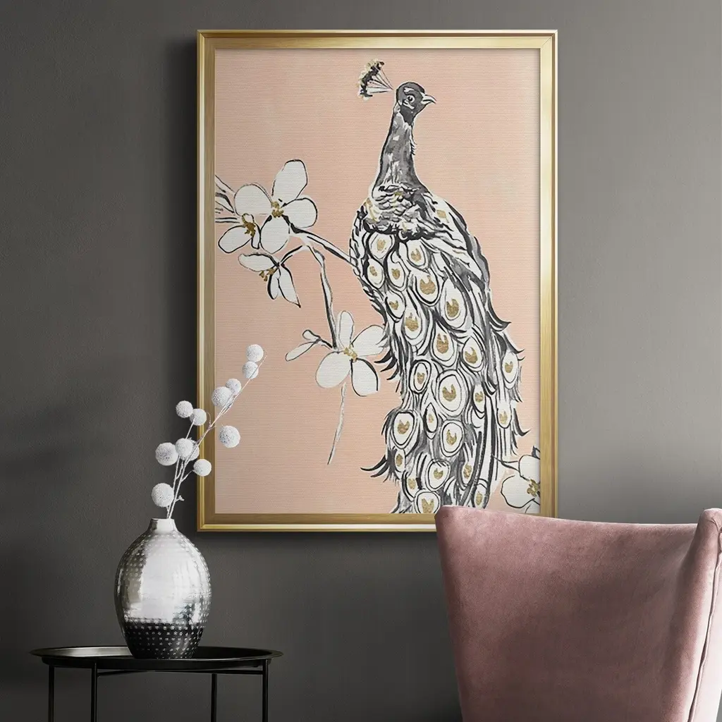Peacock in Gold I Premium Framed Print - Ready to Hang A Premium Framed Print created to last. Framed in distressed wood and available in an array of sizes and colors Featuring a beveled a solid wood stretcher bar, each piece comes ready to hand 4 SIZES AVAILABLE 30.5''X42.5'' - Overall Size 26.5'X36.5'' - Overall Size 22.5''x30.5'' - Overall Size 18.5''x24.5'' - Overall Size Each piece is made to order. Each piece comes with hanging hardware. Made in the USA Ready to Hang