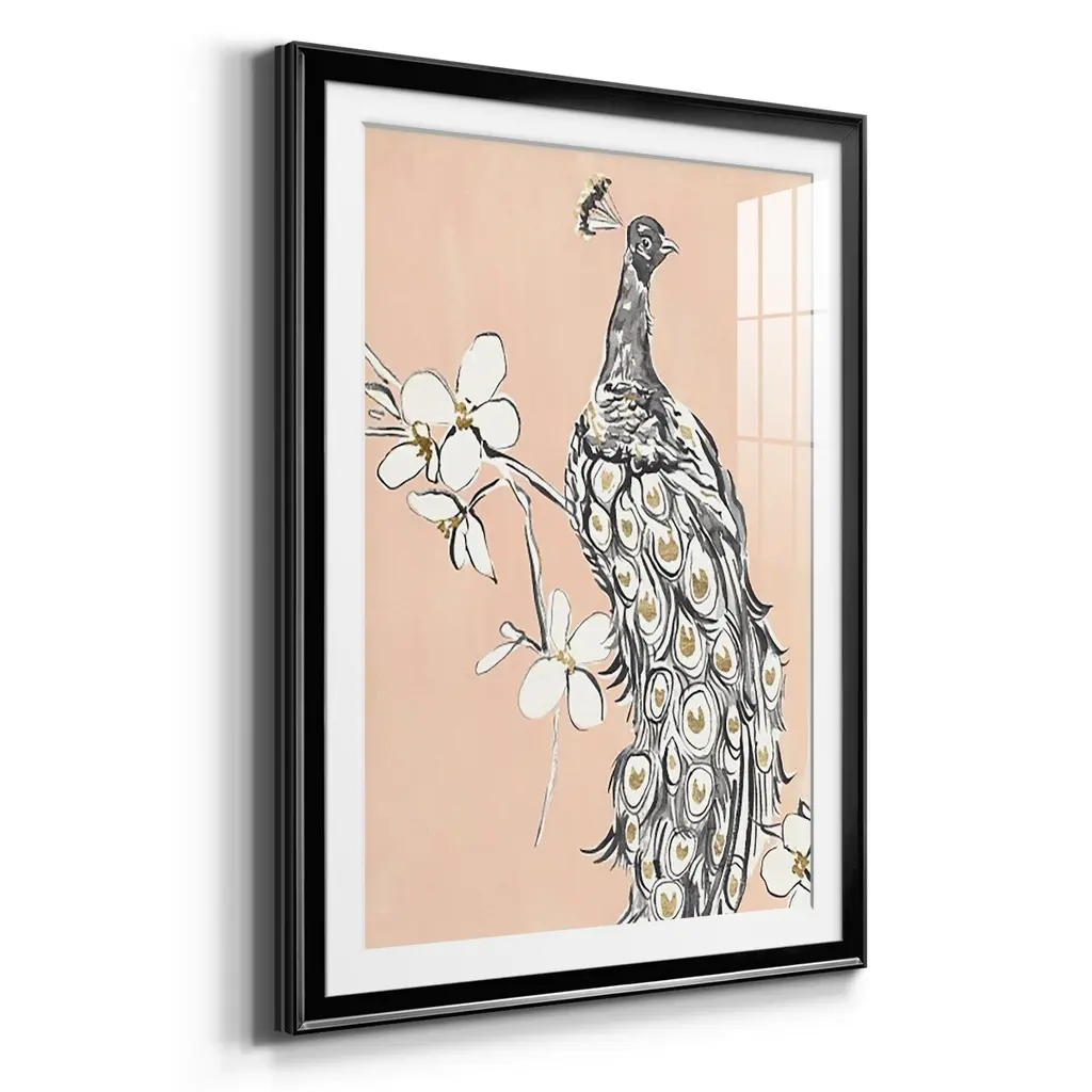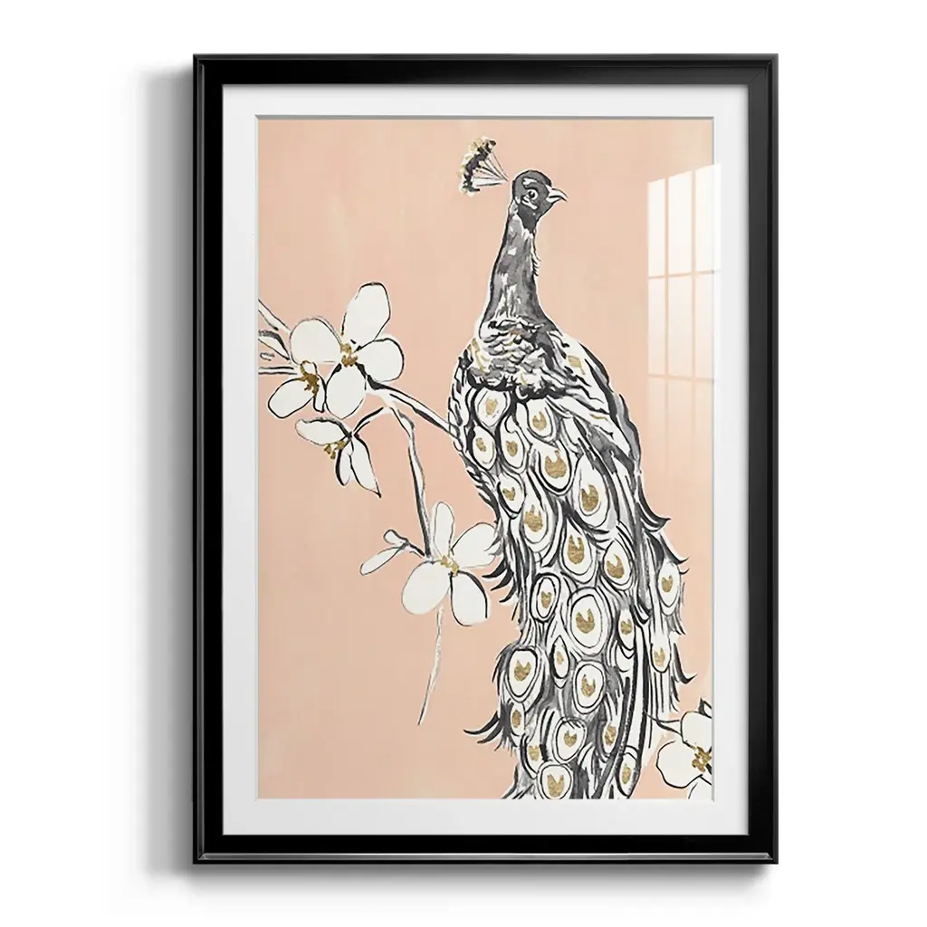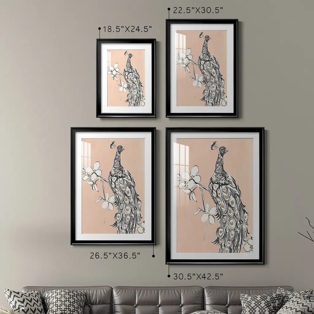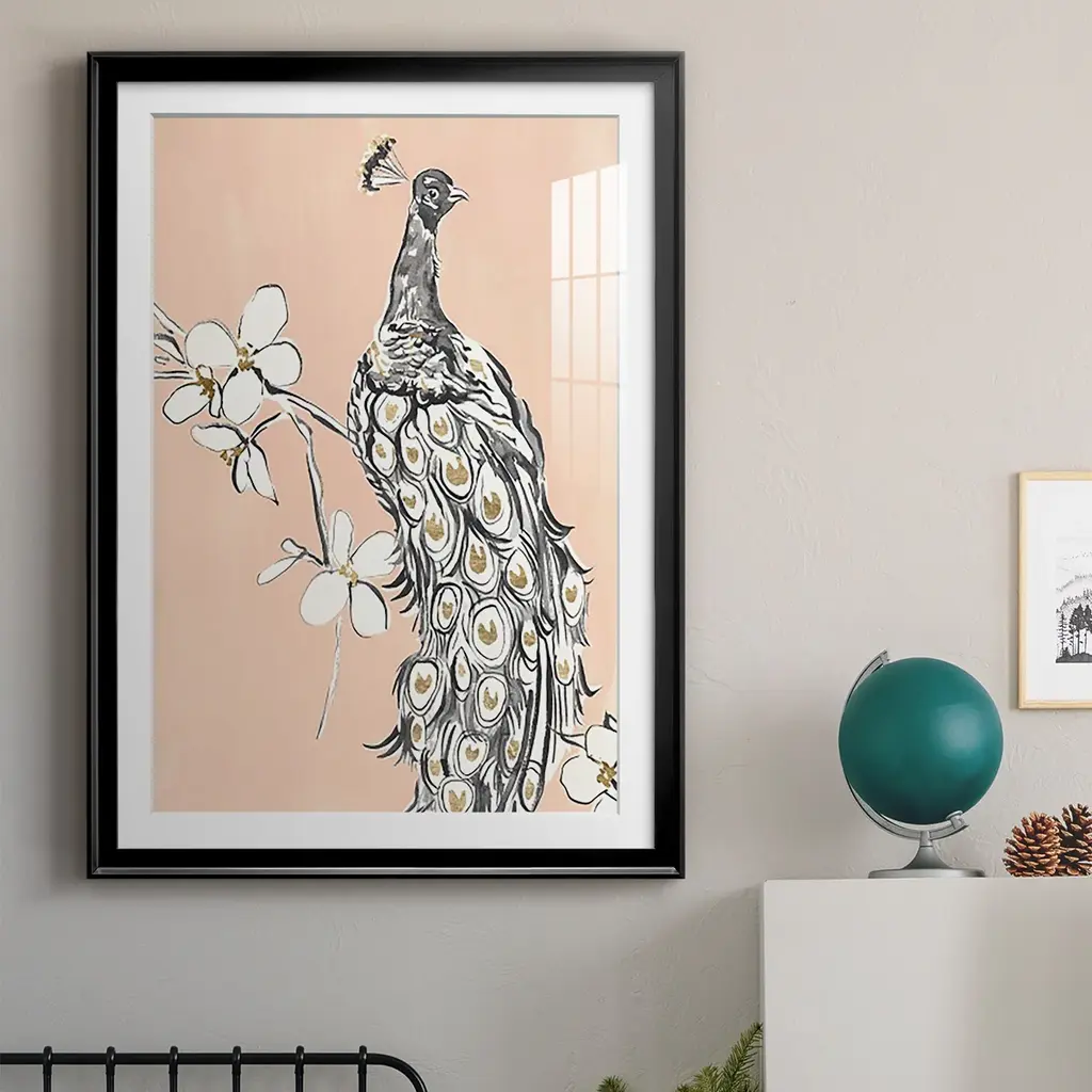Peacock in Gold I Premium Framed Print - Ready to Hang A Premium Framed Print created to last. Framed in distressed wood and available in an array of sizes and colors Featuring a beveled a solid wood stretcher bar, each piece comes ready to hand 4 SIZES AVAILABLE 30.5''X42.5'' - Overall Size 26.5'X36.5'' - Overall Size 22.5''x30.5'' - Overall Size 18.5''x24.5'' - Overall Size Each piece is made to order. Each piece comes with hanging hardware. Made in the USA Ready to Hang Giclee Paper Print Acrylic Glass Beveled Matt Board