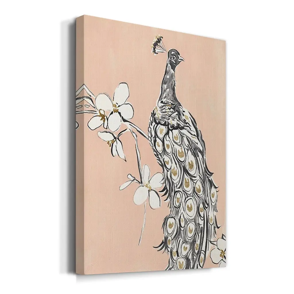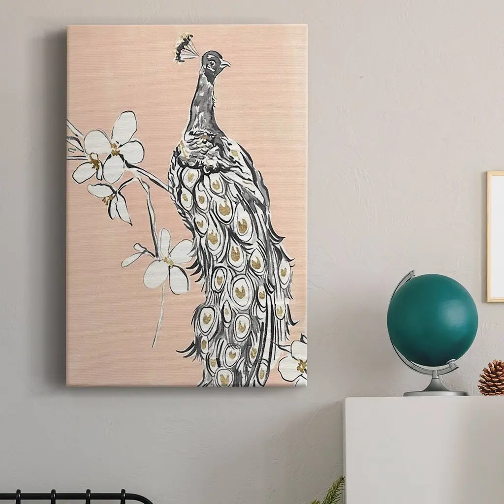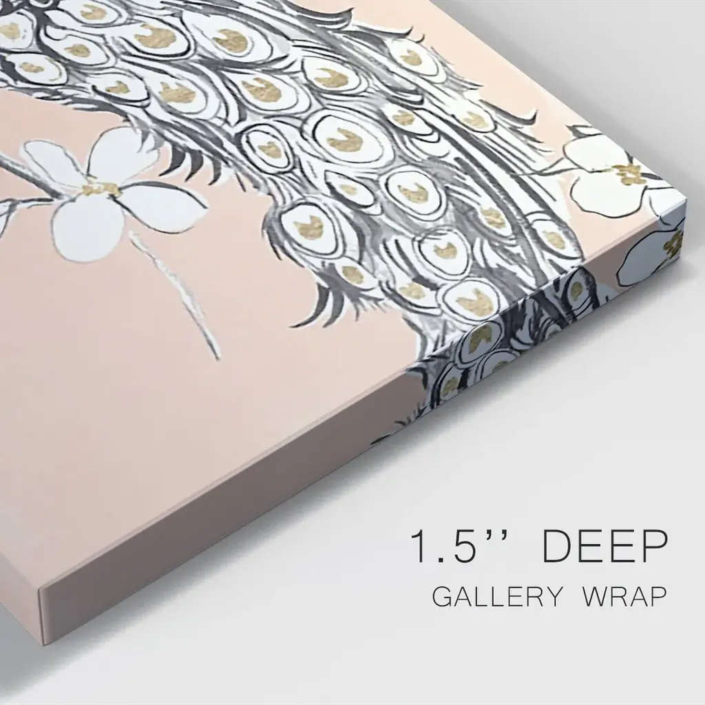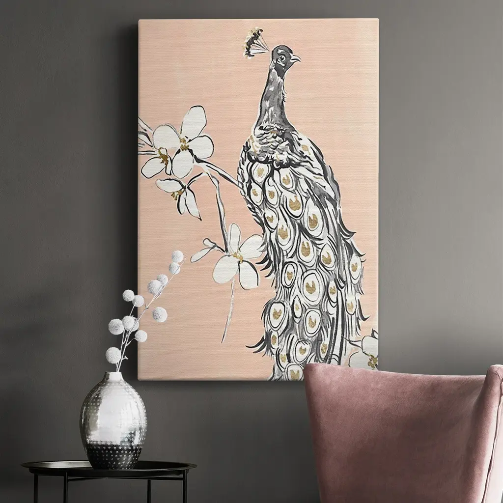 Peacock in Gold I Premium Gallery Wrapped Canvas - Ready to Hang A premium hand stretched gallery wrapped canvas print created to last. Featuring a beveled a solid wood stretcher bar, each piece comes ready to hand 6 SIZES AVAILABLE 8''X12'' - Overall Size 12''X18'' - Overall Size 18''X27'' - Overall Size 24''x36'' - Overall Size 32''x48'' - Overall Size 40''x60'' - Overall Size Each piece is made to order. Built to Last Each piece comes ready to hang Solid wood stretcher Fade and Water resistant Made domestically