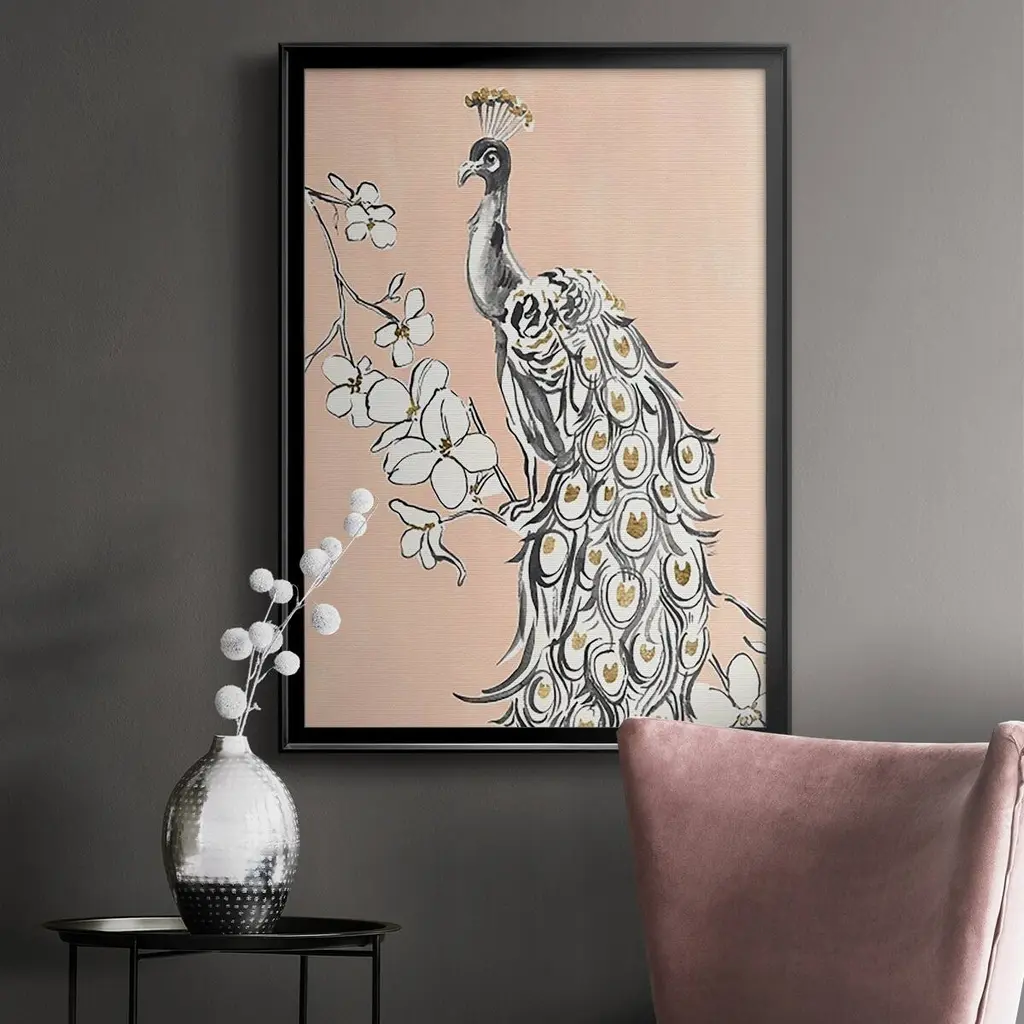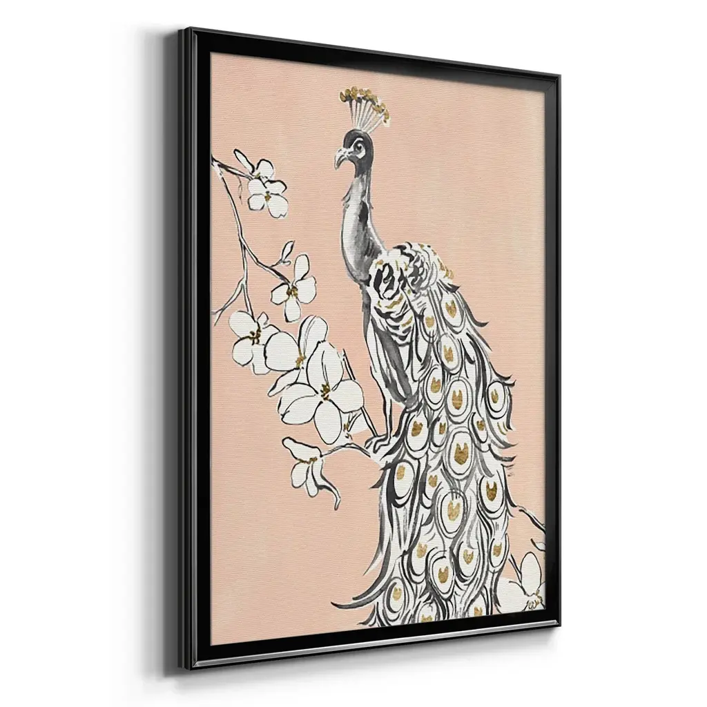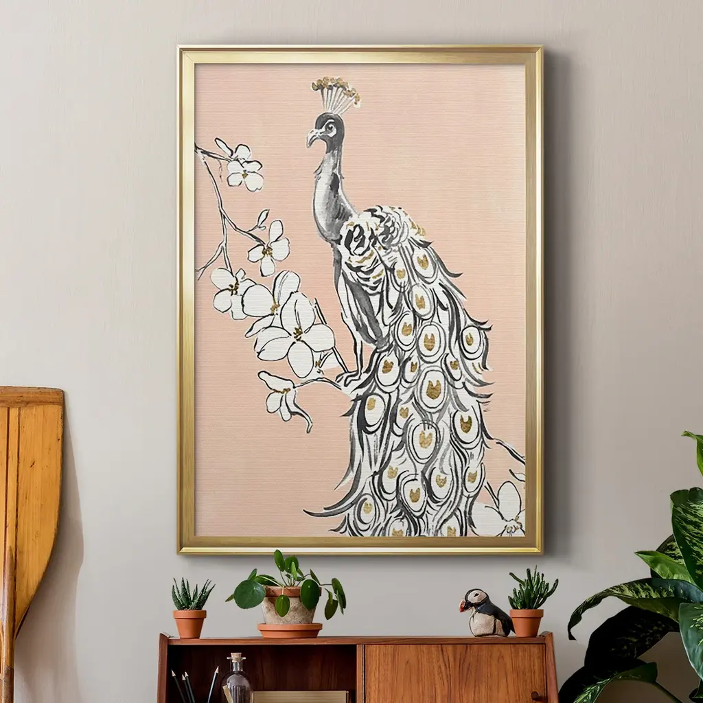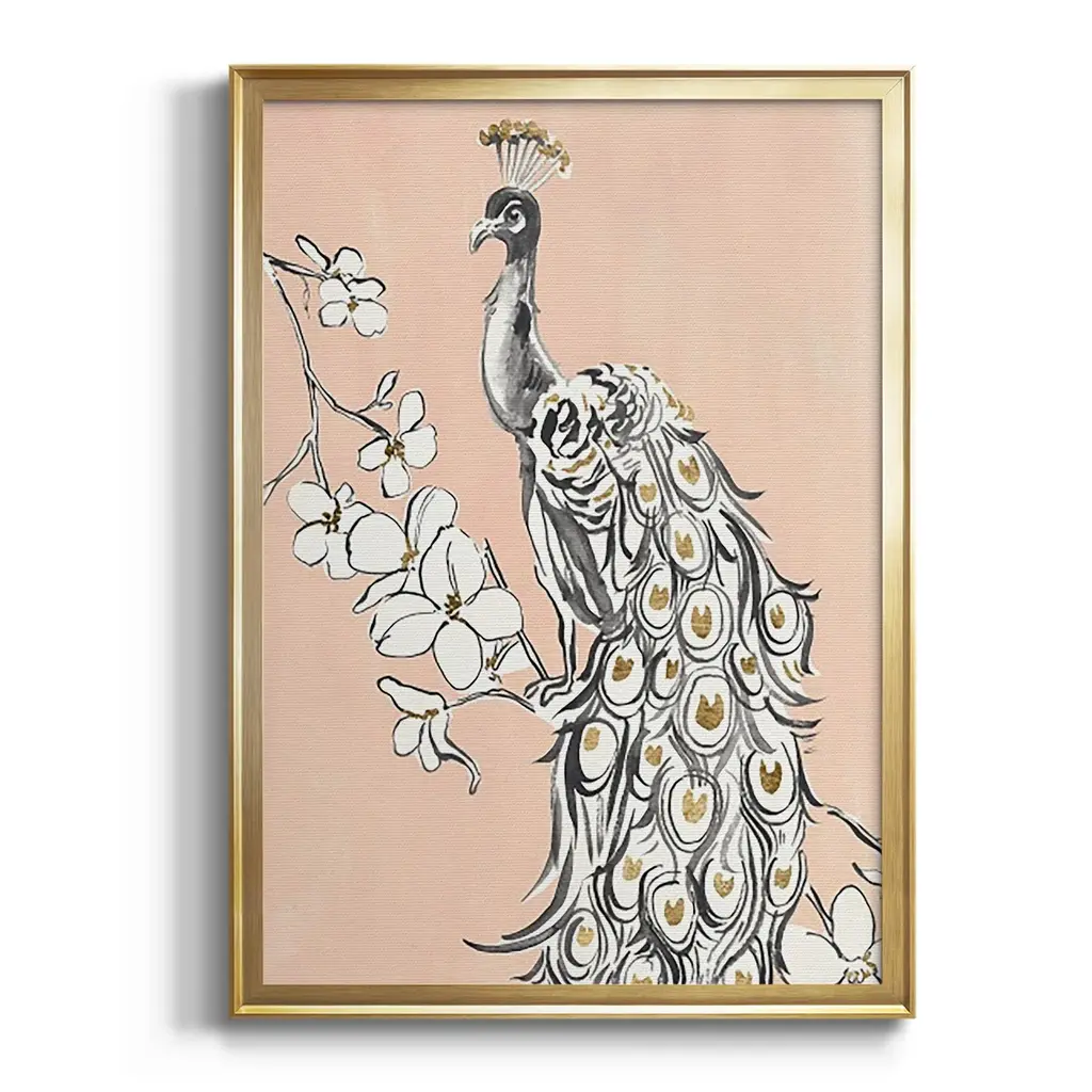 Peacock in Gold II Premium Framed Print - Ready to Hang A Premium Framed Print created to last. Framed in distressed wood and available in an array of sizes and colors Featuring a beveled a solid wood stretcher bar, each piece comes ready to hand 4 SIZES AVAILABLE 30.5''X42.5'' - Overall Size 26.5'X36.5'' - Overall Size 22.5''x30.5'' - Overall Size 18.5''x24.5'' - Overall Size Each piece is made to order. Each piece comes with hanging hardware. Made in the USA Ready to Hang