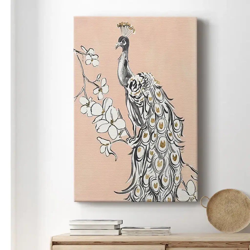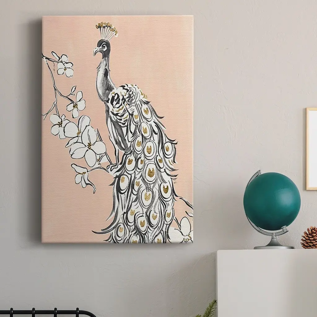 Peacock in Gold II Premium Gallery Wrapped Canvas - Ready to Hang A premium hand stretched gallery wrapped canvas print created to last. Featuring a beveled a solid wood stretcher bar, each piece comes ready to hand 6 SIZES AVAILABLE 8''X12'' - Overall Size 12''X18'' - Overall Size 18''X27'' - Overall Size 24''x36'' - Overall Size 32''x48'' - Overall Size 40''x60'' - Overall Size Each piece is made to order. Built to Last Each piece comes ready to hang Solid wood stretcher Fade and Water resistant Made domestically
