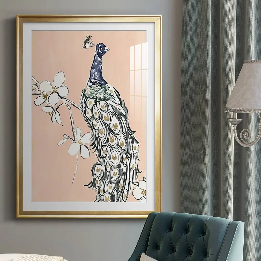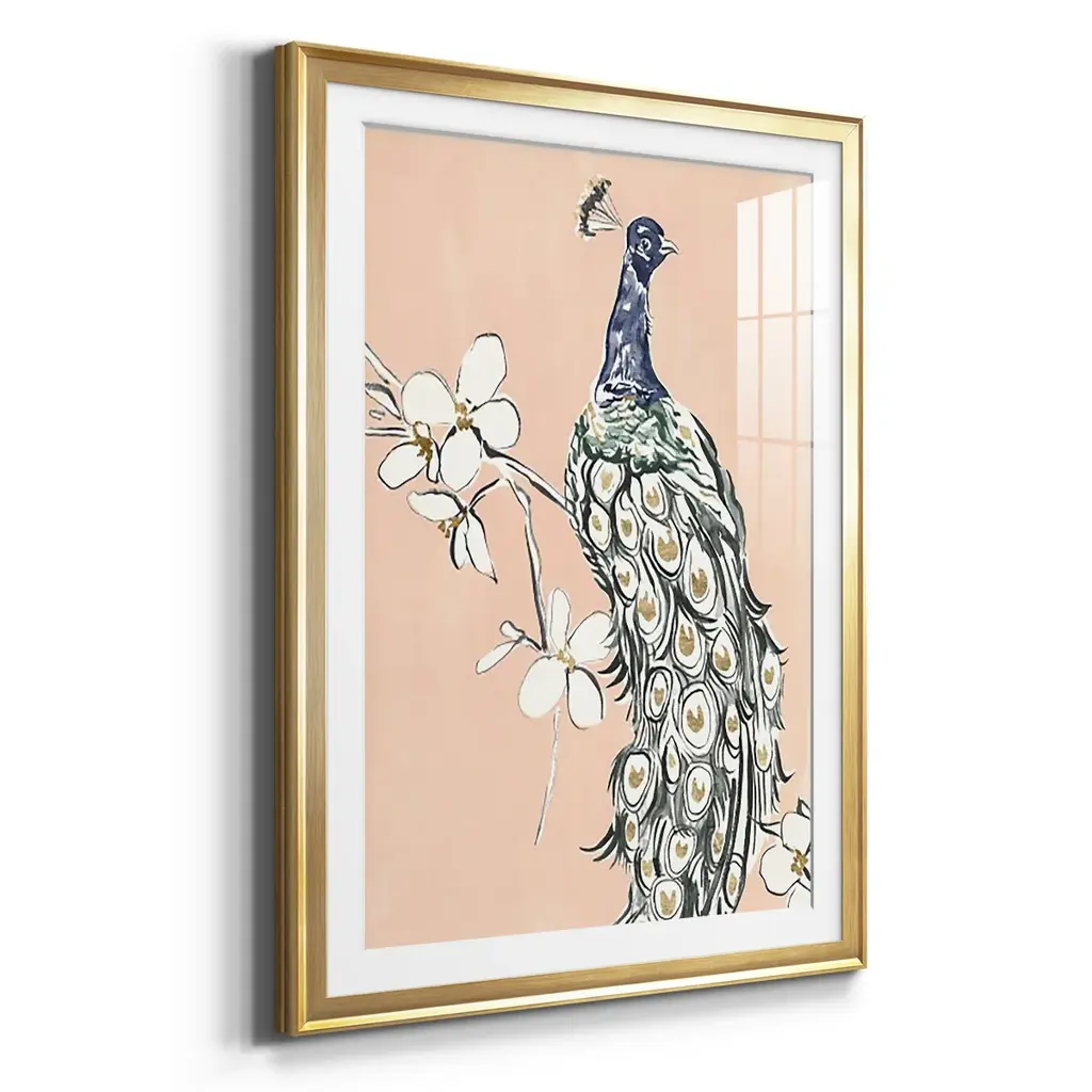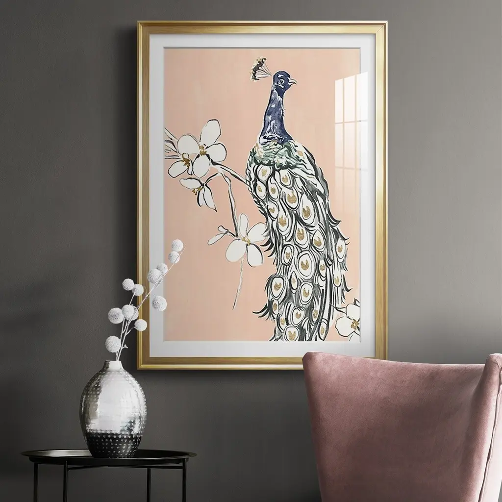 Peacock in Gold III Premium Framed Print - Ready to Hang A Premium Framed Print created to last. Framed in distressed wood and available in an array of sizes and colors Featuring a beveled a solid wood stretcher bar, each piece comes ready to hand 4 SIZES AVAILABLE 30.5''X42.5'' - Overall Size 26.5'X36.5'' - Overall Size 22.5''x30.5'' - Overall Size 18.5''x24.5'' - Overall Size Each piece is made to order. Each piece comes with hanging hardware. Made in the USA Ready to Hang Giclee Paper Print Acrylic Glass Beveled Matt Board