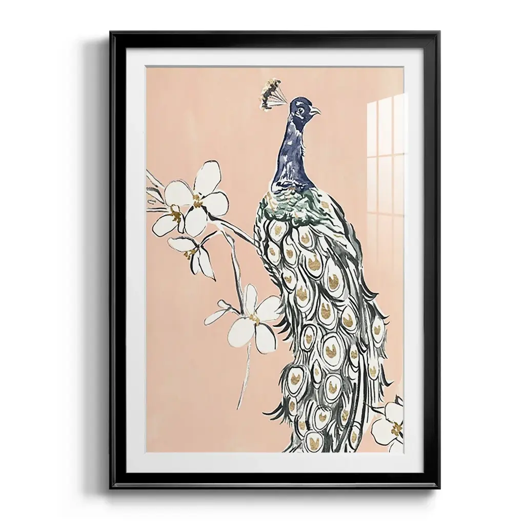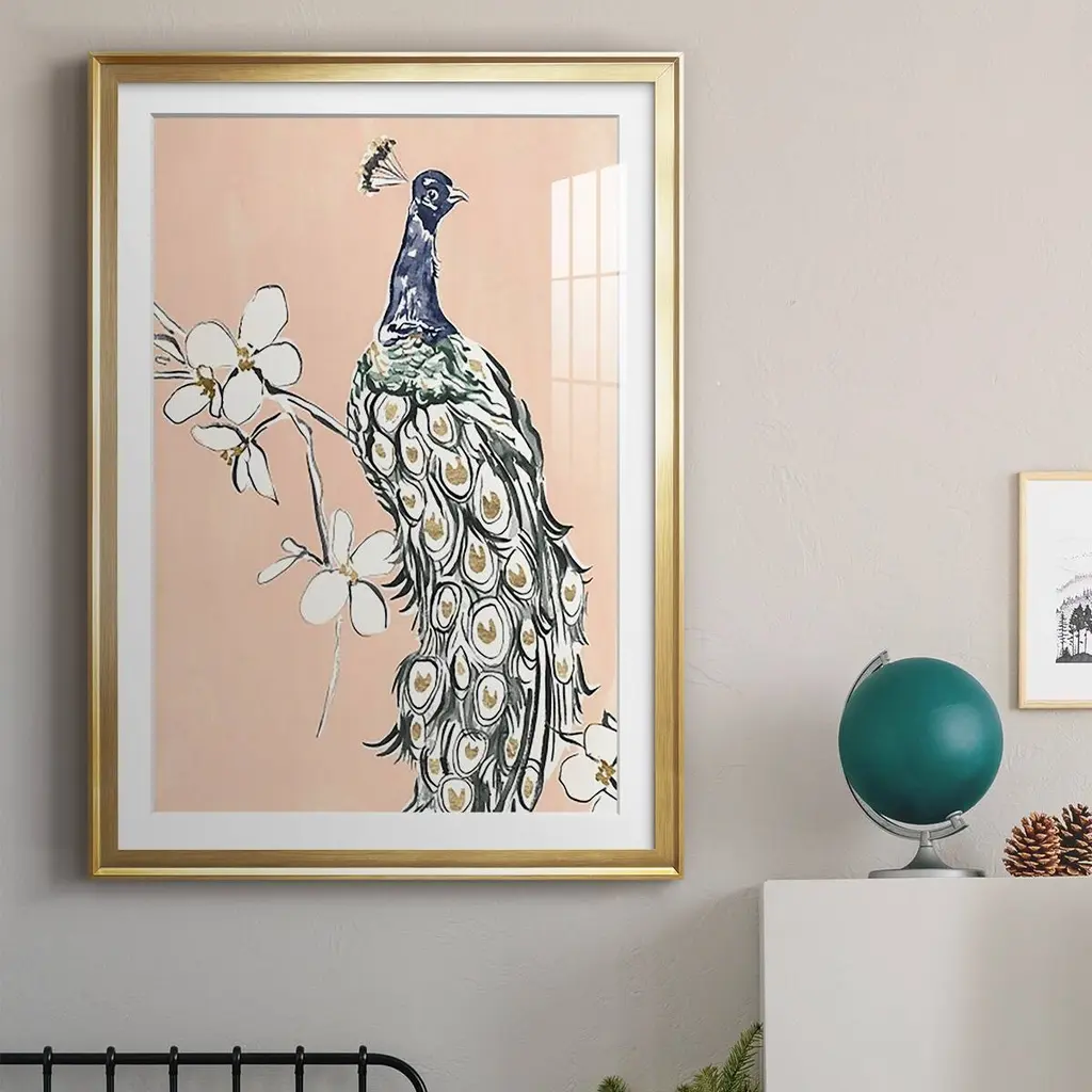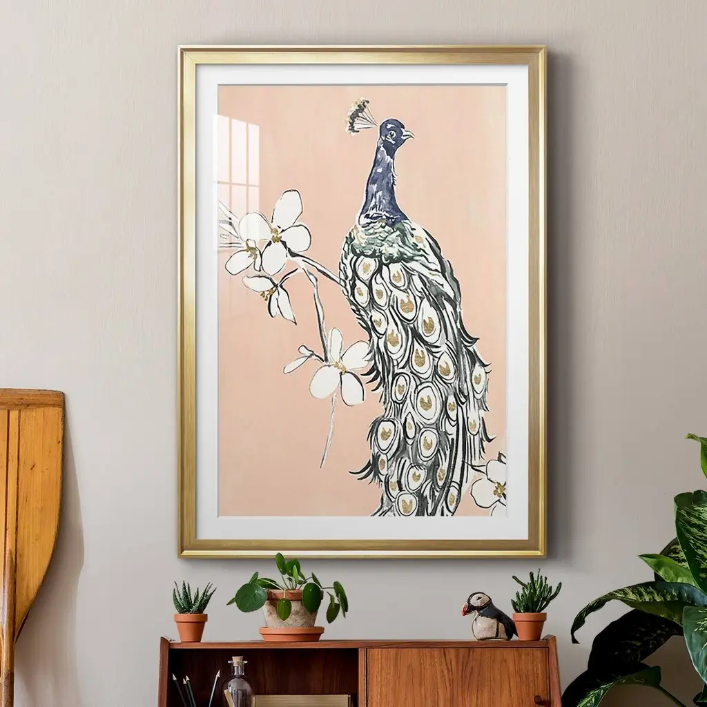 Peacock in Gold III Premium Framed Print - Ready to Hang A Premium Framed Print created to last. Framed in distressed wood and available in an array of sizes and colors Featuring a beveled a solid wood stretcher bar, each piece comes ready to hand 4 SIZES AVAILABLE 30.5''X42.5'' - Overall Size 26.5'X36.5'' - Overall Size 22.5''x30.5'' - Overall Size 18.5''x24.5'' - Overall Size Each piece is made to order. Each piece comes with hanging hardware. Made in the USA Ready to Hang Giclee Paper Print Acrylic Glass Beveled Matt Board