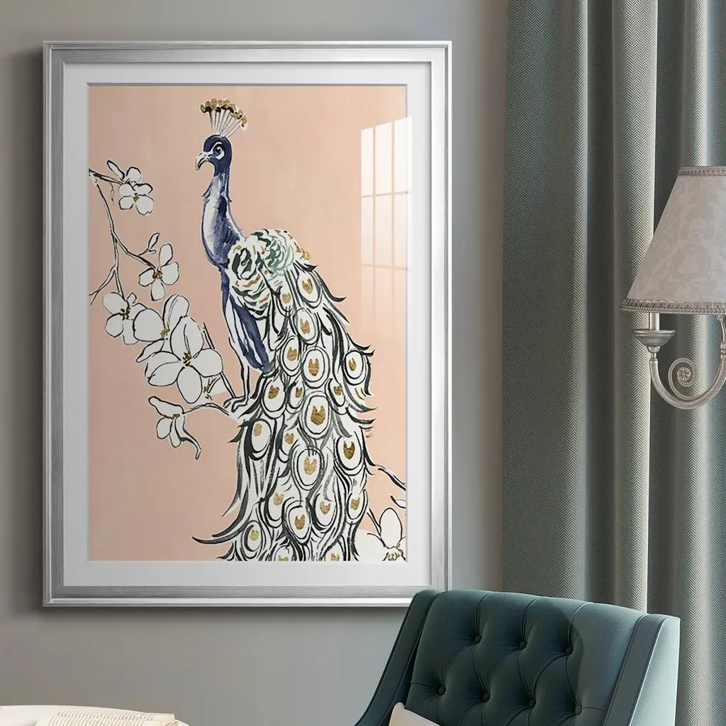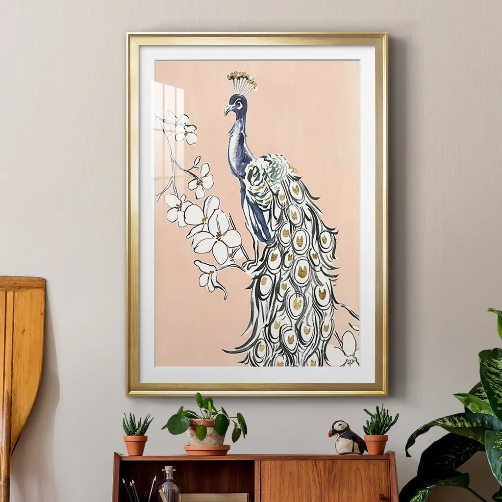 Peacock in Gold IV Premium Framed Print - Ready to Hang A Premium Framed Print created to last. Framed in distressed wood and available in an array of sizes and colors Featuring a beveled a solid wood stretcher bar, each piece comes ready to hand 4 SIZES AVAILABLE 30.5''X42.5'' - Overall Size 26.5'X36.5'' - Overall Size 22.5''x30.5'' - Overall Size 18.5''x24.5'' - Overall Size Each piece is made to order. Each piece comes with hanging hardware. Made in the USA Ready to Hang Giclee Paper Print Acrylic Glass Beveled Matt Board