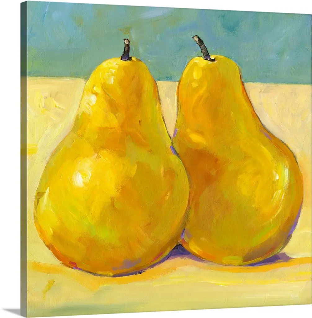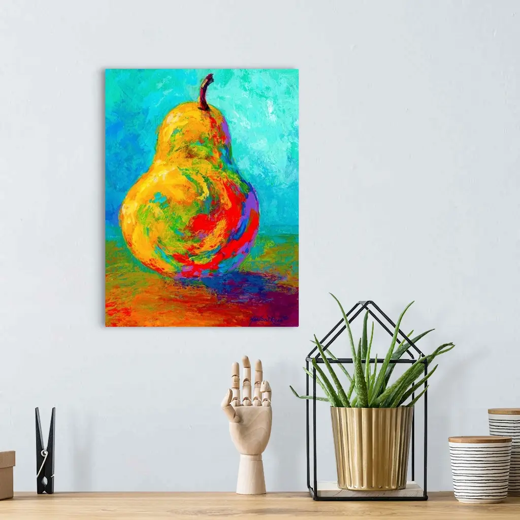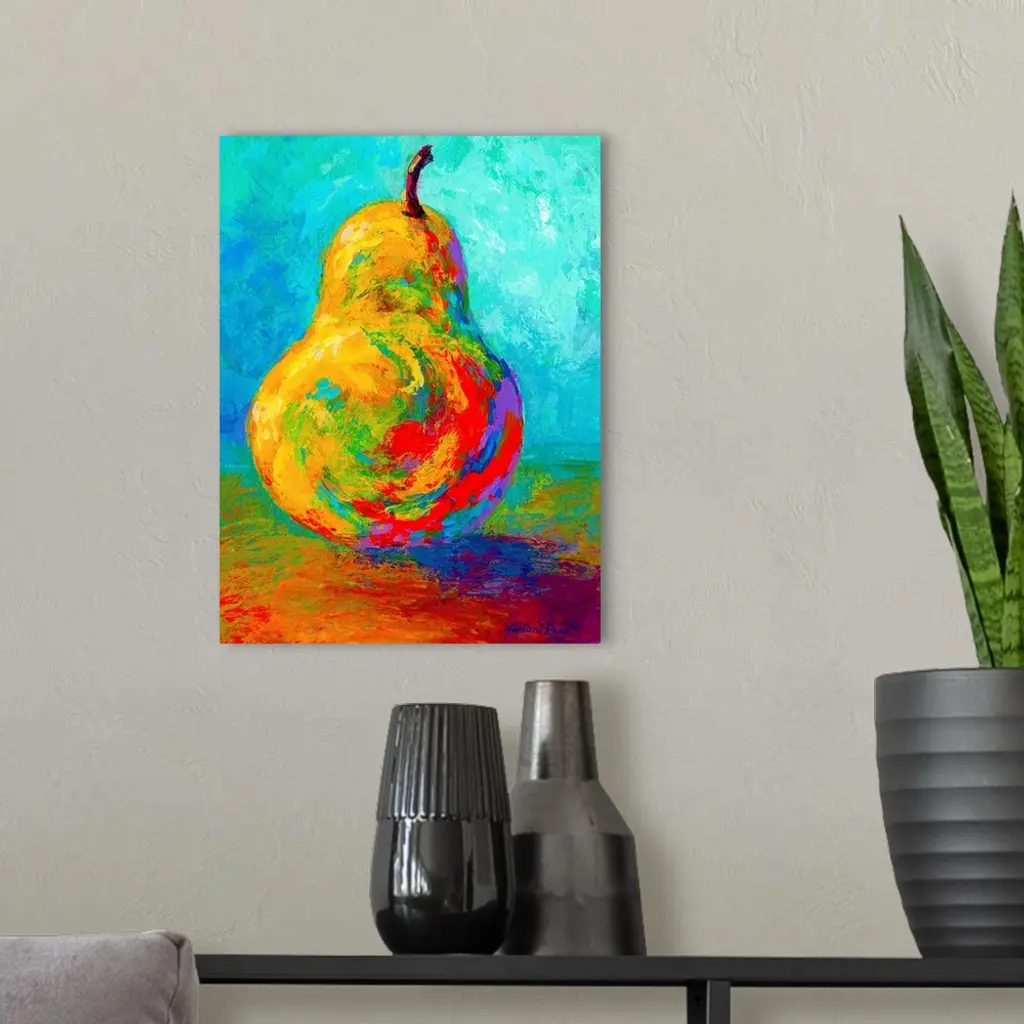 This vertical painting of a single piece of fruit balanced up right on the table uses vivid an unexpected colors to show the shadows and shading in this contemporary still life.