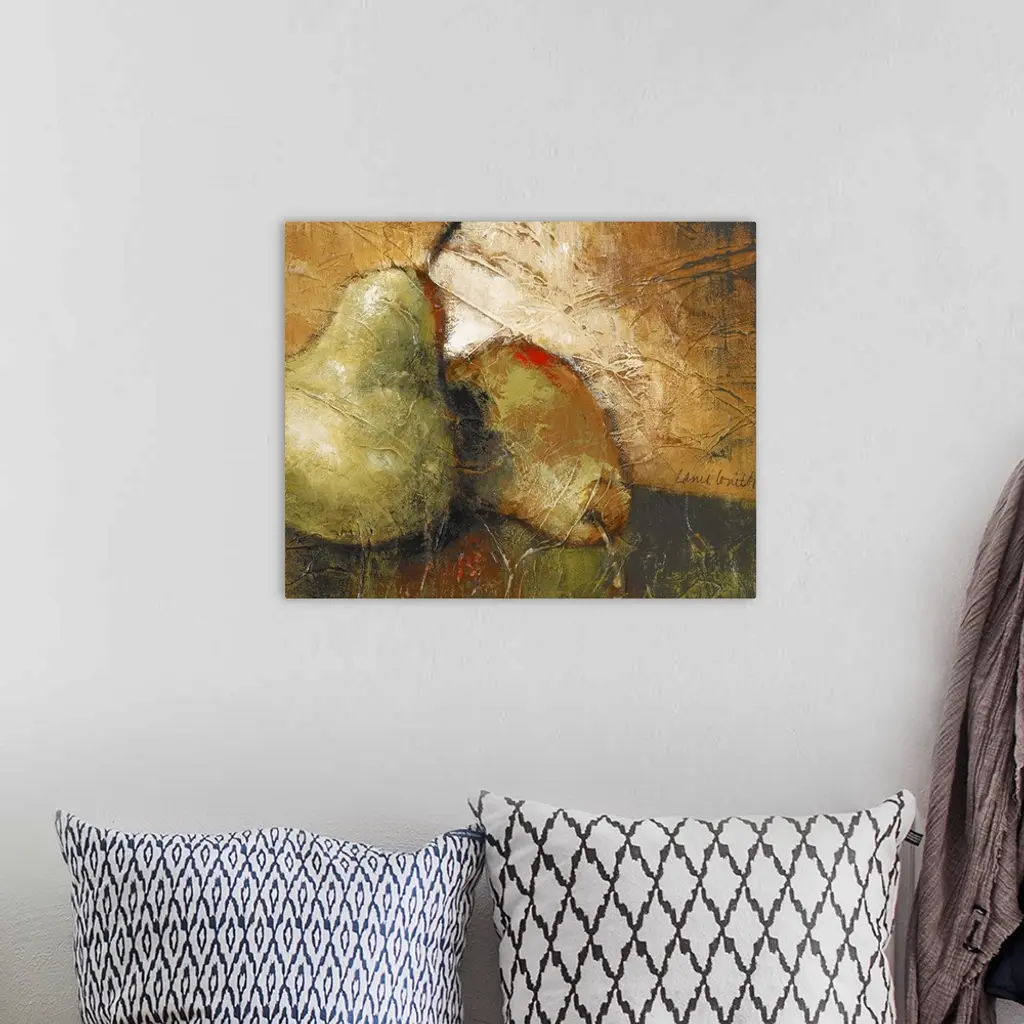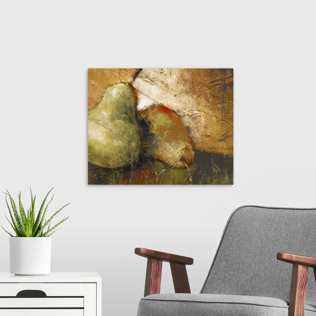 Painting of fruit sitting on a table. The image is textured with visible paint strokes.
