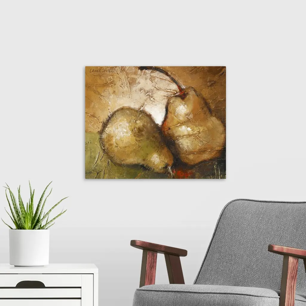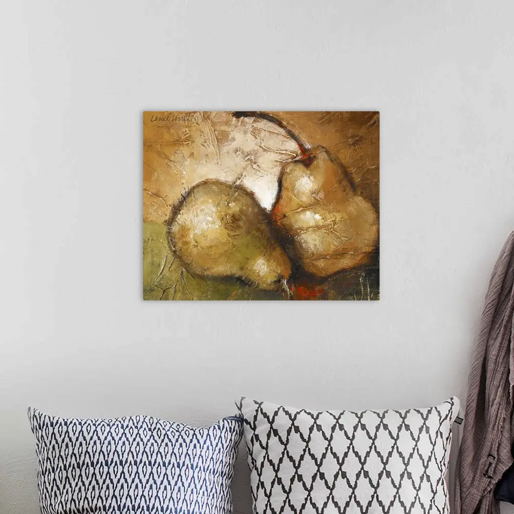 Decorative artwork perfect for the home or kitchen of two pears. The painting technique appears to leave creases in the picture.
