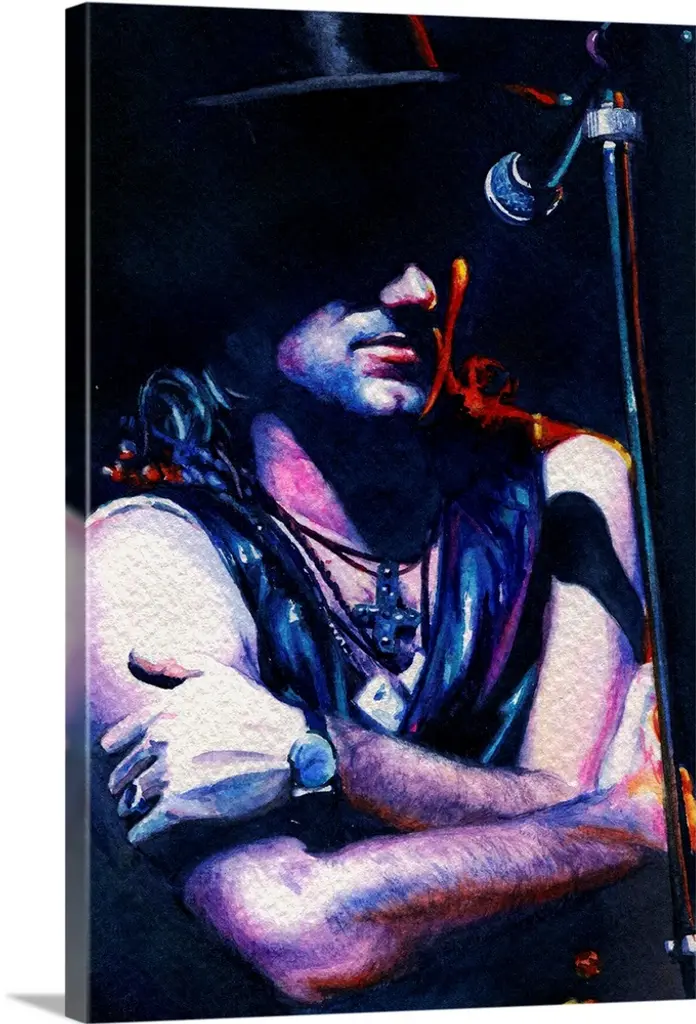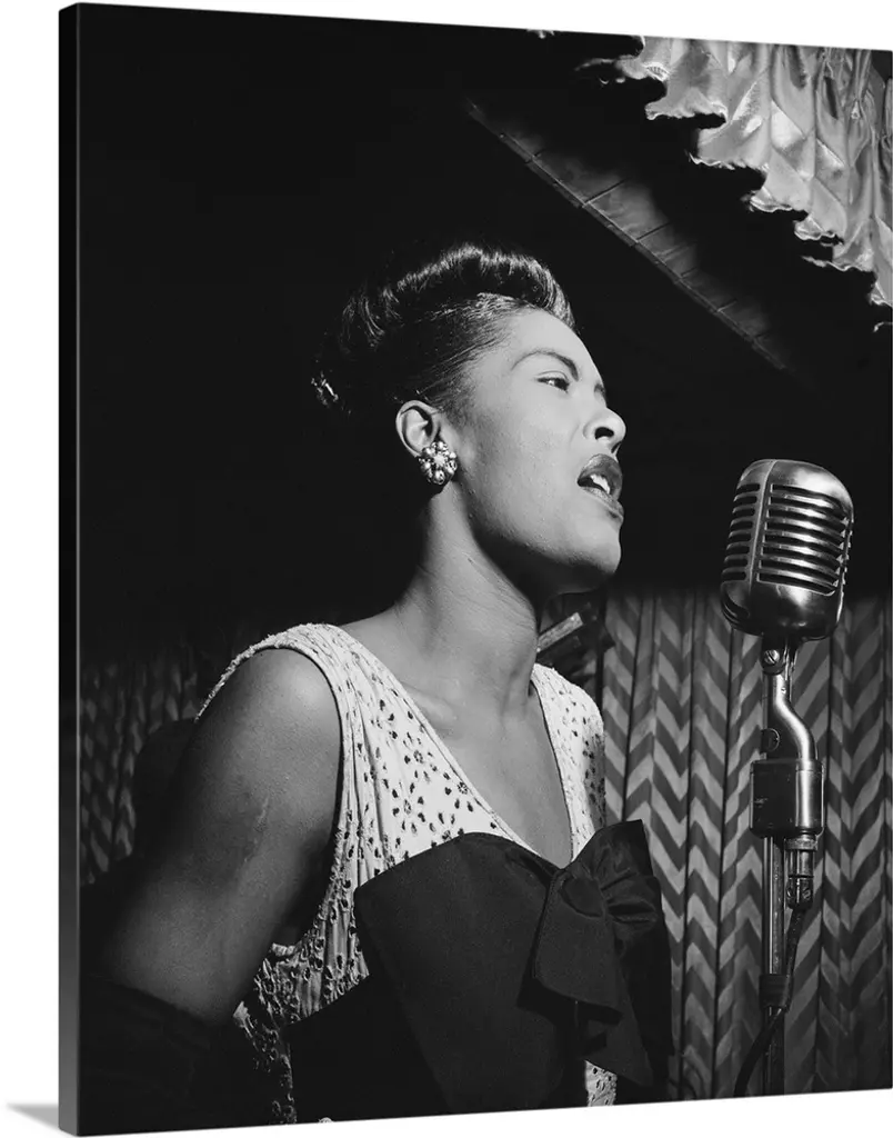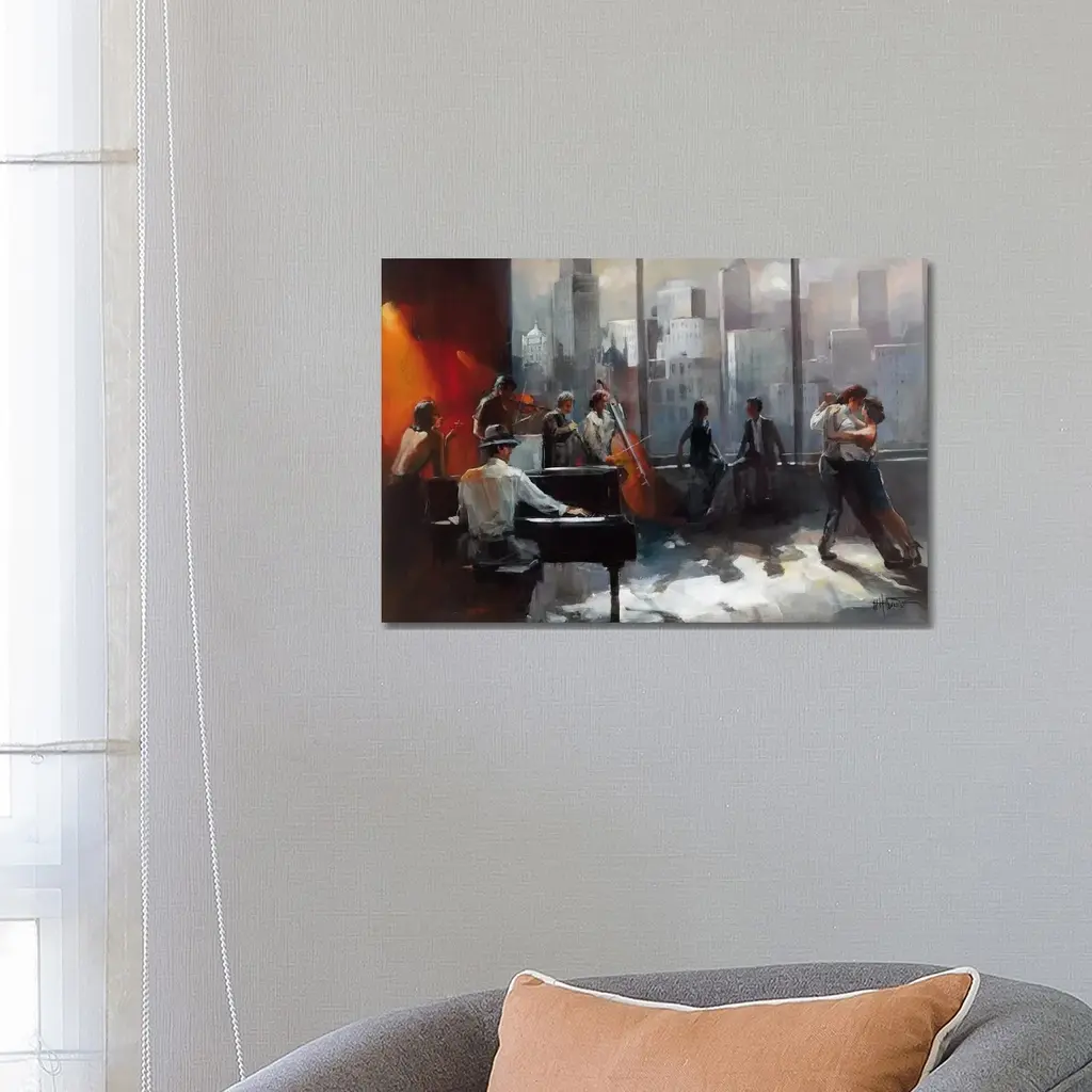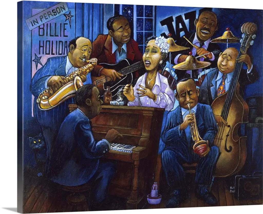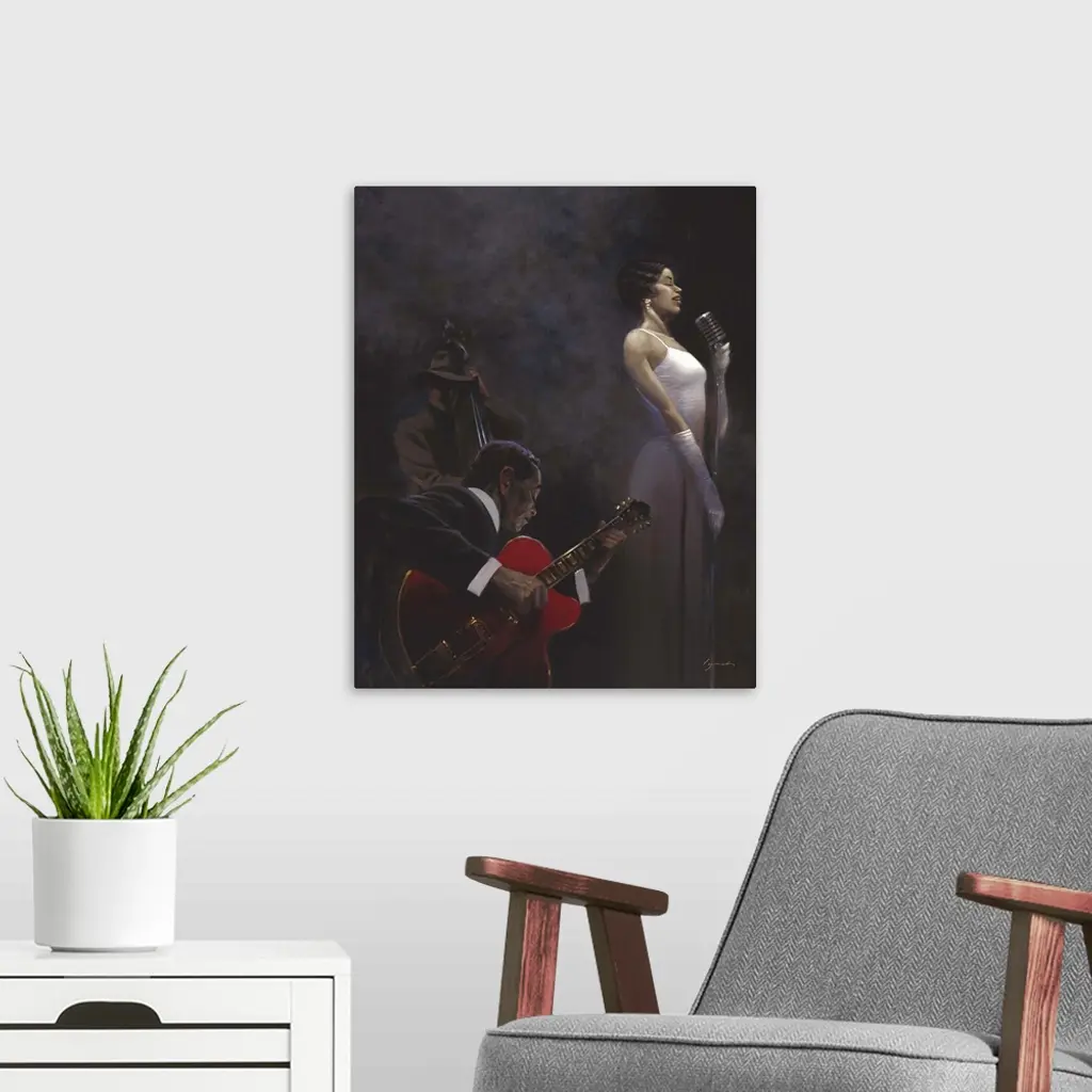 Contemporary painting of woman in a white dress standing at a microphone singing, with a jazz band playing behind her.