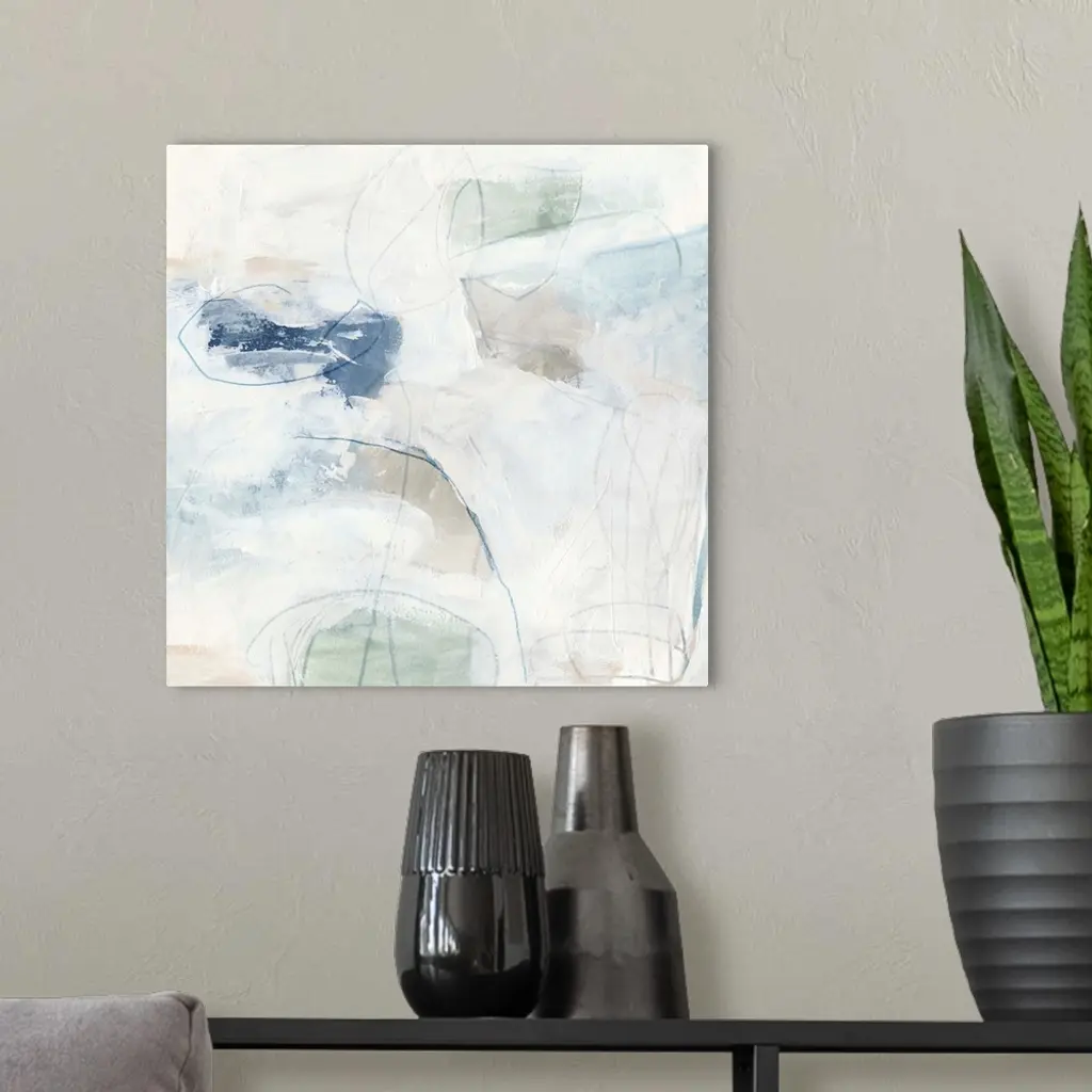 White, pale blue, and neutral browns come together to construct this abstract painting reminiscent of a calm day on the beach.