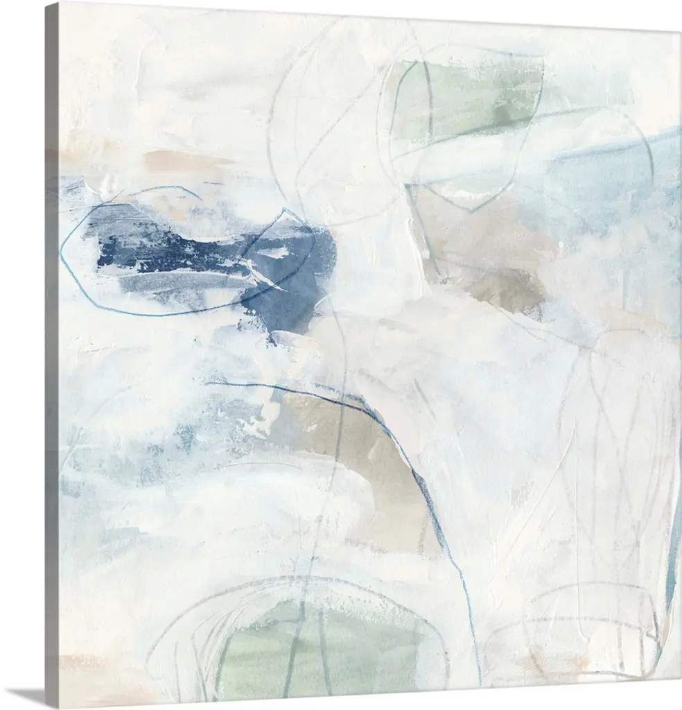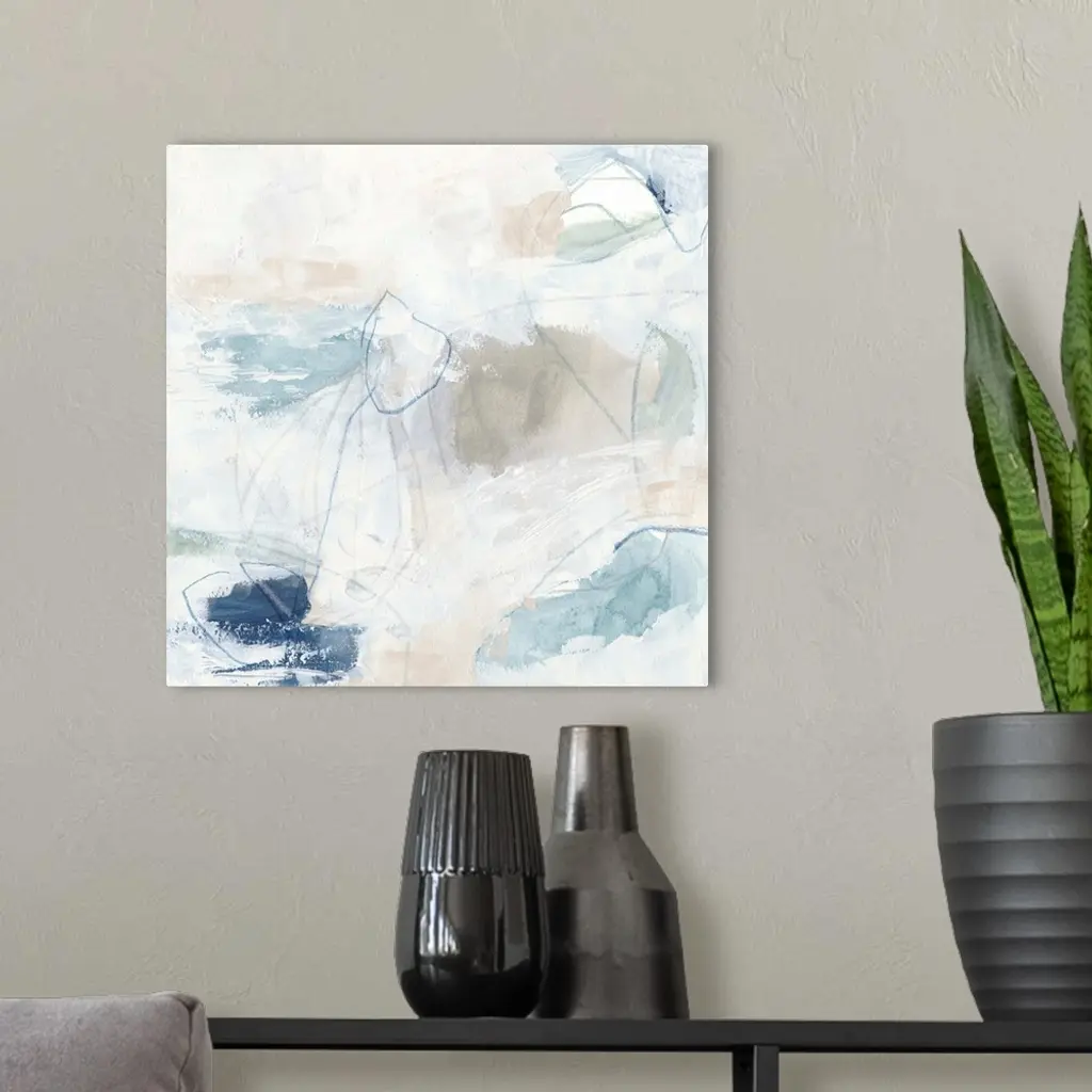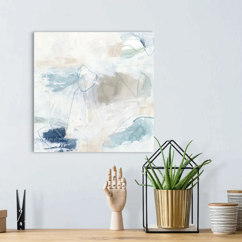 White, pale blue, and neutral browns come together to construct this abstract painting reminiscent of a calm day on the beach.