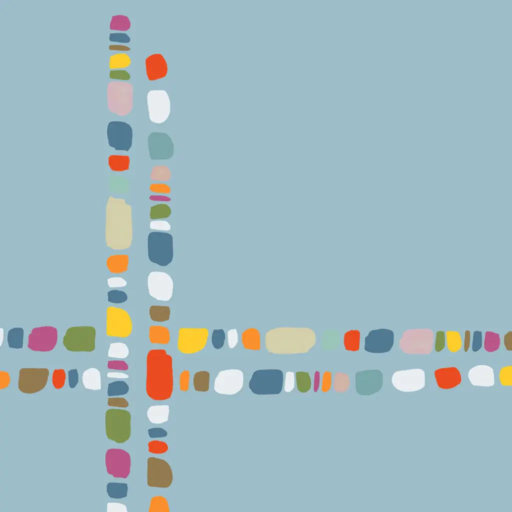 Square contemporary painting of multi-colored lines crossing in a pattern.