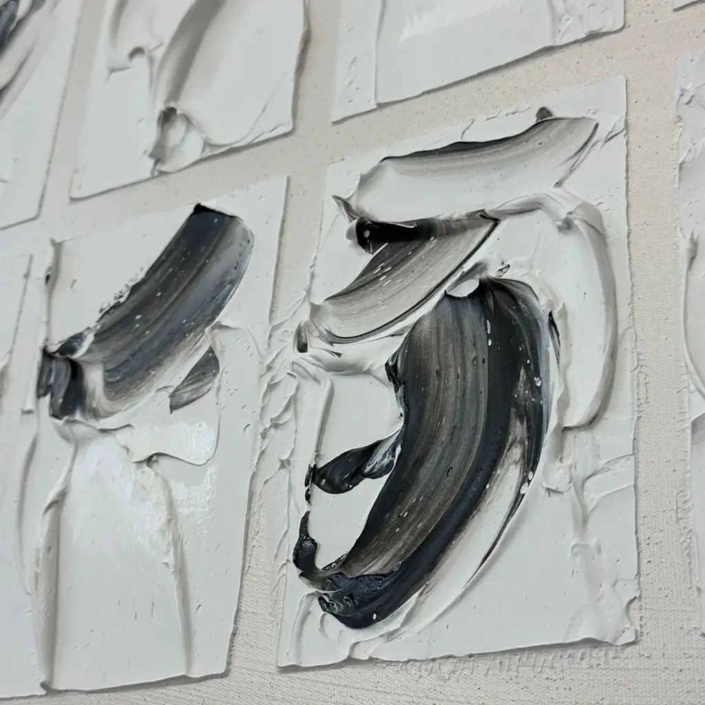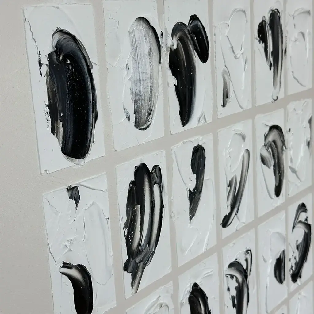 Peirce is a hand-painted abstract painting on canvas. Textural sections of contrasting black and white paint are neatly arranged in a grid on a neutral background. With a wooden inner frame and wooden frame, the painting is ready to hang.The AGAVE Quadri collection represents the excellence of contemporary art applied to the world of interior design. Each piece, hand-painted with artisanal techniques by the finest artists in collaboration with the Italian company AGAVE, combines abstract, natural, and figurative elements to create unique and refined works. These paintings transform spaces into environments of great elegance and character, perfect for interior design projects that require a distinctive and artistic touch.