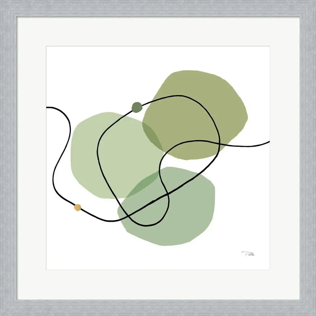 Sinuous Trajectory green III by Pela is a high quality piece of framed artwork. The finished size of this piece is 19.5" X 19.5". It has a Slim Platinum Silver frame, is single matted and finished with high quality Glass. 100% Satisfaction Guaranteed.