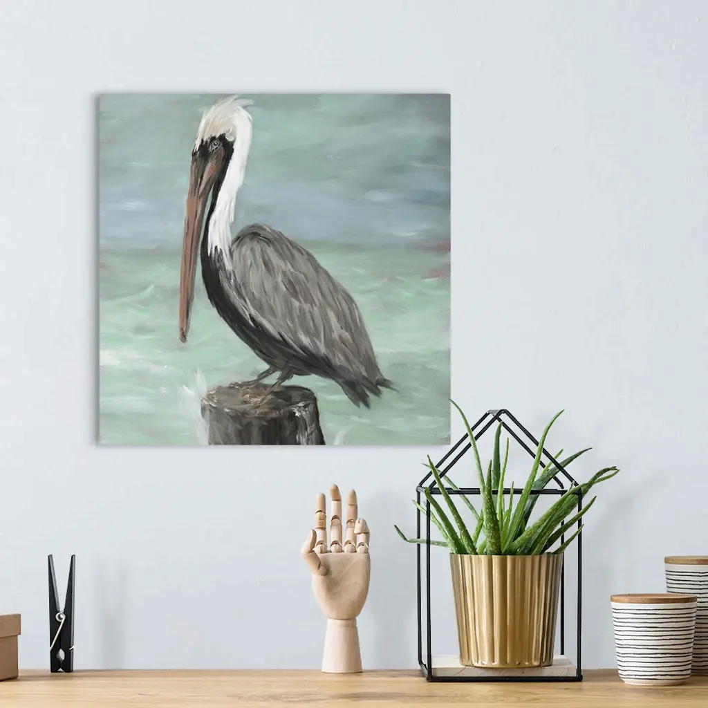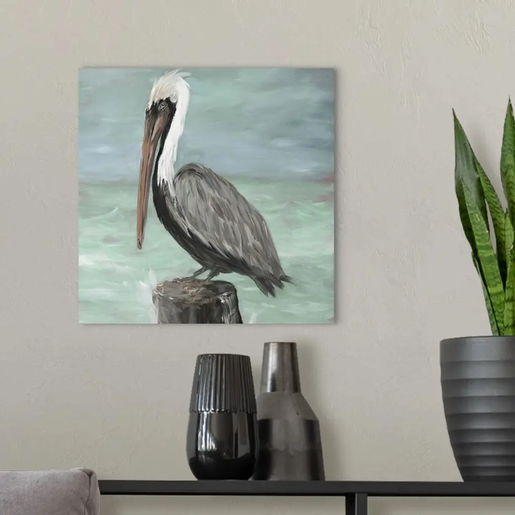 A contemporary painting of a pelican perched on a wooden stump with the ocean waves crashing into it.