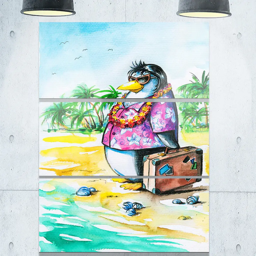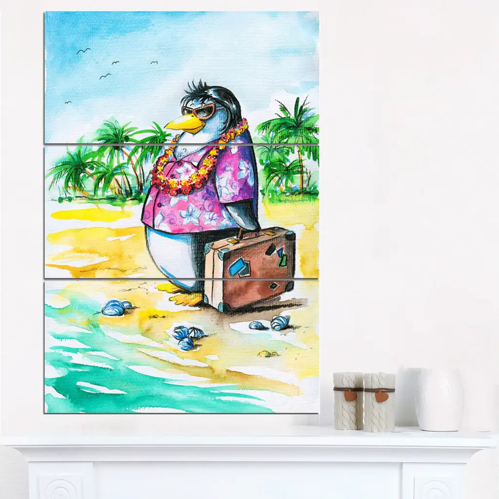"Penguin Enjoying Holidays On Beach" Cartoon Metal Wall Art, 3 Panels, 28"x36"