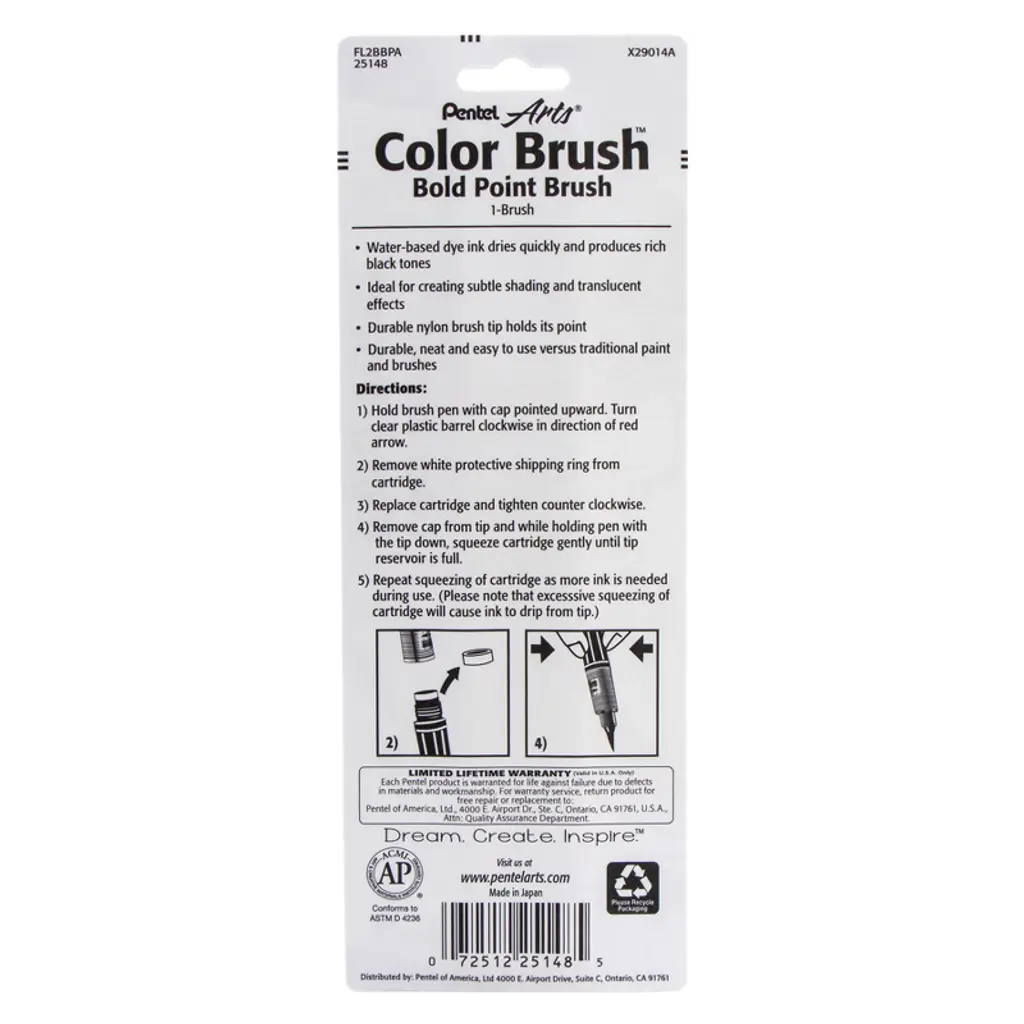 Pentel Arts Color Brush, Bold Point, Black Ink, 1 Count | Experience the vibrancy and versatility of our water-based dye ink color brush. Designed for artists who value quality and longevity in their tools, this color brush boasts a durable nylon tip that effortlessly transitions from flooding wide strokes with solid color to adding a light touch to delicate lines. The ink, rich and intense, dries quickly to prevent smudging and maintain the integrity of your artwork. The refillable barrels are not only easy to replace but also feature a reverse thread to prevent any leakage, ensuring your work remains clean and unspoiled. Whether you're working on line art or washes, the versatility of this color brush makes it an indispensable tool in your art kit.