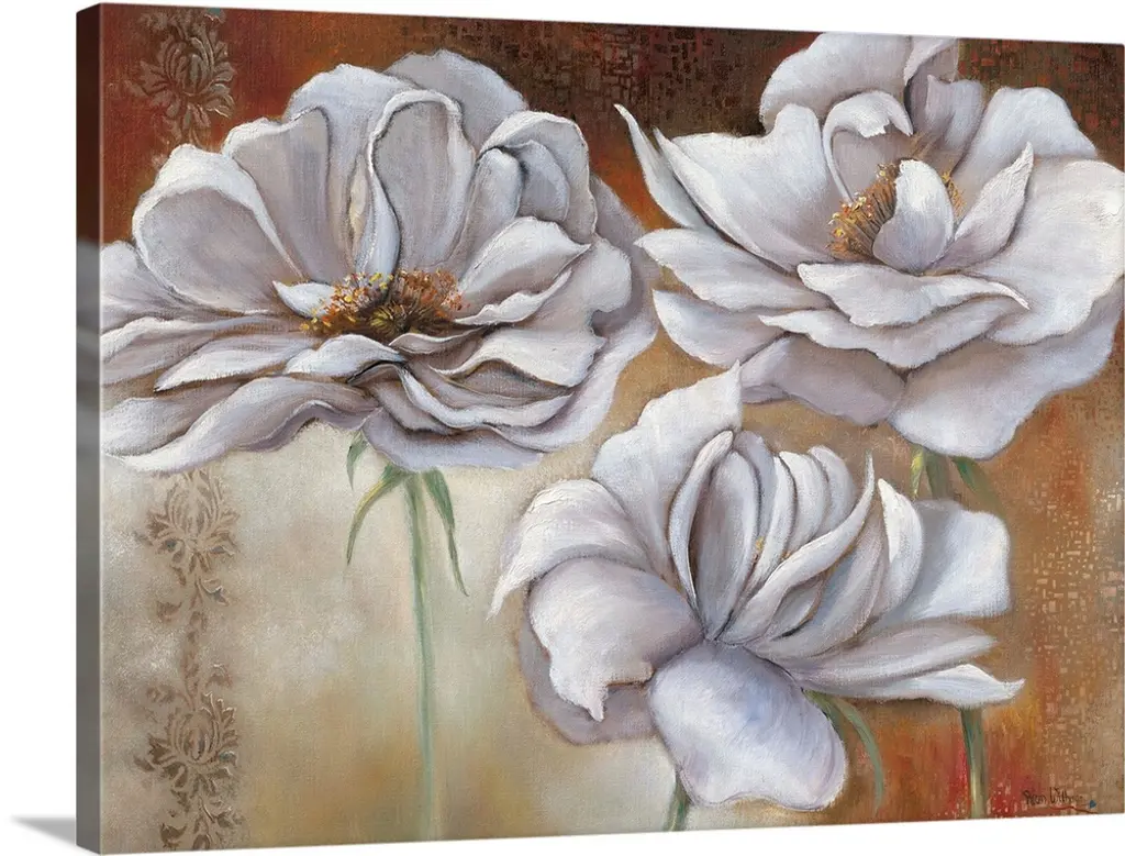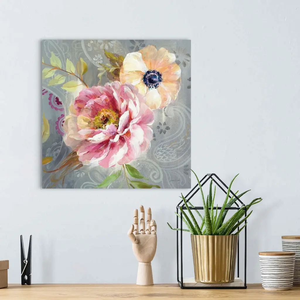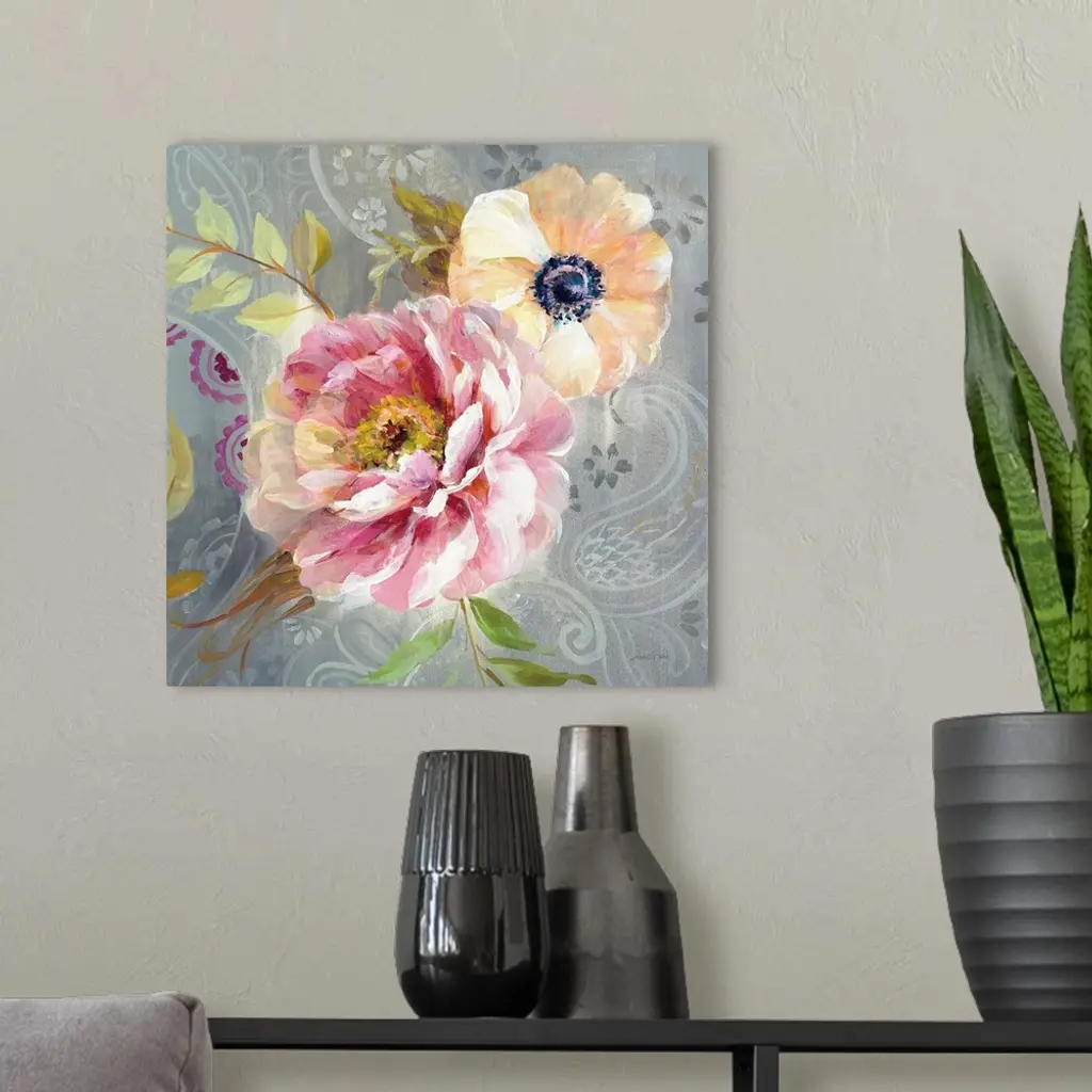 Contemporary square painting of a pink peony and yellow poppy flower on a gray paisley patterned background.