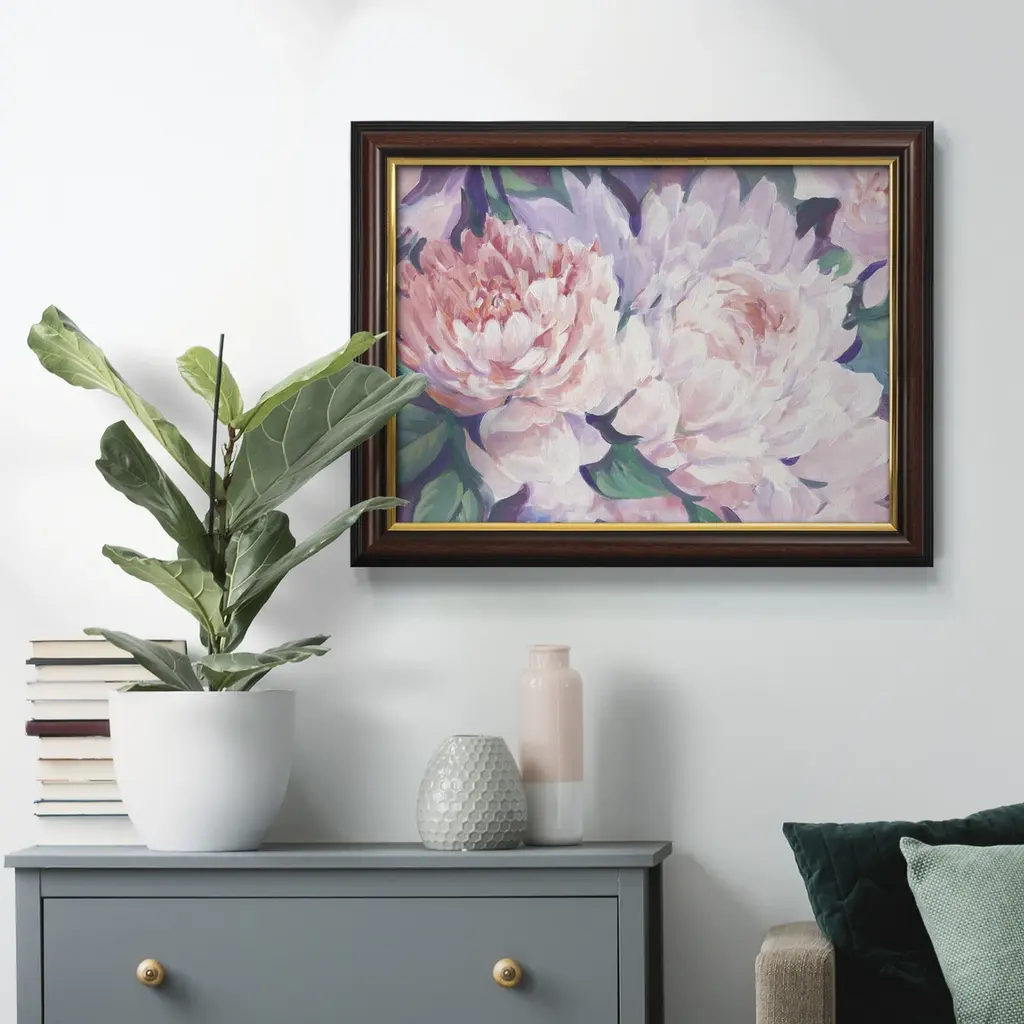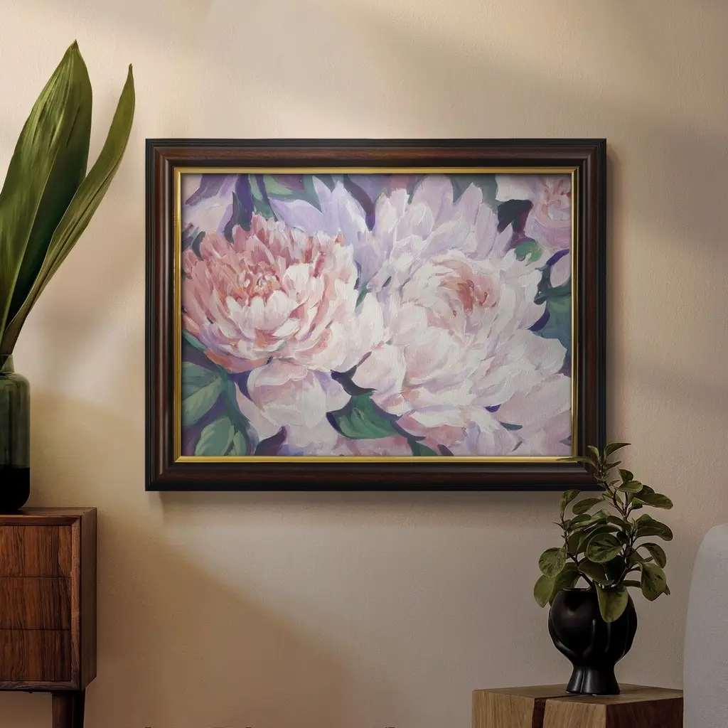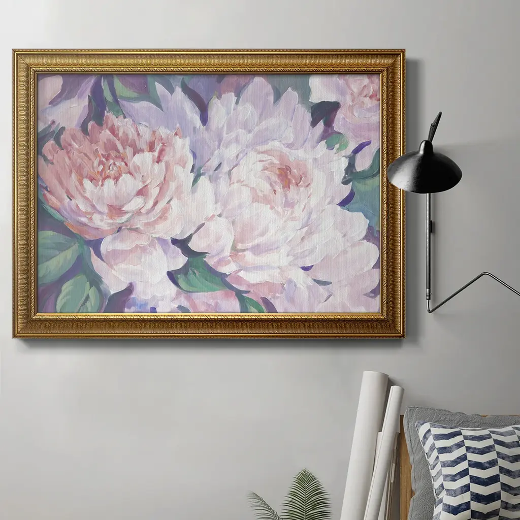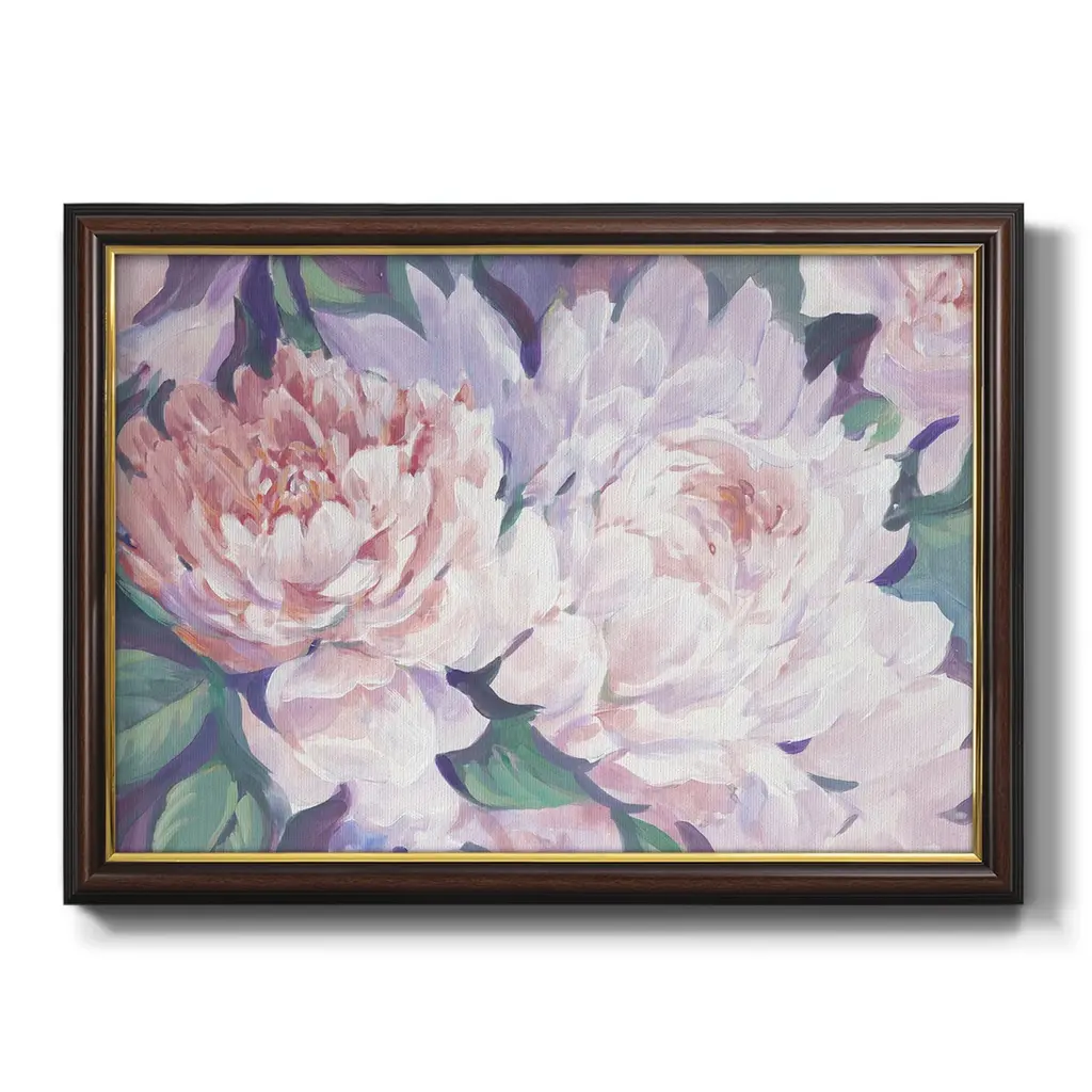Peonies in Bloom I Premium Framed Canvas- Ready to Hang A Premium Framed Canvas created to last. Framed in distressed wood and available in an array of sizes and colors Featuring a beveled a solid wood stretcher bar, each piece comes ready to hand 3 SIZES AVAILABLE 16''X20'' - Overall Size 18'X27'' - Overall Size 24''x36'' - Overall Size Each piece is made to order. Each piece comes with hanging hardware. Made in the USA Ready to Hang Giclee Paper Print Acrylic Glass Beveled Matt Board