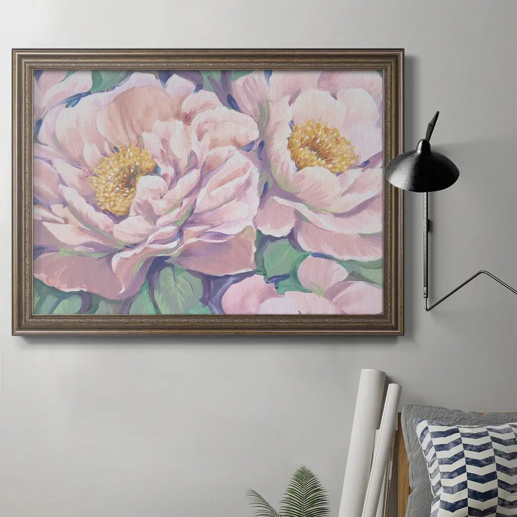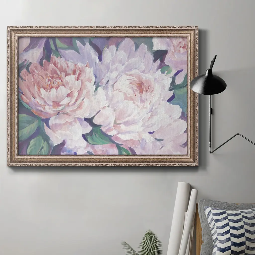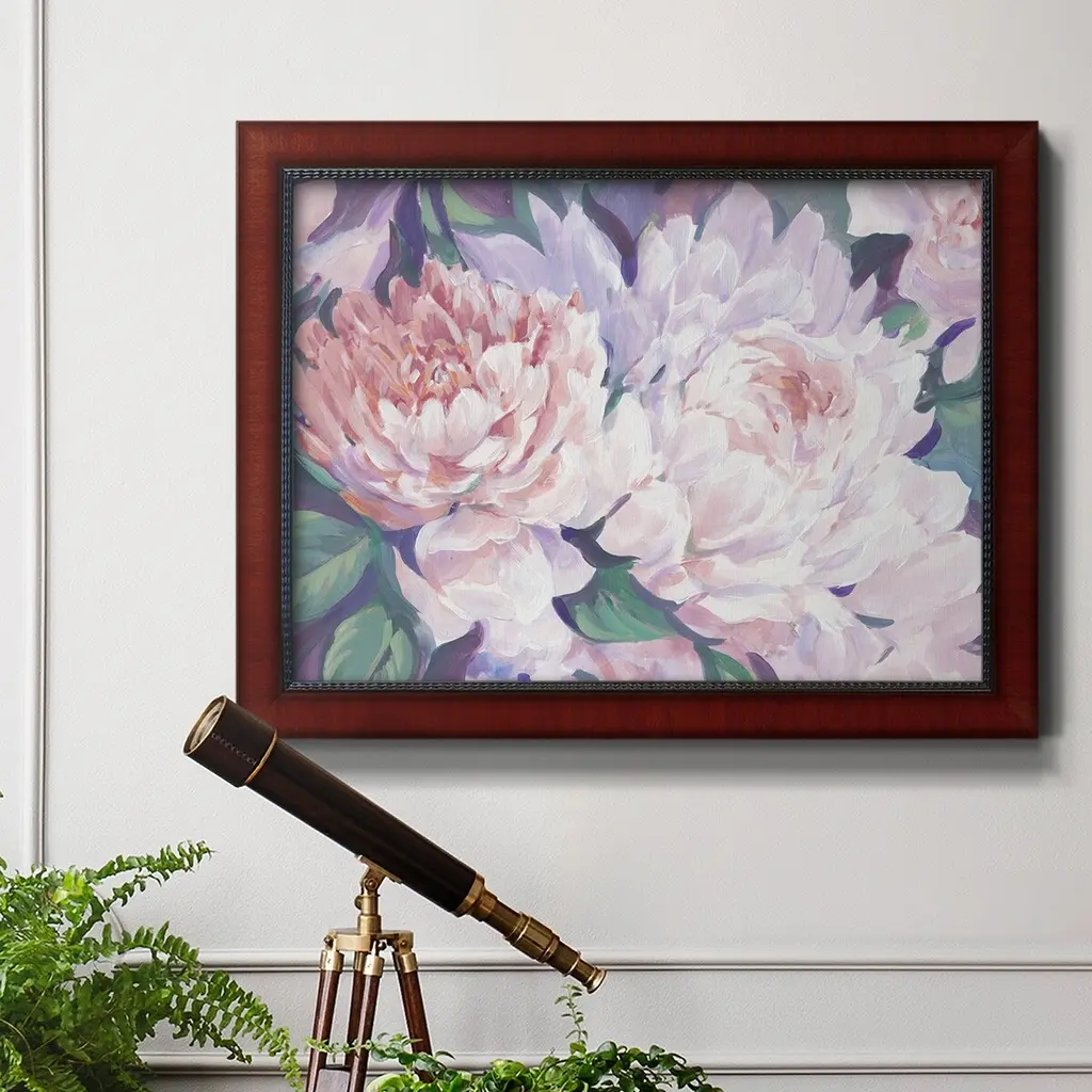 Peonies in Bloom I Premium Framed Canvas- Ready to Hang A Premium Framed Canvas created to last. Framed in distressed wood and available in an array of sizes and colors Featuring a beveled a solid wood stretcher bar, each piece comes ready to hand 3 SIZES AVAILABLE 16''X20'' - Overall Size 18'X27'' - Overall Size 24''x36'' - Overall Size Each piece is made to order. Each piece comes with hanging hardware. Made in the USA Ready to Hang Giclee Paper Print Acrylic Glass Beveled Matt Board
