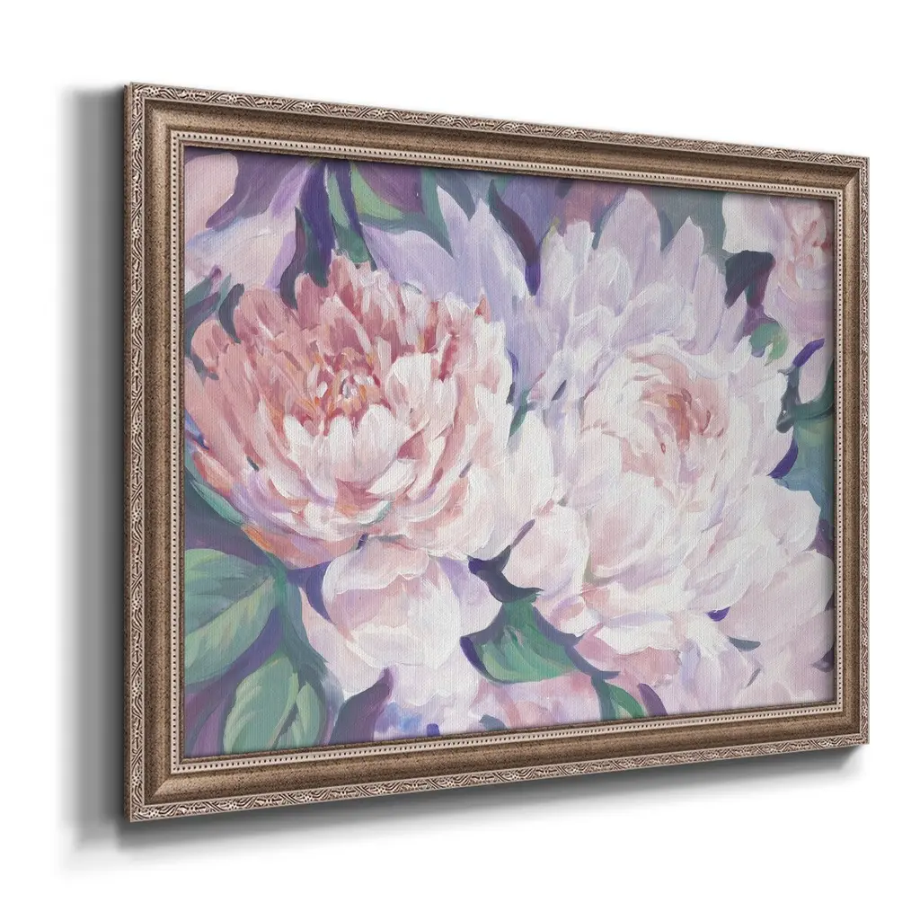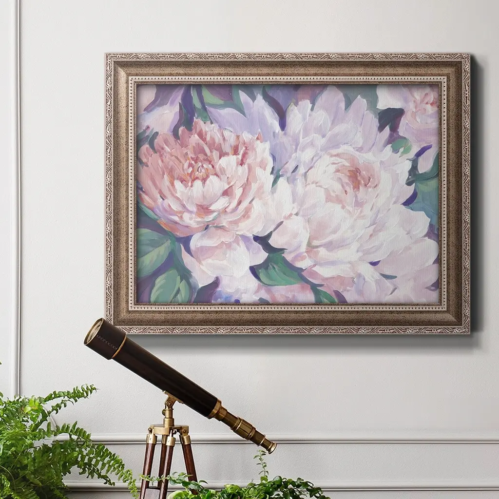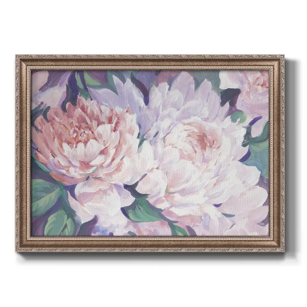 Peonies in Bloom I Premium Framed Canvas- Ready to Hang A Premium Framed Canvas created to last. Framed in distressed wood and available in an array of sizes and colors Featuring a beveled a solid wood stretcher bar, each piece comes ready to hand 3 SIZES AVAILABLE 16''X20'' - Overall Size 18'X27'' - Overall Size 24''x36'' - Overall Size Each piece is made to order. Each piece comes with hanging hardware. Made in the USA Ready to Hang Giclee Paper Print Acrylic Glass Beveled Matt Board