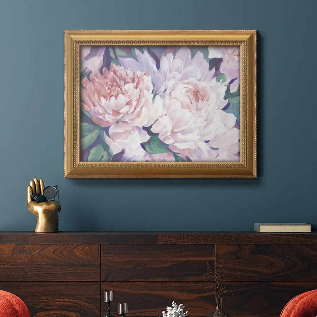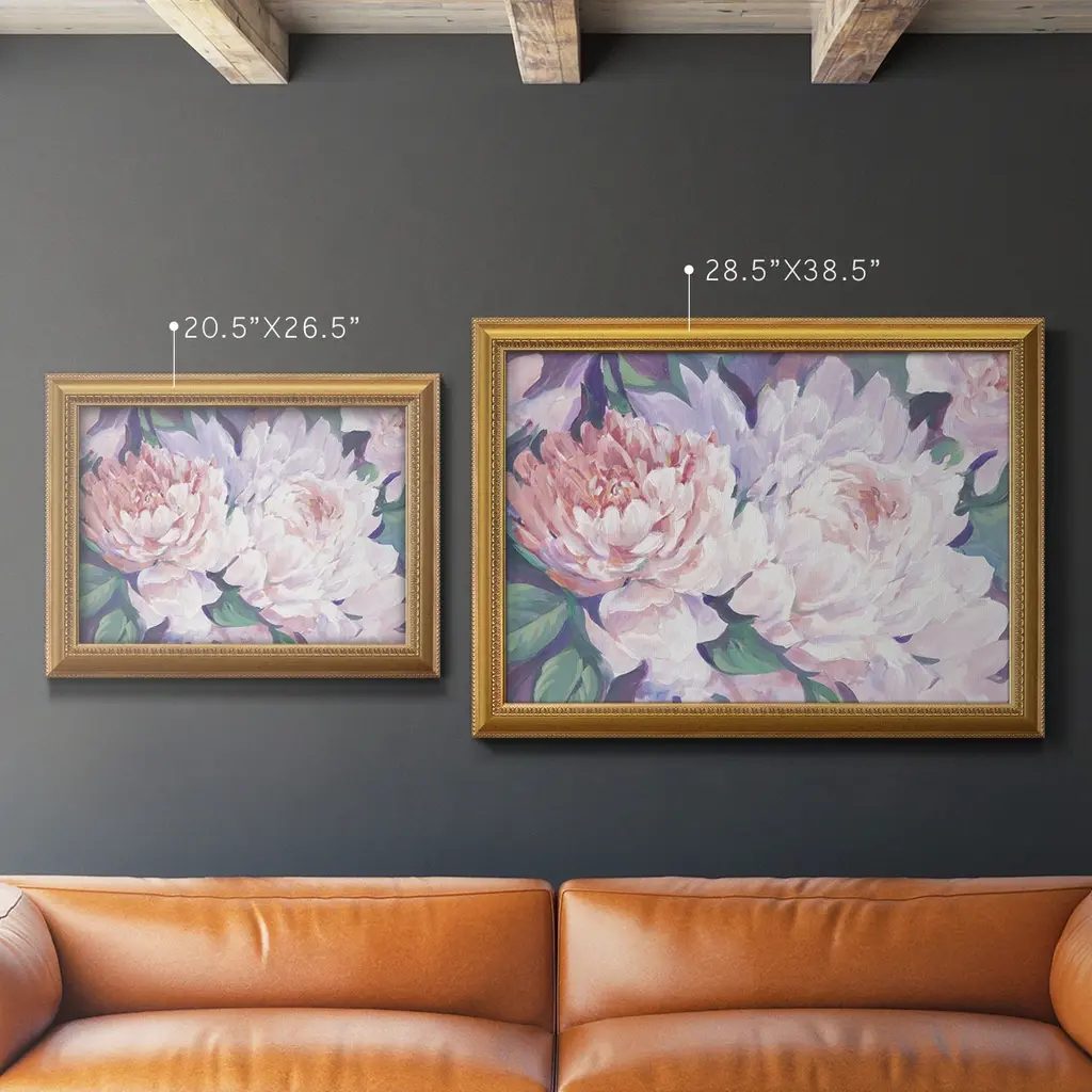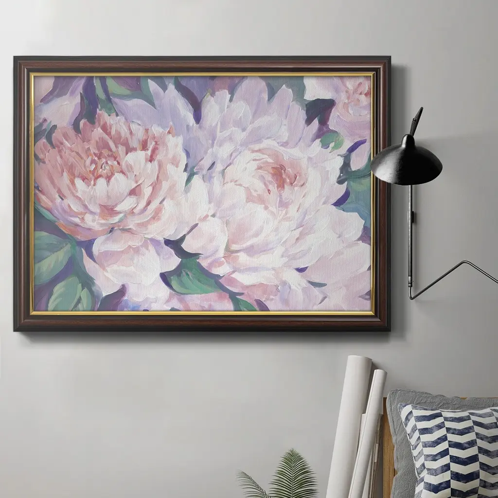 Peonies in Bloom I Premium Framed Canvas- Ready to Hang A Premium Framed Canvas created to last. Framed in distressed wood and available in an array of sizes and colors Featuring a beveled a solid wood stretcher bar, each piece comes ready to hand 3 SIZES AVAILABLE 16''X20'' - Overall Size 18'X27'' - Overall Size 24''x36'' - Overall Size Each piece is made to order. Each piece comes with hanging hardware. Made in the USA Ready to Hang Giclee Paper Print Acrylic Glass Beveled Matt Board
