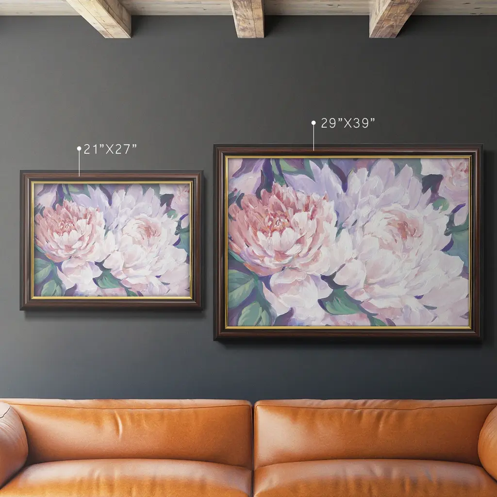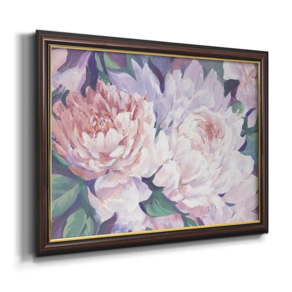 Peonies in Bloom I Premium Framed Canvas- Ready to Hang A Premium Framed Canvas created to last. Framed in distressed wood and available in an array of sizes and colors Featuring a beveled a solid wood stretcher bar, each piece comes ready to hand 3 SIZES AVAILABLE 16''X20'' - Overall Size 18'X27'' - Overall Size 24''x36'' - Overall Size Each piece is made to order. Each piece comes with hanging hardware. Made in the USA Ready to Hang Giclee Paper Print Acrylic Glass Beveled Matt Board