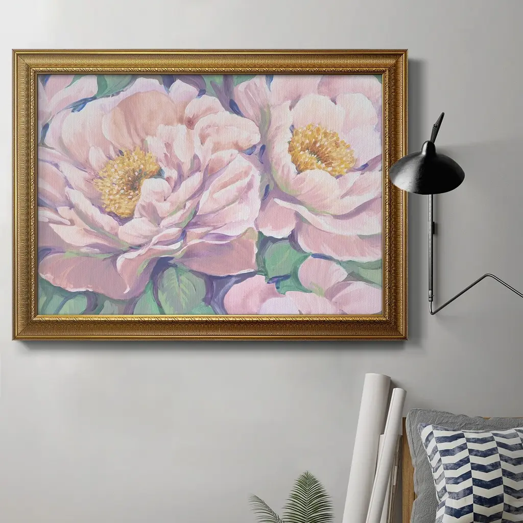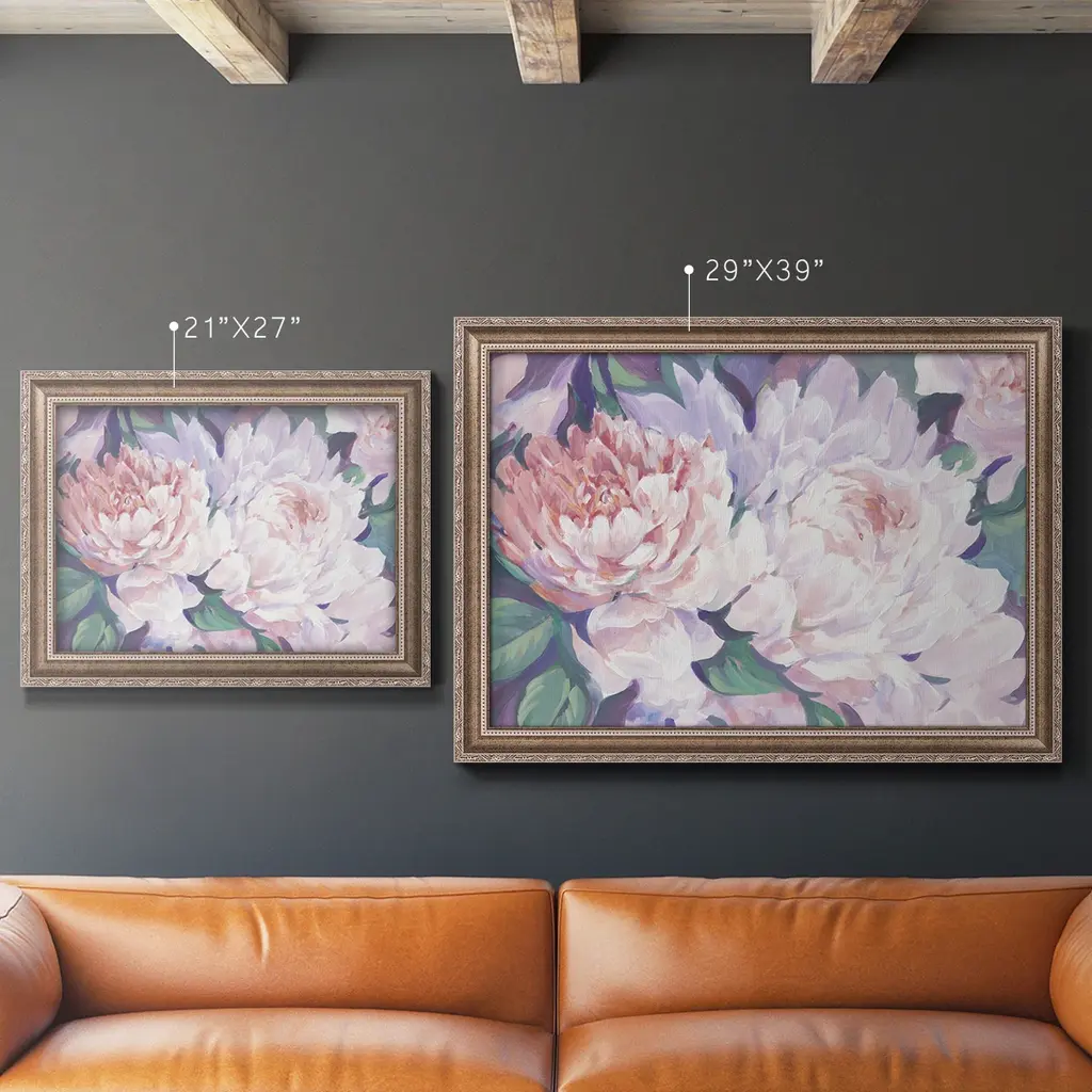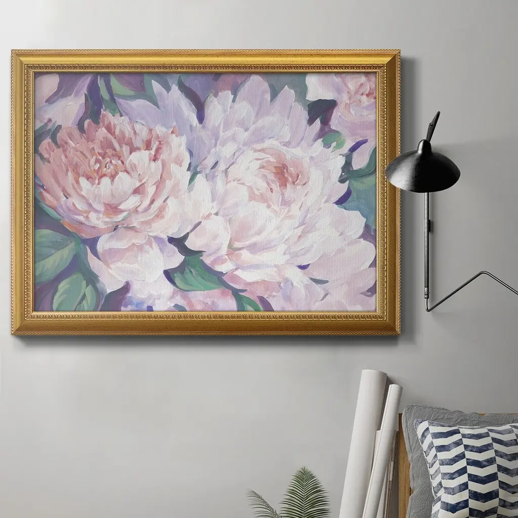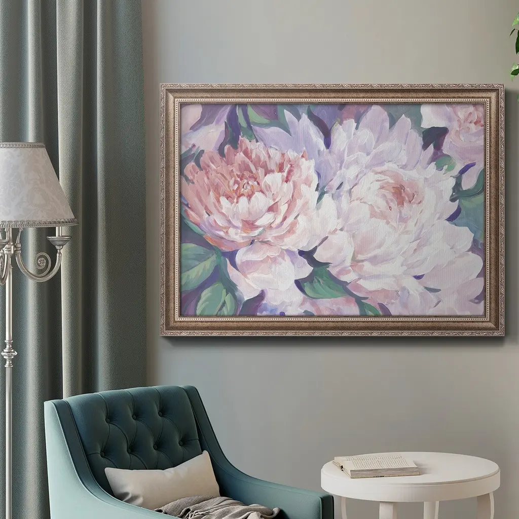 Peonies in Bloom I Premium Framed Canvas- Ready to Hang A Premium Framed Canvas created to last. Framed in distressed wood and available in an array of sizes and colors Featuring a beveled a solid wood stretcher bar, each piece comes ready to hand 3 SIZES AVAILABLE 16''X20'' - Overall Size 18'X27'' - Overall Size 24''x36'' - Overall Size Each piece is made to order. Each piece comes with hanging hardware. Made in the USA Ready to Hang Giclee Paper Print Acrylic Glass Beveled Matt Board