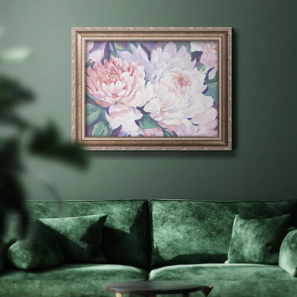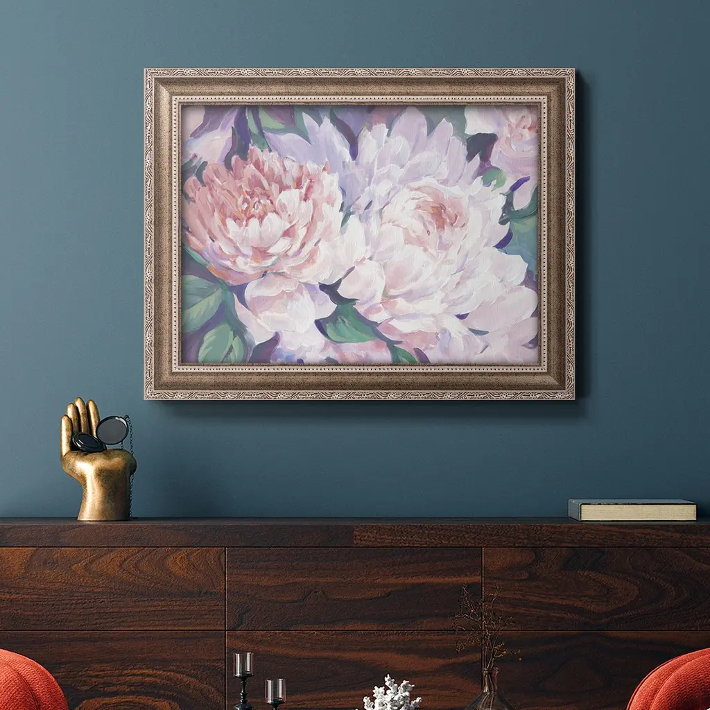 Peonies in Bloom I Premium Framed Canvas- Ready to Hang A Premium Framed Canvas created to last. Framed in distressed wood and available in an array of sizes and colors Featuring a beveled a solid wood stretcher bar, each piece comes ready to hand 3 SIZES AVAILABLE 16''X20'' - Overall Size 18'X27'' - Overall Size 24''x36'' - Overall Size Each piece is made to order. Each piece comes with hanging hardware. Made in the USA Ready to Hang Giclee Paper Print Acrylic Glass Beveled Matt Board
