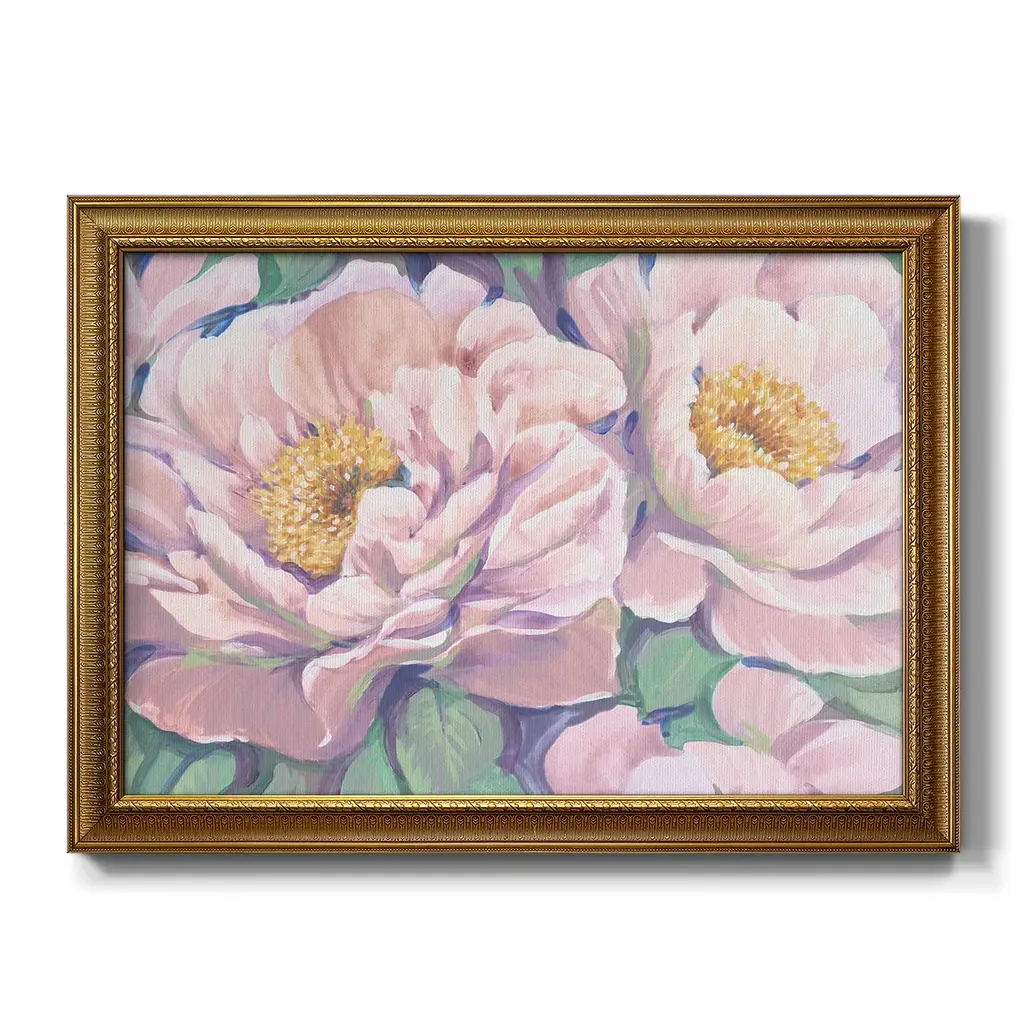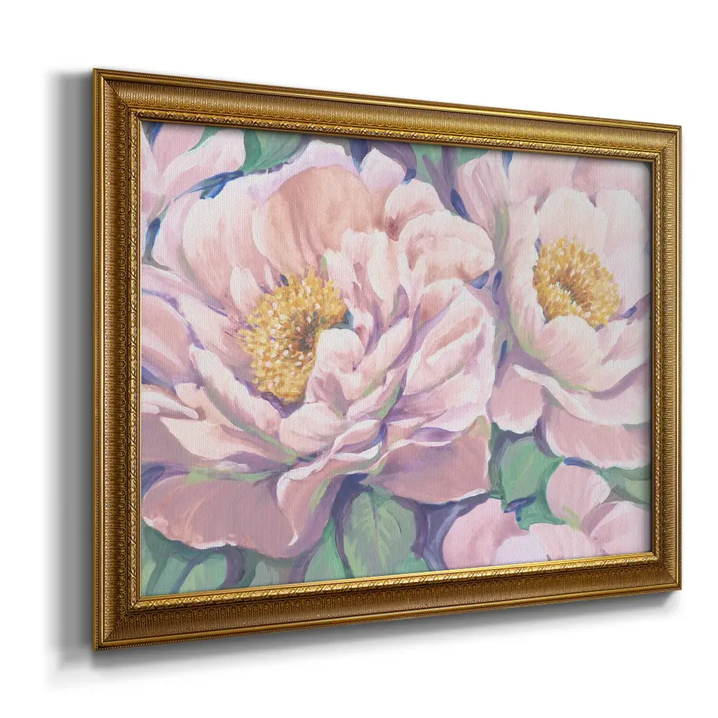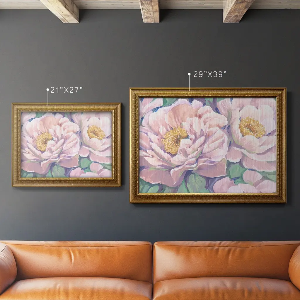 Peonies in Bloom II Premium Framed Canvas- Ready to Hang A Premium Framed Canvas created to last. Framed in distressed wood and available in an array of sizes and colors Featuring a beveled a solid wood stretcher bar, each piece comes ready to hand 3 SIZES AVAILABLE 16''X20'' - Overall Size 18'X27'' - Overall Size 24''x36'' - Overall Size Each piece is made to order. Each piece comes with hanging hardware. Made in the USA Ready to Hang Giclee Paper Print Acrylic Glass Beveled Matt Board