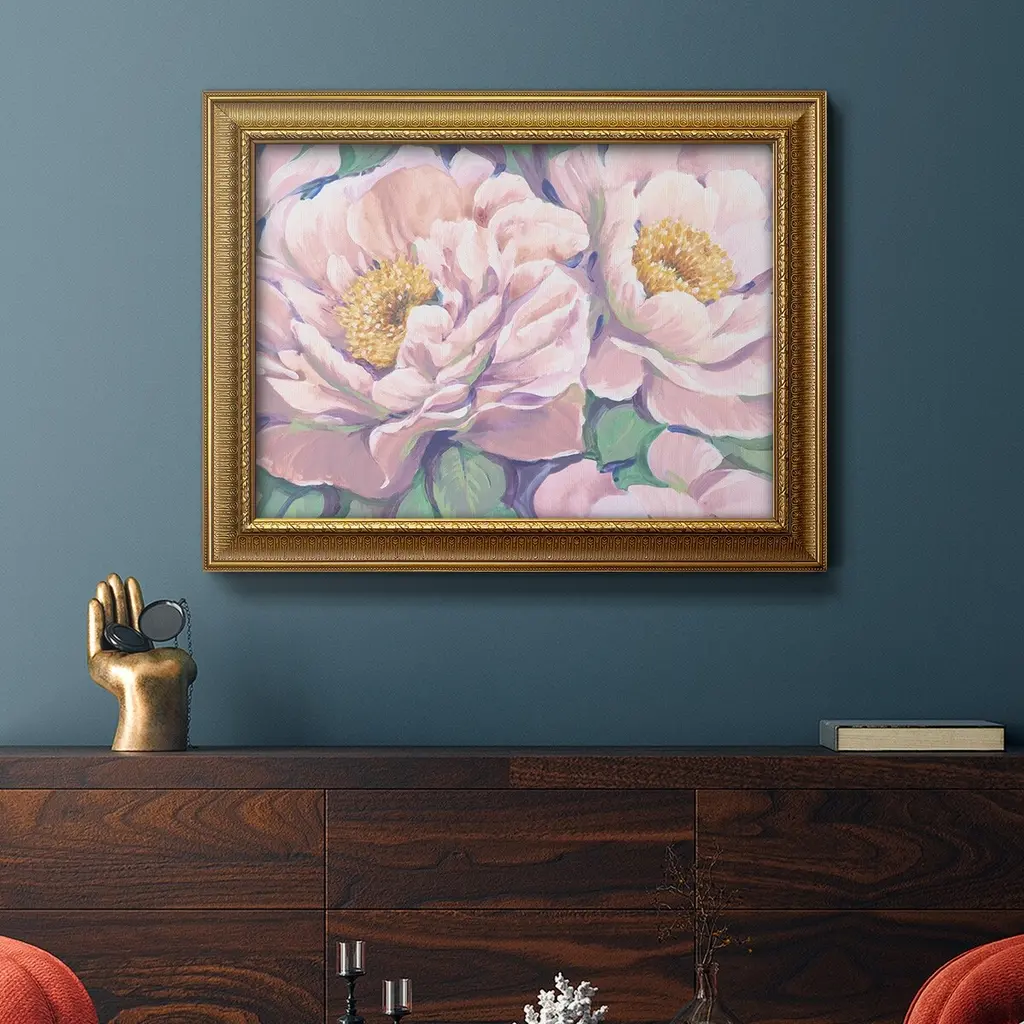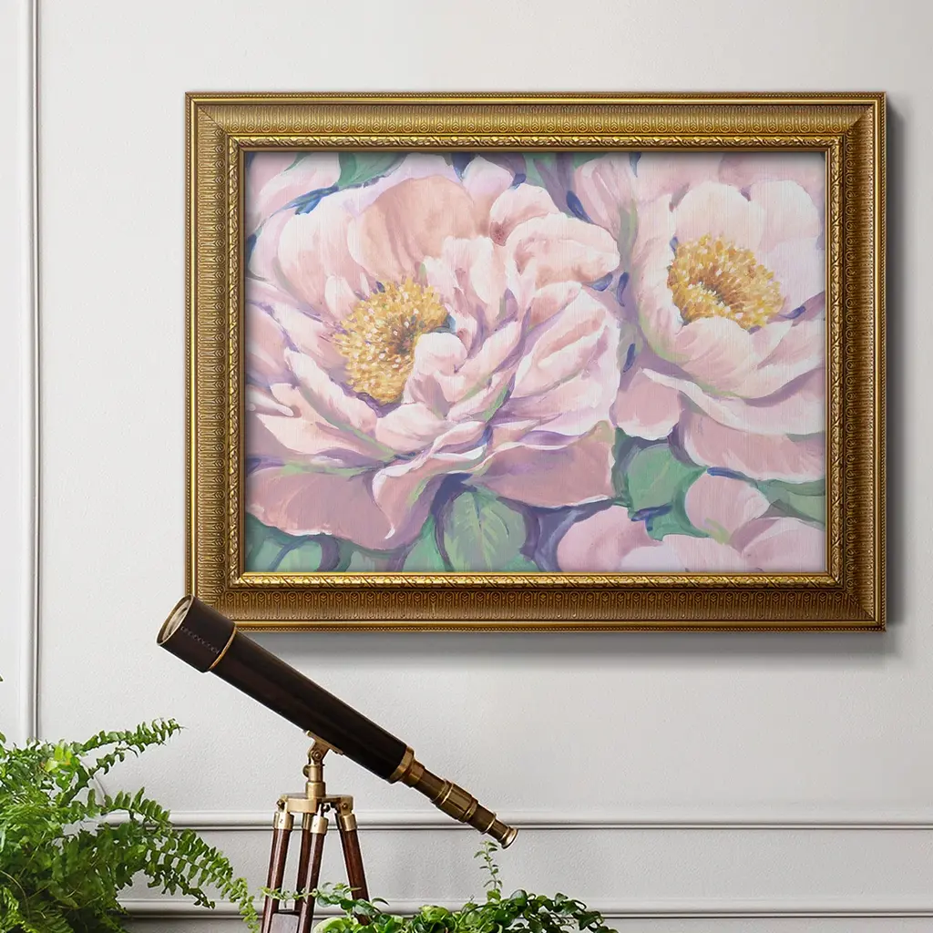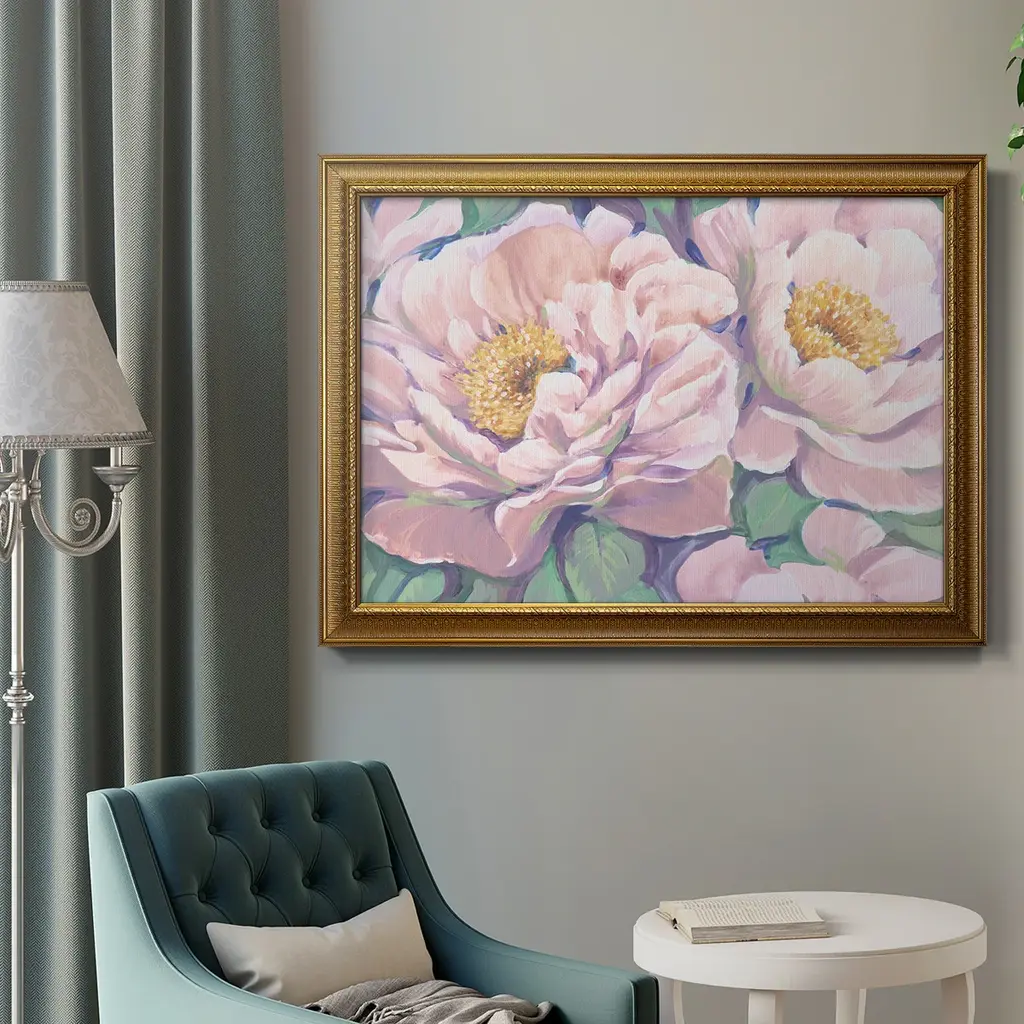 Peonies in Bloom II Premium Framed Canvas- Ready to Hang A Premium Framed Canvas created to last. Framed in distressed wood and available in an array of sizes and colors Featuring a beveled a solid wood stretcher bar, each piece comes ready to hand 3 SIZES AVAILABLE 16''X20'' - Overall Size 18'X27'' - Overall Size 24''x36'' - Overall Size Each piece is made to order. Each piece comes with hanging hardware. Made in the USA Ready to Hang Giclee Paper Print Acrylic Glass Beveled Matt Board
