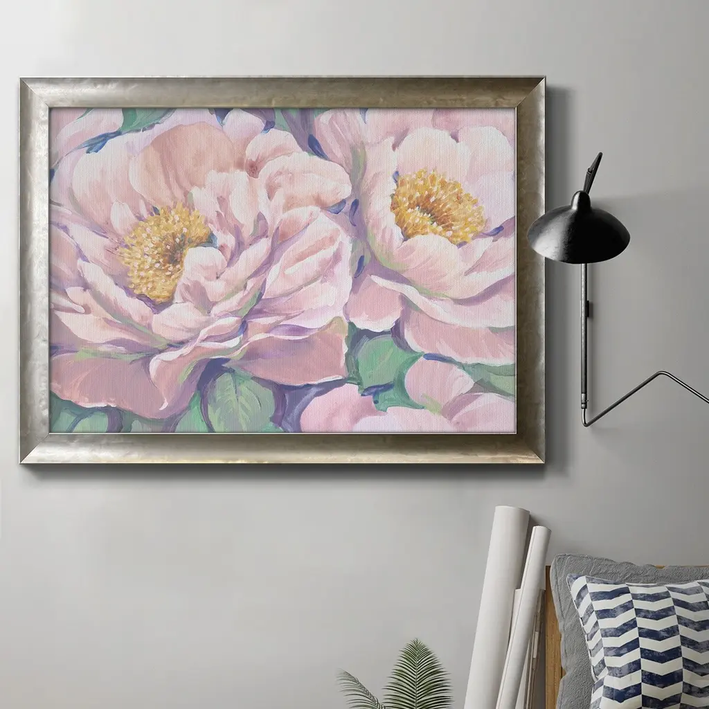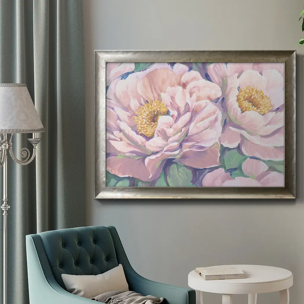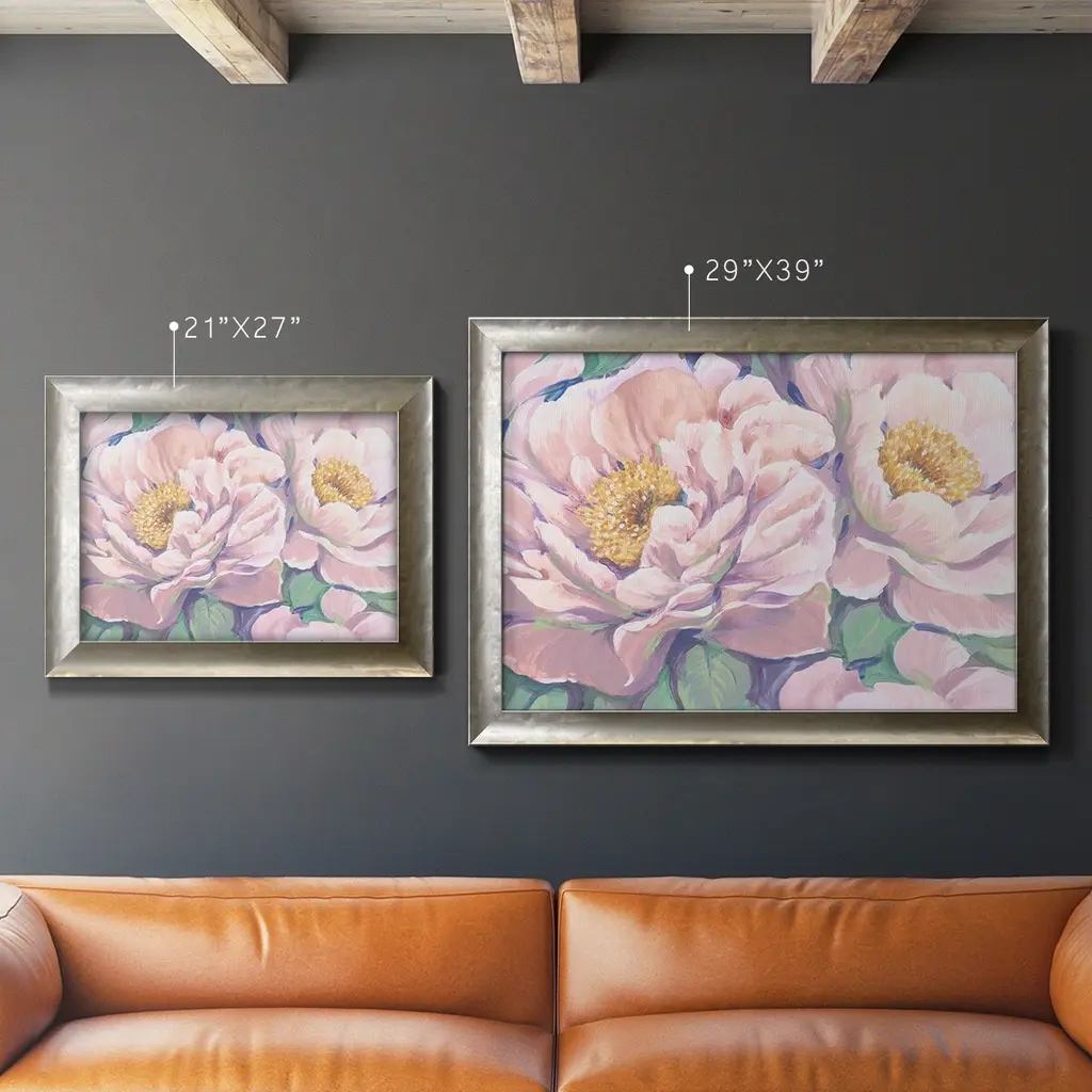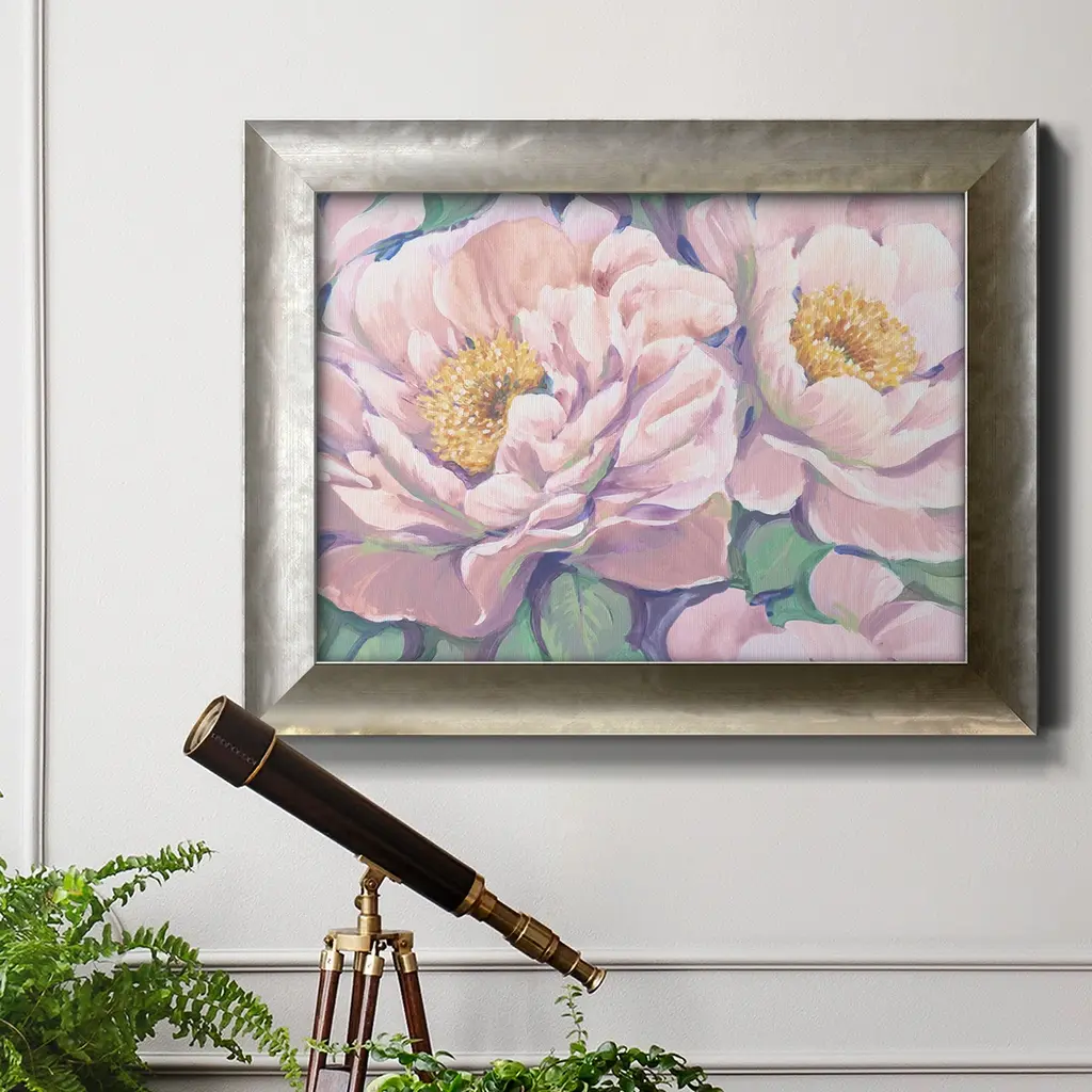 Peonies in Bloom II Premium Framed Canvas- Ready to Hang A Premium Framed Canvas created to last. Framed in distressed wood and available in an array of sizes and colors Featuring a beveled a solid wood stretcher bar, each piece comes ready to hand 3 SIZES AVAILABLE 16''X20'' - Overall Size 18'X27'' - Overall Size 24''x36'' - Overall Size Each piece is made to order. Each piece comes with hanging hardware. Made in the USA Ready to Hang Giclee Paper Print Acrylic Glass Beveled Matt Board