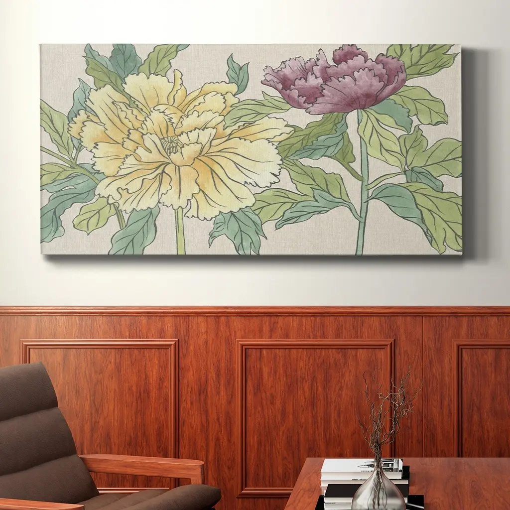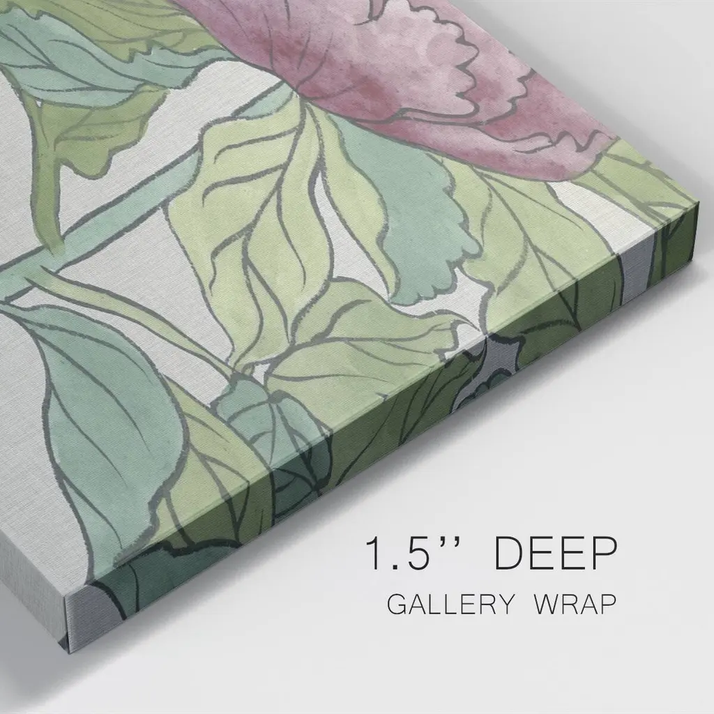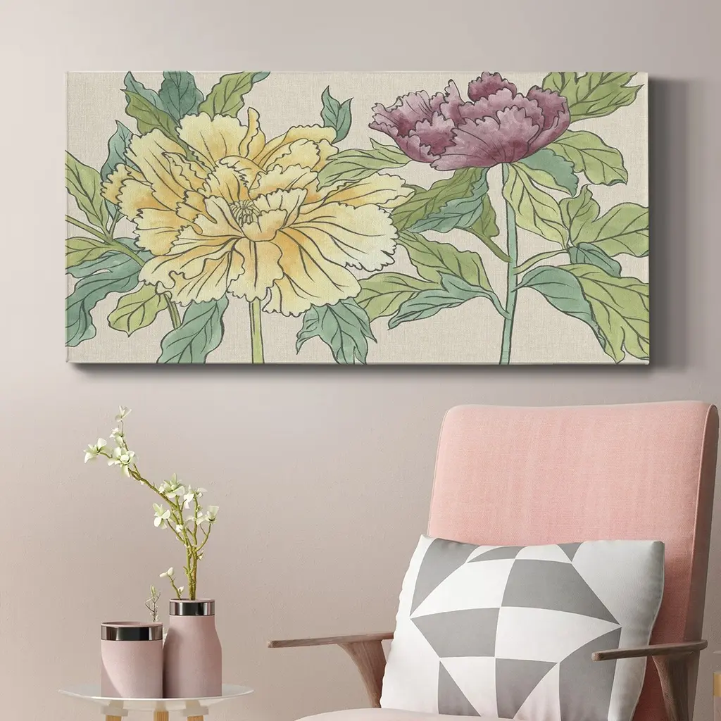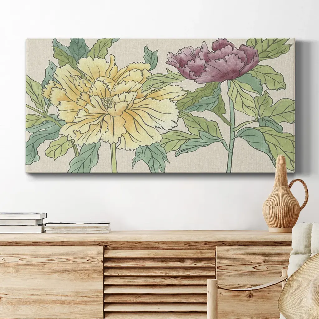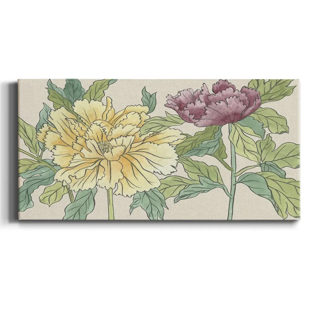 Peony Blooms II- Premium Gallery Wrapped Canvas - Ready to Hang A premium hand stretched gallery wrapped canvas print created to last. Featuring a beveled a solid wood stretcher bar, each piece comes ready to hand 3 SIZES AVAILABLE 8''X16'' - Overall Size 12"X24'' - Overall Size 20''x40'' - Overall Size Each piece is made to order. Built to Last Each piece comes ready to hang Solid wood stretcher Fade and Water resistant Made domestically