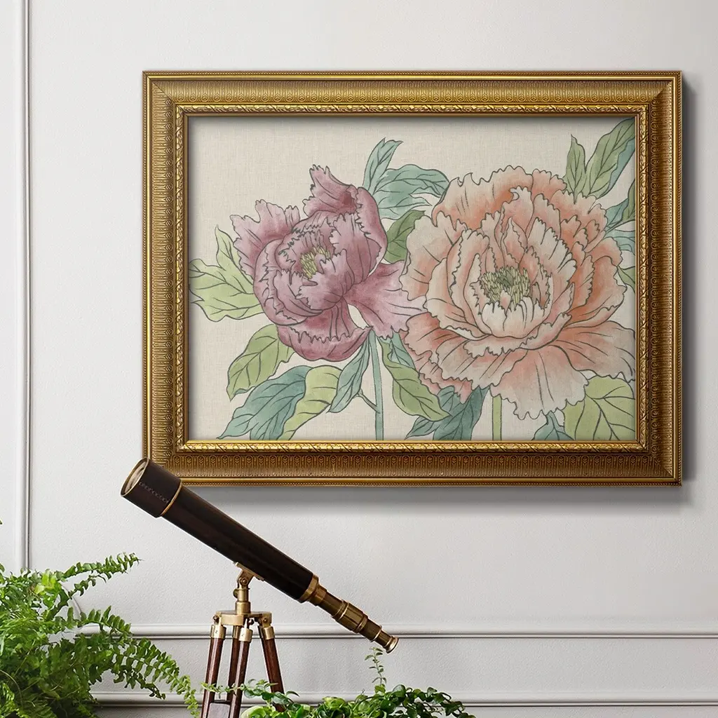 Peony Blooms IV Premium Framed Canvas- Ready to Hang A Premium Framed Canvas created to last. Framed in distressed wood and available in an array of sizes and colors Featuring a beveled a solid wood stretcher bar, each piece comes ready to hand 3 SIZES AVAILABLE 16''X20'' - Overall Size 18'X27'' - Overall Size 24''x36'' - Overall Size Each piece is made to order. Each piece comes with hanging hardware. Made in the USA Ready to Hang Giclee Paper Print Acrylic Glass Beveled Matt Board