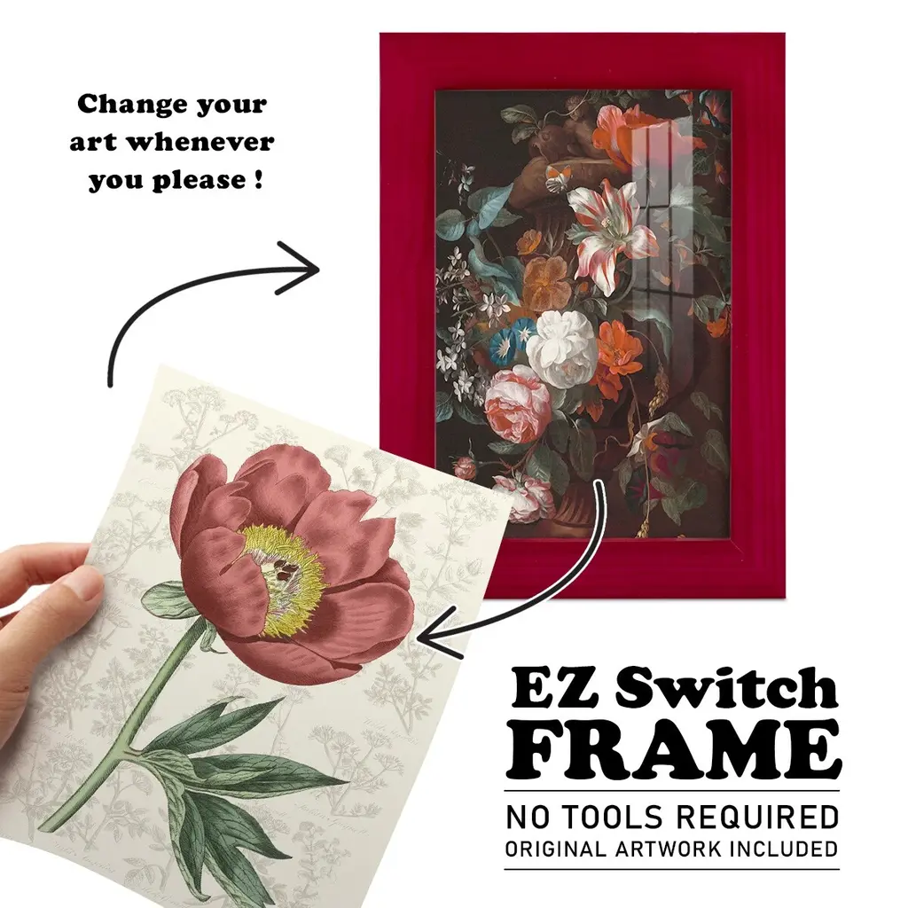 Peony Flower Garden III -EZ SWITCH Framed Print w/glass-Cherry Red A delightful, framed print. Featuring a solid wood frame with real wood glass. This premium print is giclee quality. In addition, every frame features a removable back and table top stand. This allows you to change your art in the future or to just stand the art on a table for a new look. We are sure you'll enjoy our new series of EZ SWITCH Framed Art. Solid Wood Frame Real Glass Removable / Replaceable Art Built in Tabletop Stand Sizes range from 4x6 up to 12x15 - buy just one or pair them up as sets as you see fit.