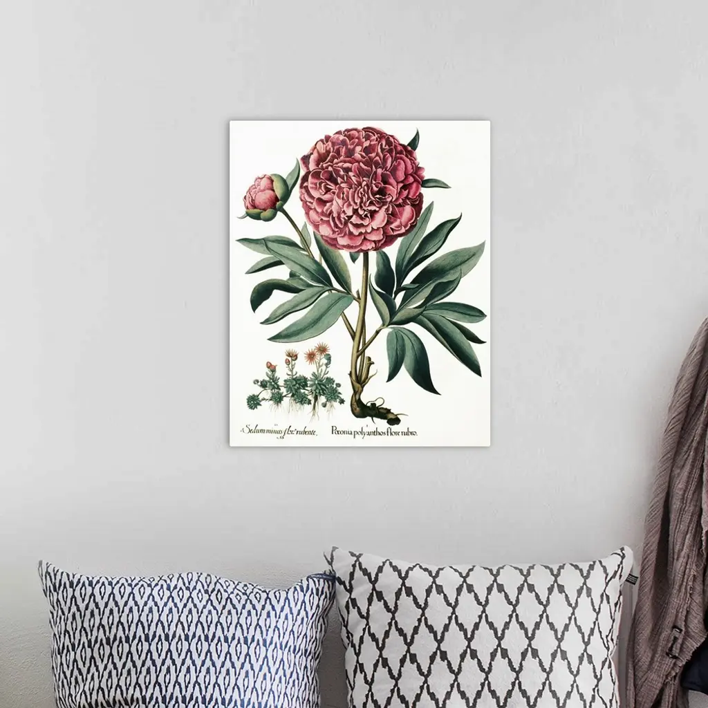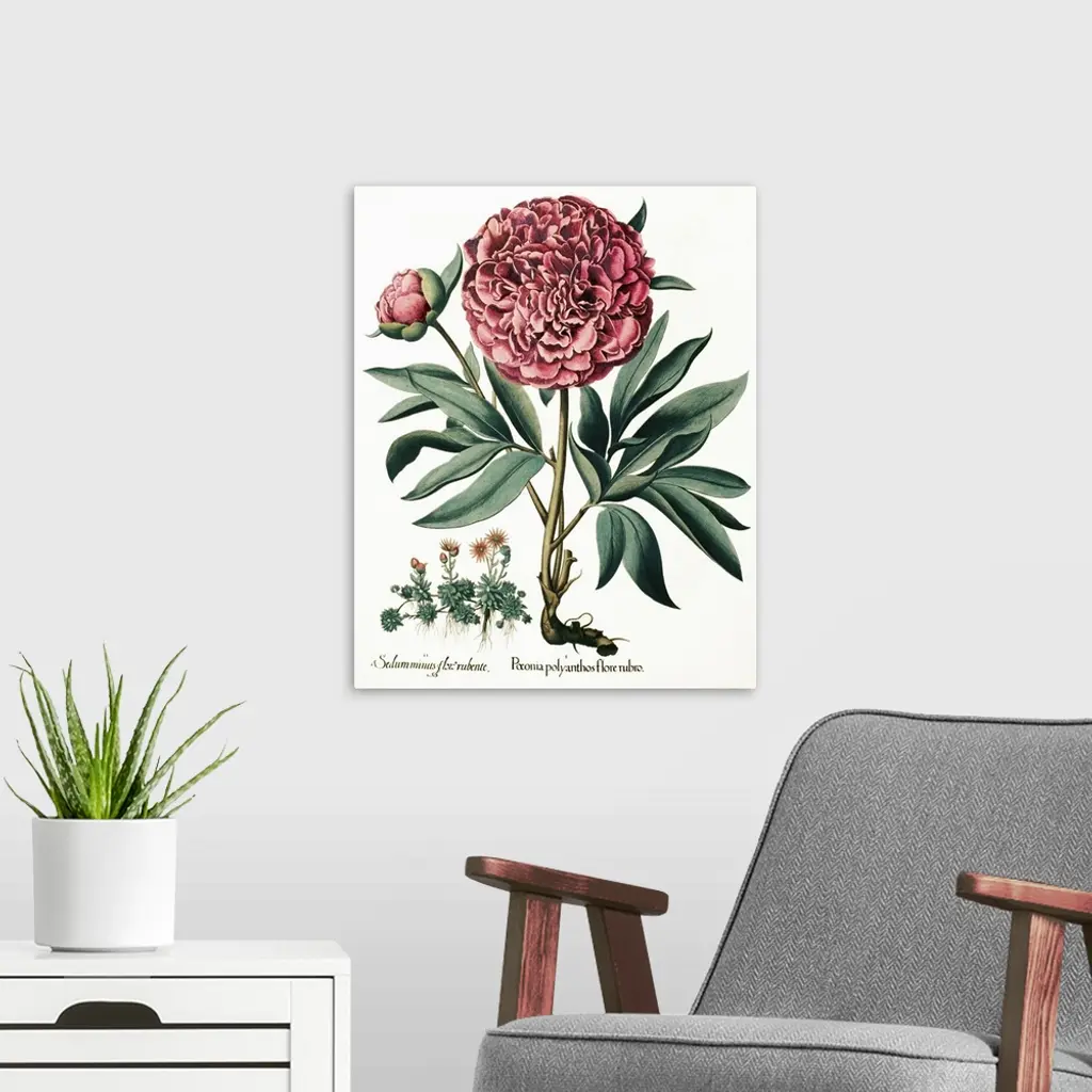Peony flowers. 17th century artwork of two peony (Paeonia sp.) flowers (red) and stonecrop flowers (Sedum sp., lower left). Peonies are used as a sedative in herbal medicine, while stonecrops are used to reduce high blood pressure. Artwork from Basilius Besler's Hortus Eystettensis (1613). This book illustrated over 1000 flowers, attempted an early pre-Linnaeus taxonomy and was the largest and most comprehensive work of its time.
