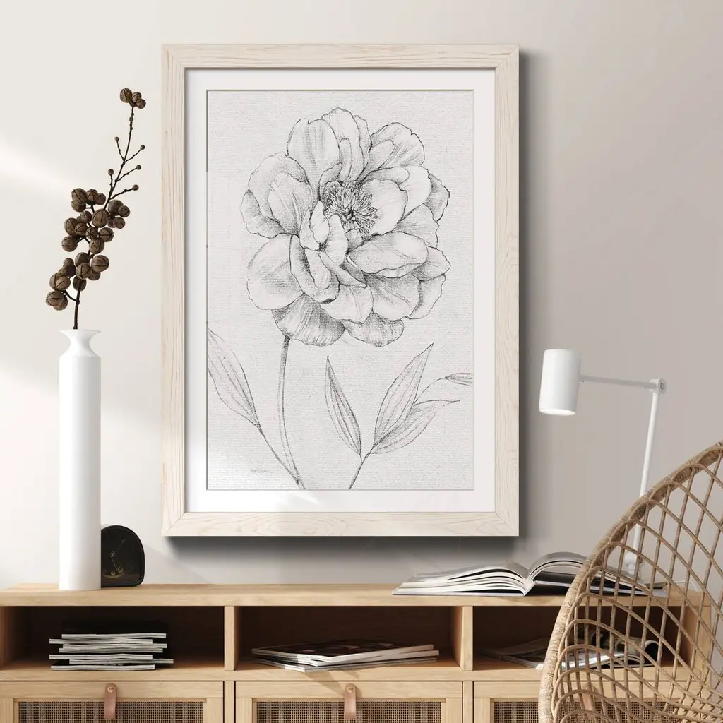 Peony Sketch-Premium Framed Print - Ready to Hang Framed in distressed wood and available in an array of sizes and colors Each piece is joined and assembled by hand and comes ready to hang 2 INCH BEVELED MATTE BOARD PLEXIGLASS COVERING READY TO HANG MADE IN THE USA SOLID WOOD FRAME MADE IN USA FADE RESISTANT GICLEE PRINTING on Canvas or Paper