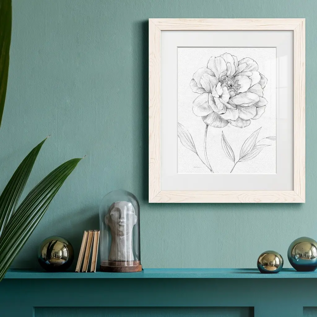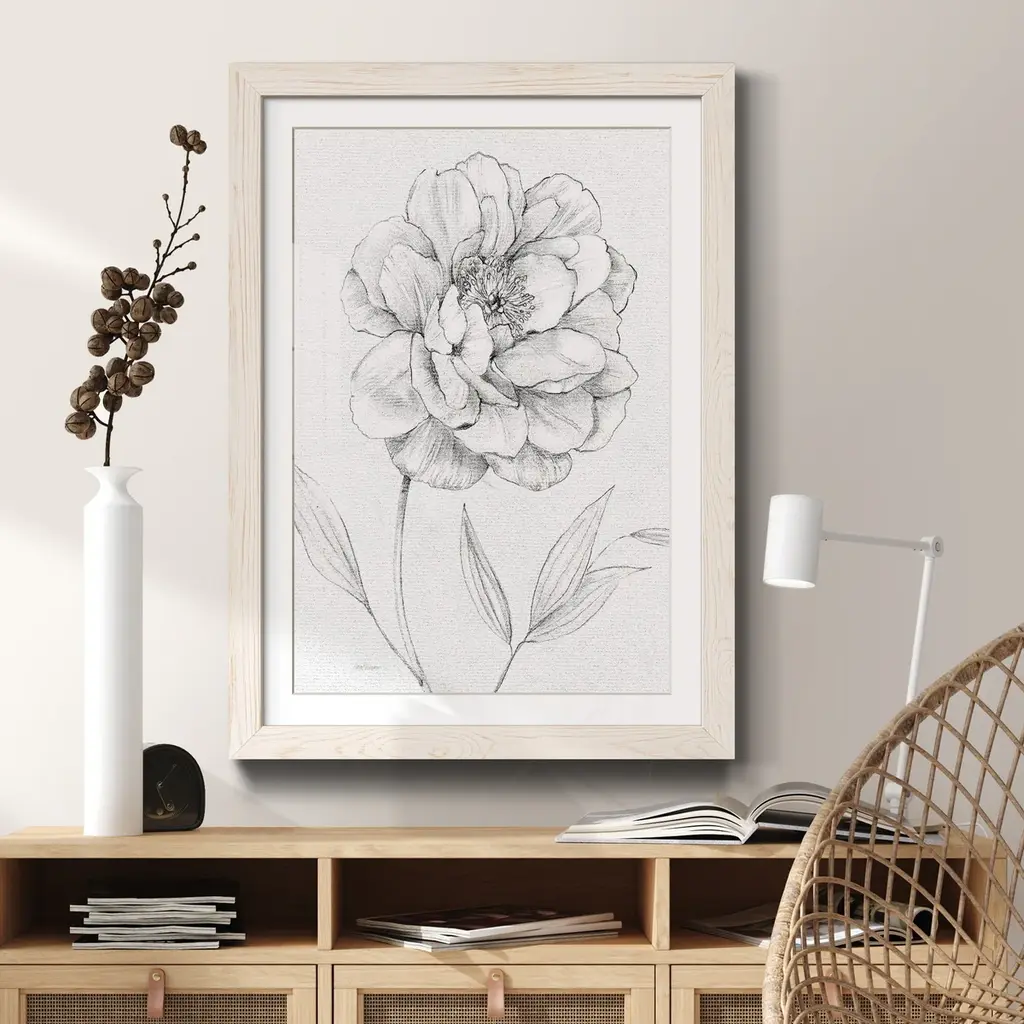 Peony Sketch-Premium Framed Print - Ready to Hang Framed in distressed wood and available in an array of sizes and colors Each piece is joined and assembled by hand and comes ready to hang 2 INCH BEVELED MATTE BOARD PLEXIGLASS COVERING READY TO HANG MADE IN THE USA SOLID WOOD FRAME MADE IN USA FADE RESISTANT GICLEE PRINTING on Canvas or Paper