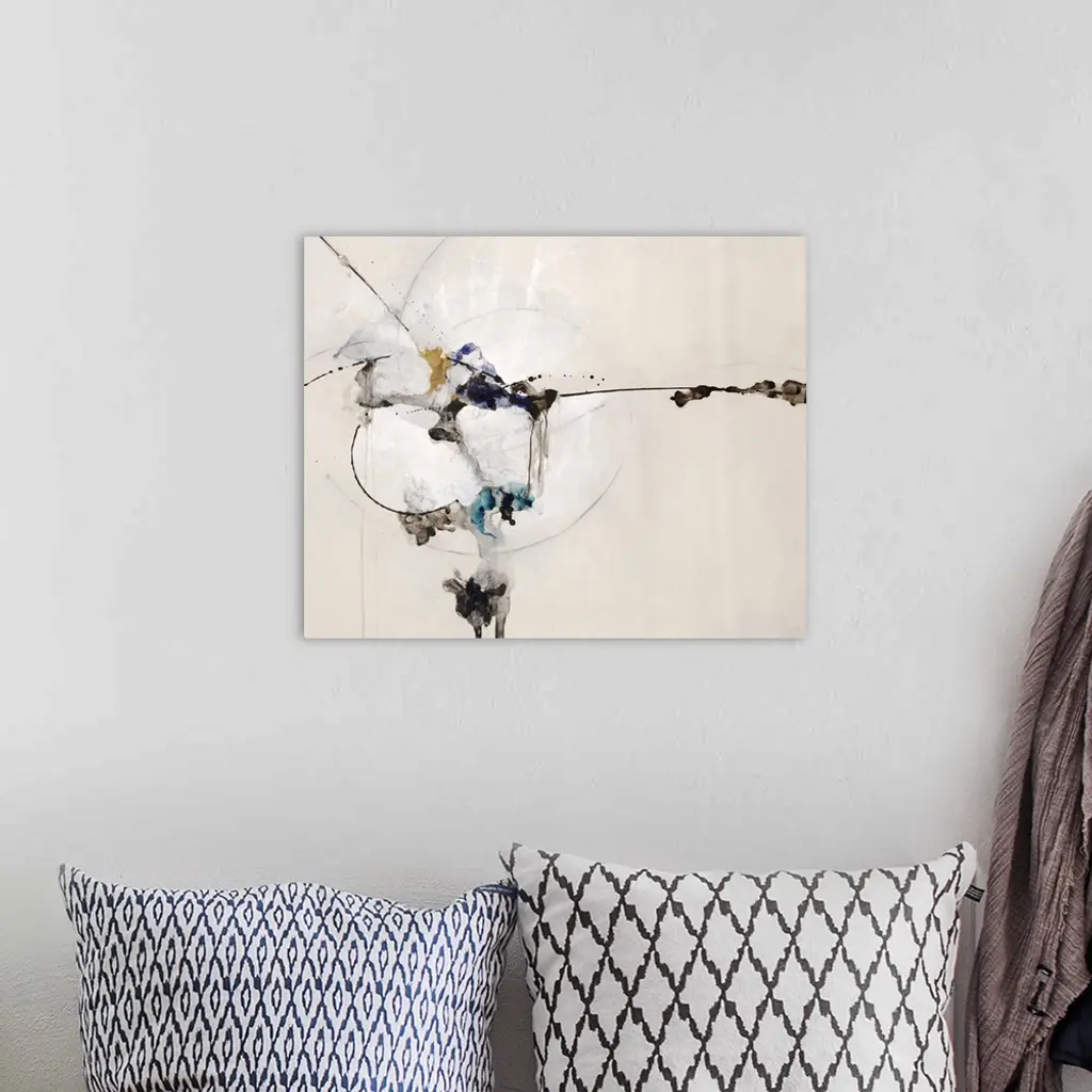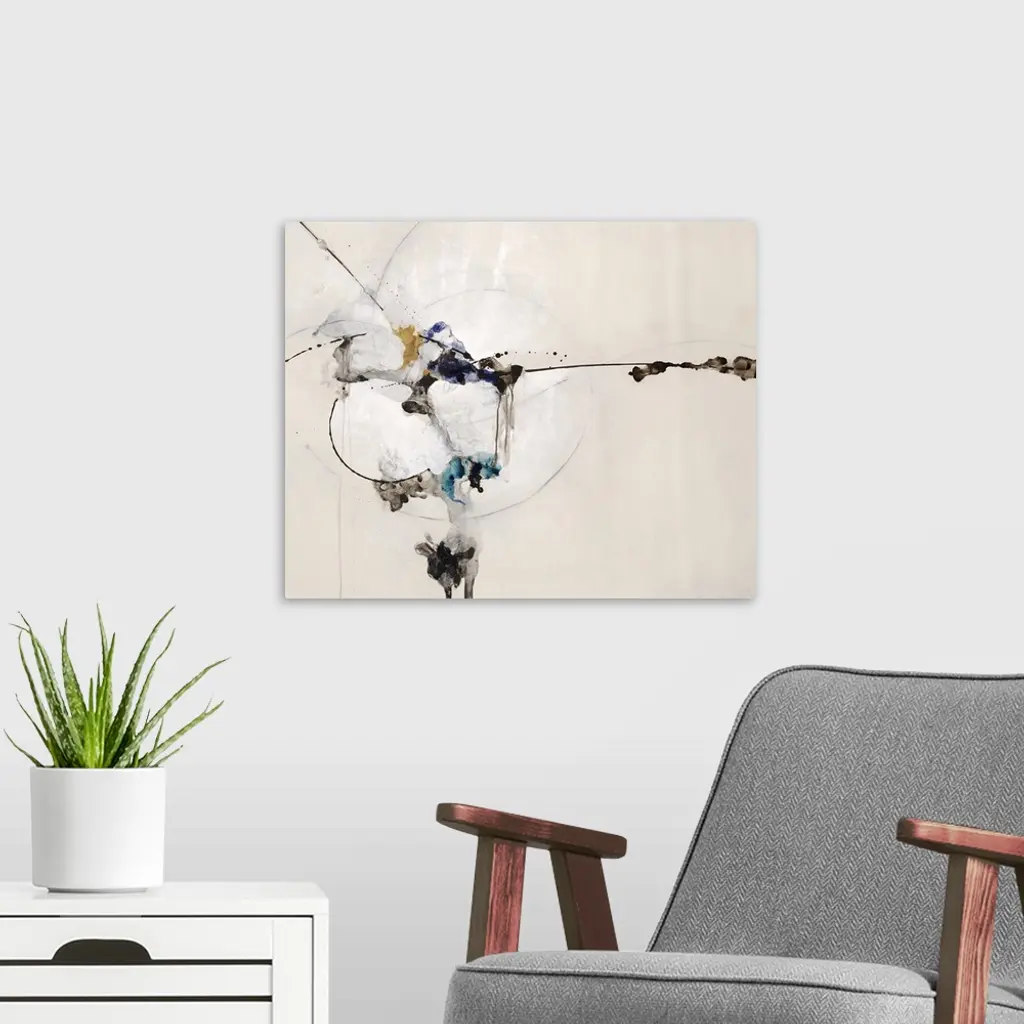 Large abstract painting with a light beige background and blotchy lined designs with bright pops of blue and gold.