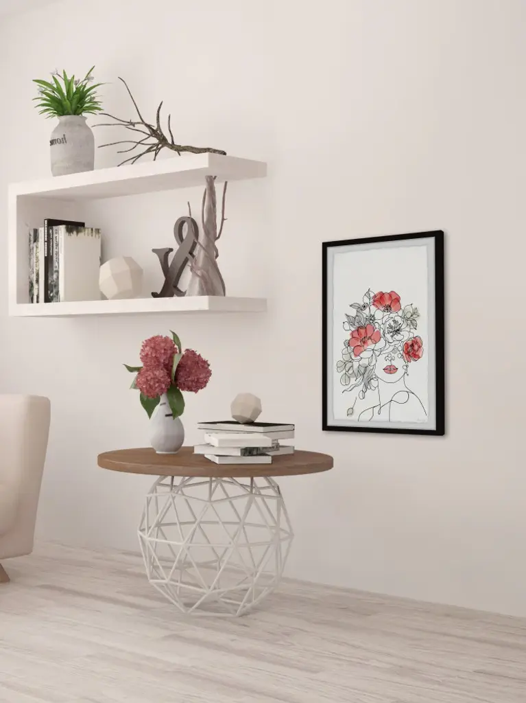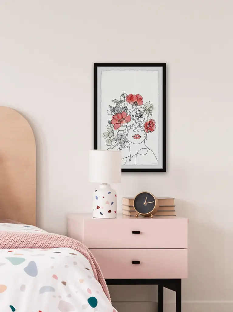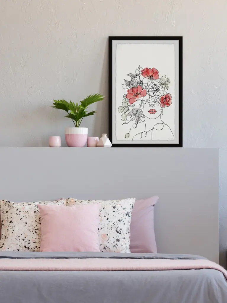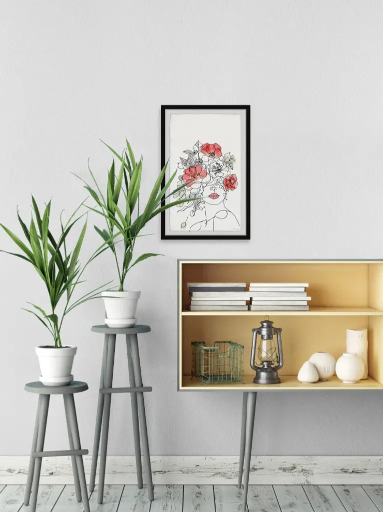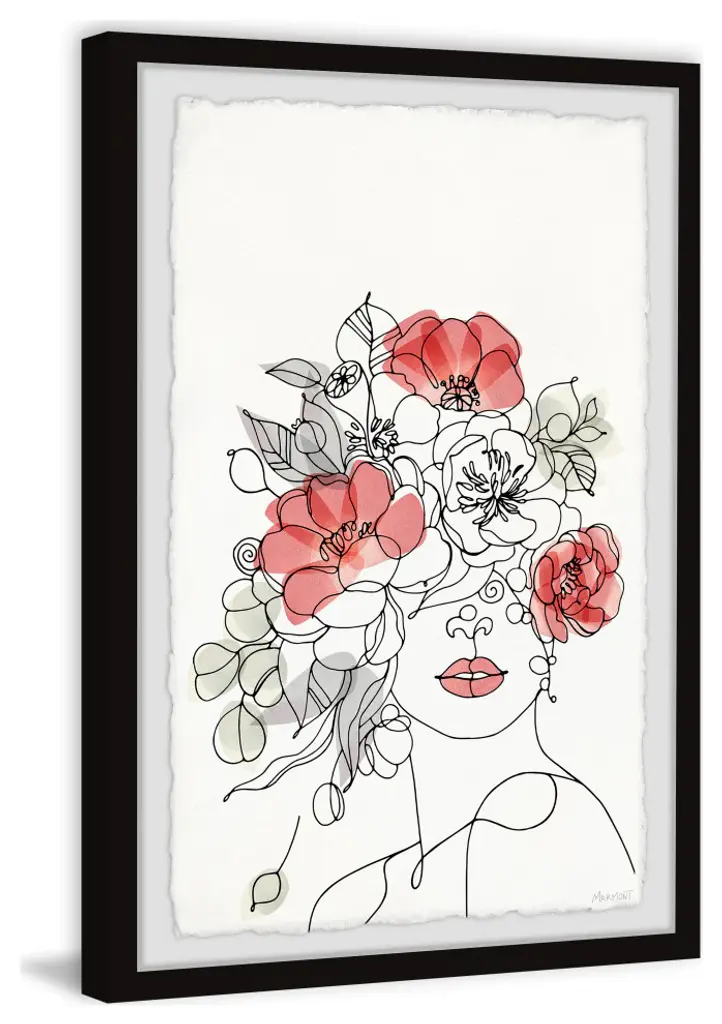 Great for spaces that need a pop of color, this print will complement your neutrals and make your space more vibrant. This drawing print features a woman- s face with red flowers that overlap her. Proudly printed in the USA, this piece is printed on high quality archive paper and professionally hand-framed. With wall-mounting hooks included, this artful accent is ready to hang up as soon as it reaches your front door.- Top quality Giclee print on high resolution Archive Paper- Hand cut deckled edges- High quality durable non-warping frame- Finished under shatter resistant plexiglass- Arrives ready to hang- Includes a certificate of authenticity- Printed in the USA