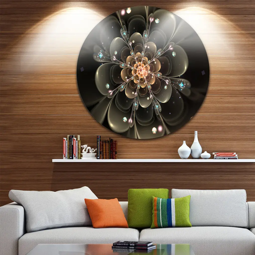 Bring Contemporary Abstraction to your home with this large Circle Metal wall art. This Perfect Shiny Fractal Flower in Dark Brown Metal Artwork makes it the focal point of any room or office. - White Gloss Coating ensures colors are extra vibrant with light reflection.- Aluminum grade Sheet Metal with 1 inch mounting frame on the back giving the illusion that the artwork is floating on the wall..- Mounting Brackets are included along with instructions.- High Quality Digital images are created directly into a glossy aluminum panel producing a stunning and captivating print into the glossy finish of the metal.- Water, Fire and Scratch resistant HD Aluminum panels.- Looks better than any photo paper and guaranteed to last at least 20 years- Easy to clean with a microfiber cloth. Colors are far superior to regular Canvas Art. - Easy to Hang