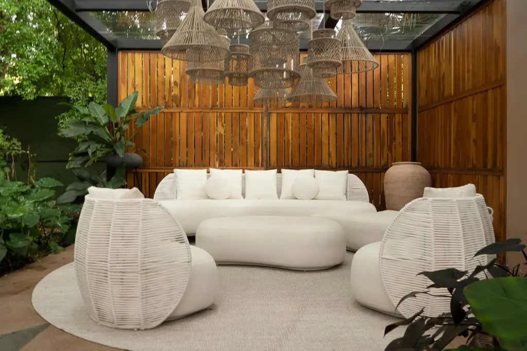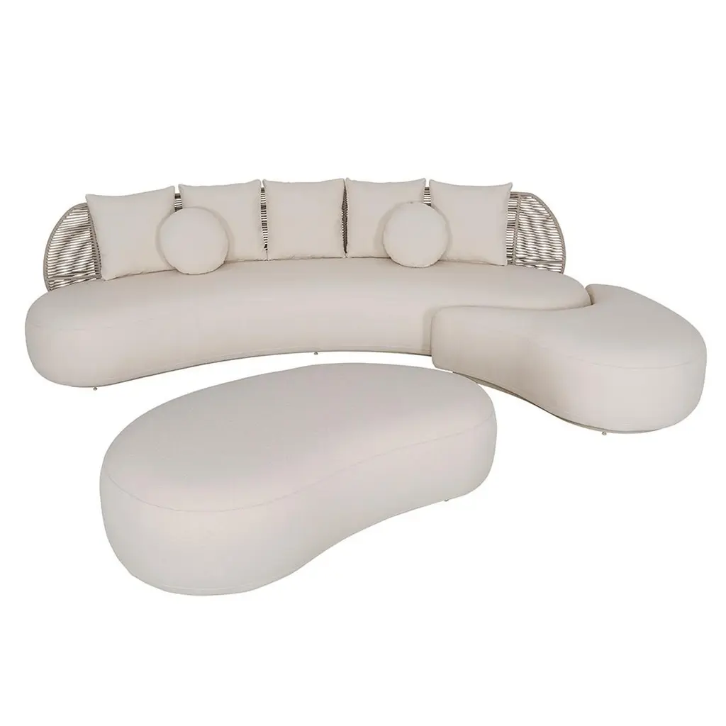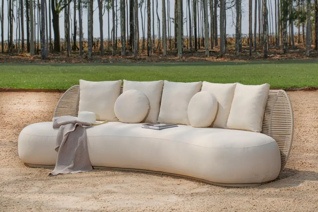 Perlage, French word: Pearl.The organic Perlage sofa has a backrest completely woven by hand in nautical rope, favoring a surprising look in every new detail discovered. Captivating from any angle, the sofa oozes the best of high technology and innovative design.The collection has fluid features, suggesting comfort and bringing people closer to the center of the environment.All made of high-resistance nautical materials, which allow for use both indoors and outdoors.The foam is dry foam that repels rain and dries with two hours of sun.The fabric is a bouclé type for outdoor areas, a great innovation when it comes to items resistant to the sun, rain and pool chlorine.The sofa is completely structured in aluminum, an ecologically correct and weather resistant material with electrostatic painting in several color options.-Accompanies 5 loose rectangular pillows and two round pillows.The Perlage Organic Collection has three options for measuring large sofas, an ottoman, a drop chaise to lengthen the atmosphere and a charming armchair, as it is sold separately - REQUEST INFORMATION, or see our storefront.