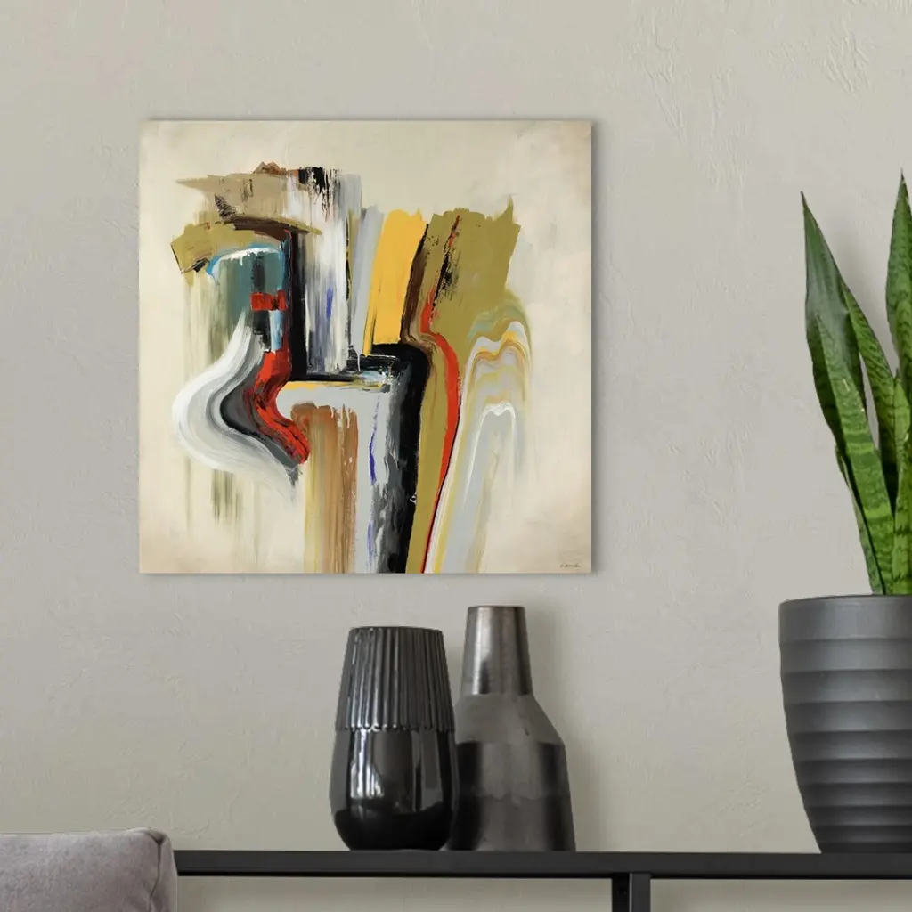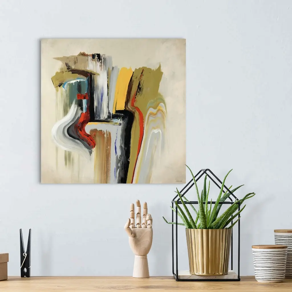 This square abstract painting of broad, erratic brush strokes dripping down the painting.