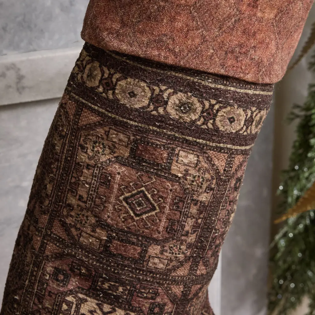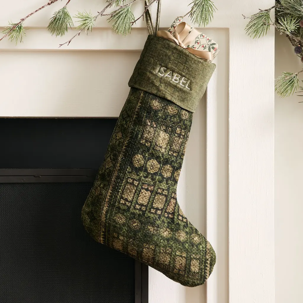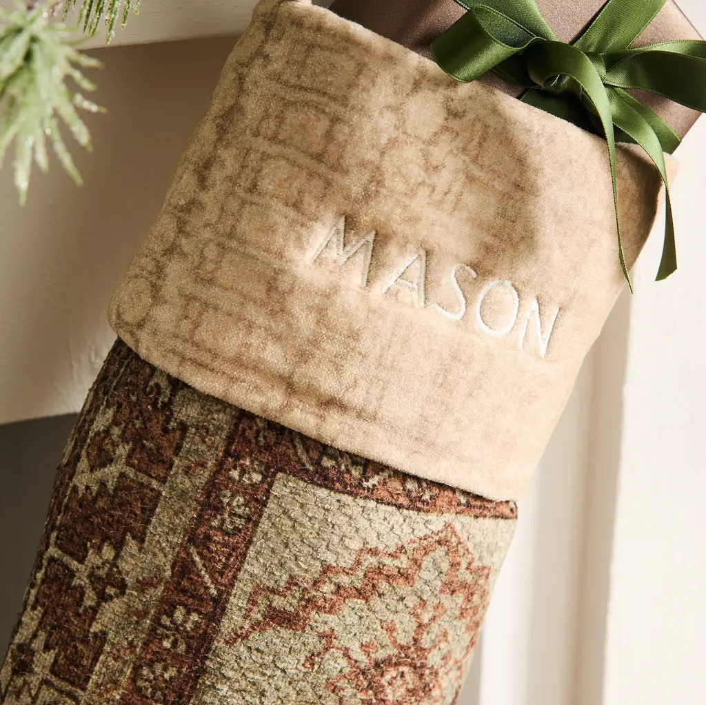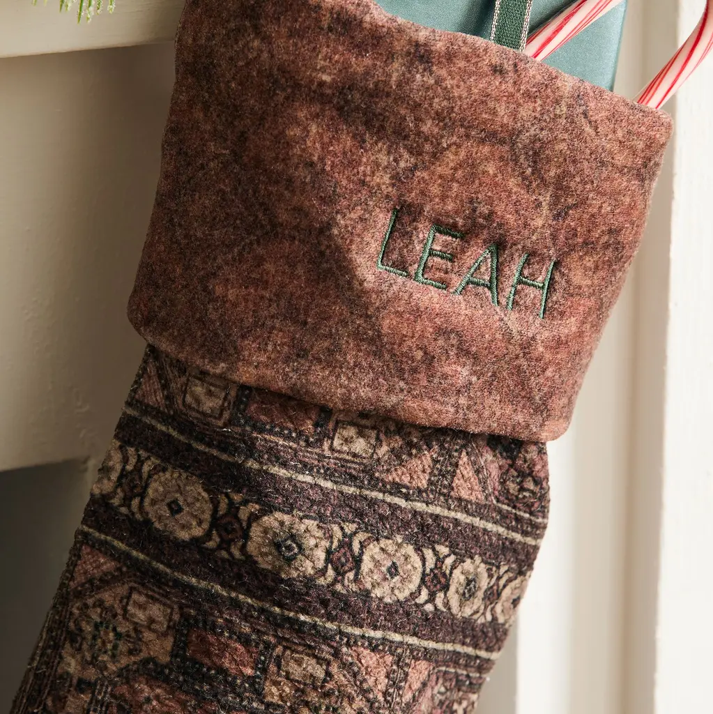 Inspired by the beauty of a vintage rug. Brings seasonal charm to a mantel or stair rail. Perfect for stuffing with treats, treasures and cheer. Personalize this stocking to make it a family heirloom.