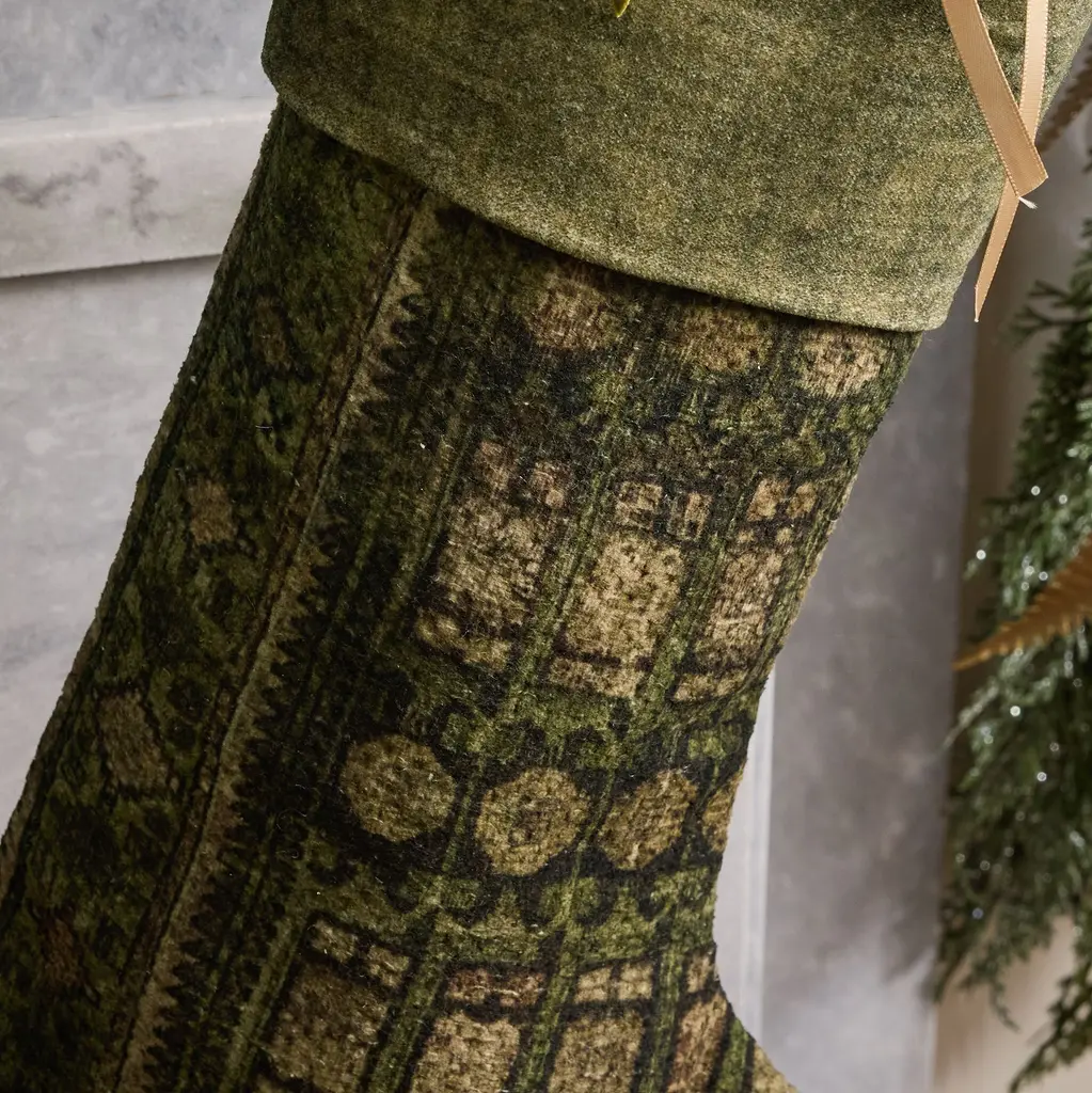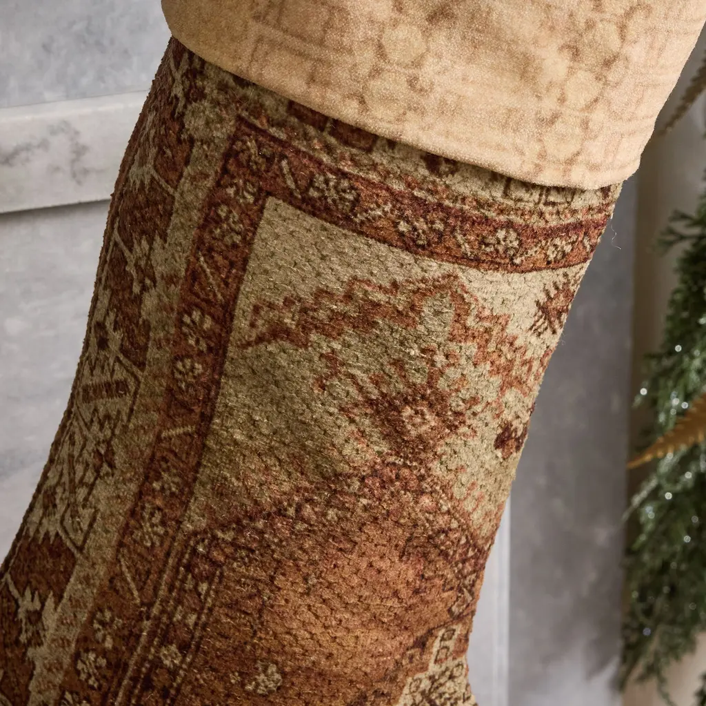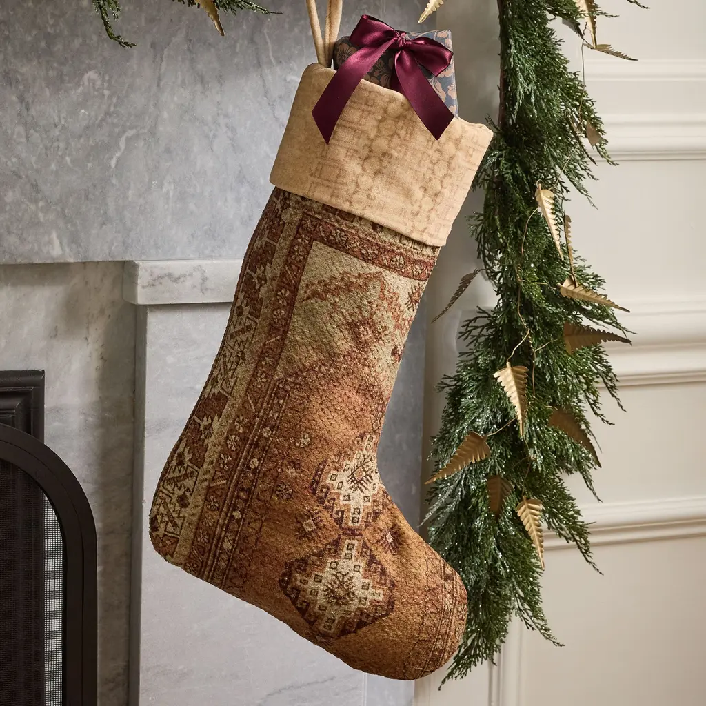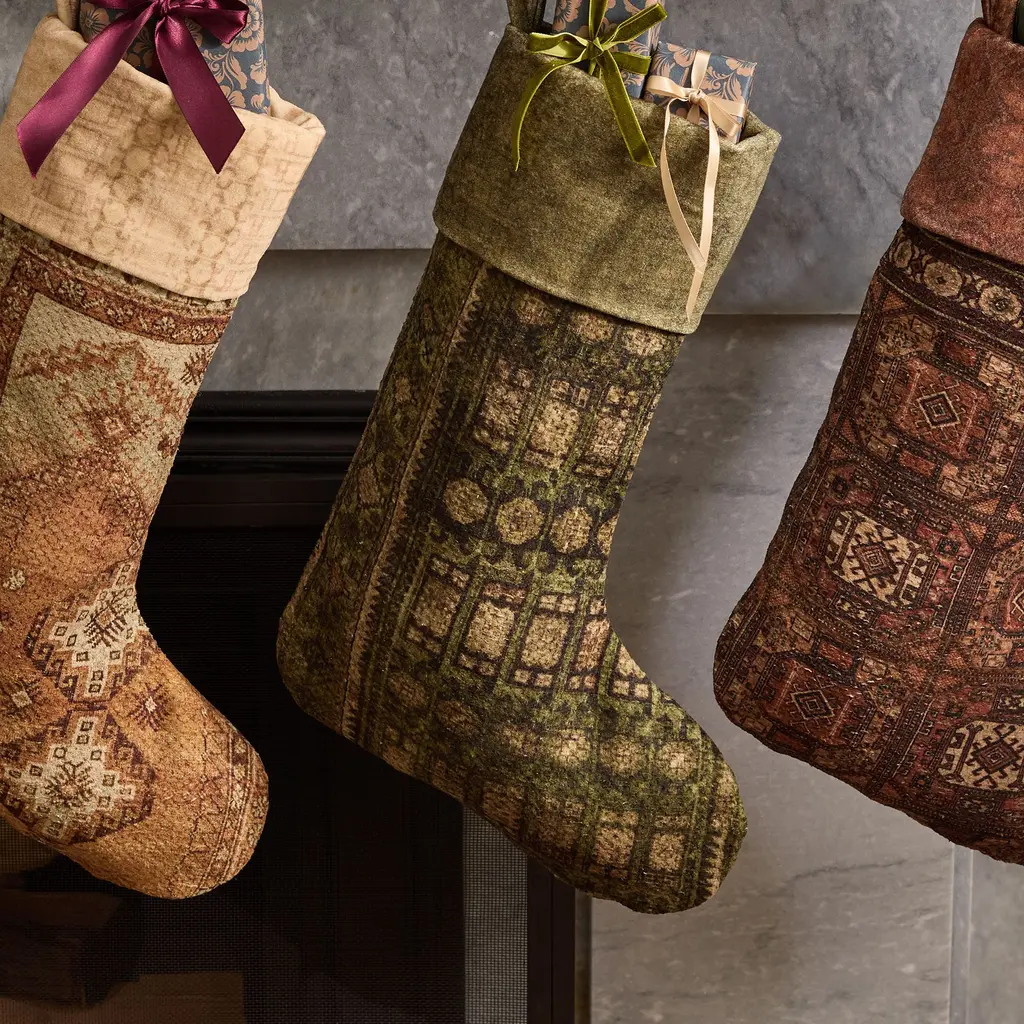 Inspired by the beauty of a vintage rug. Brings seasonal charm to a mantel or stair rail. Perfect for stuffing with treats, treasures and cheer. Personalize this stocking to make it a family heirloom.