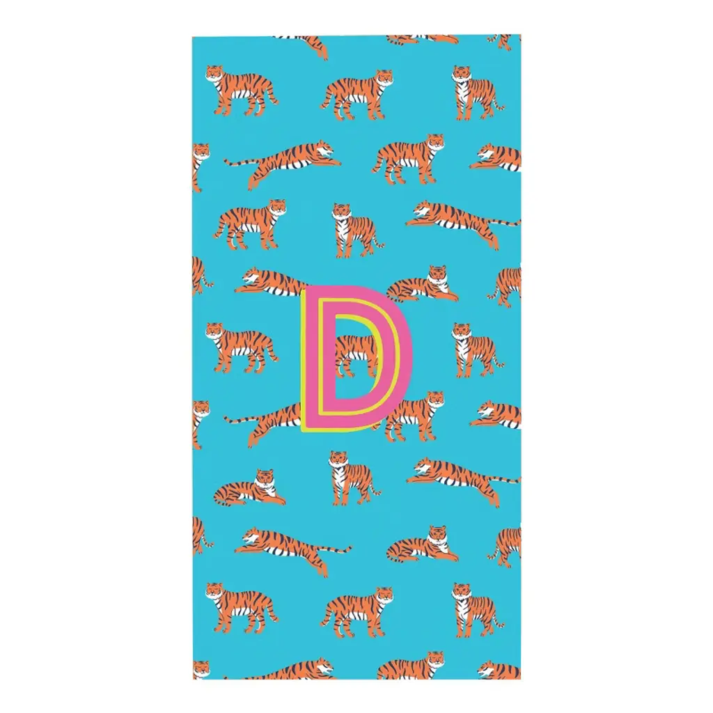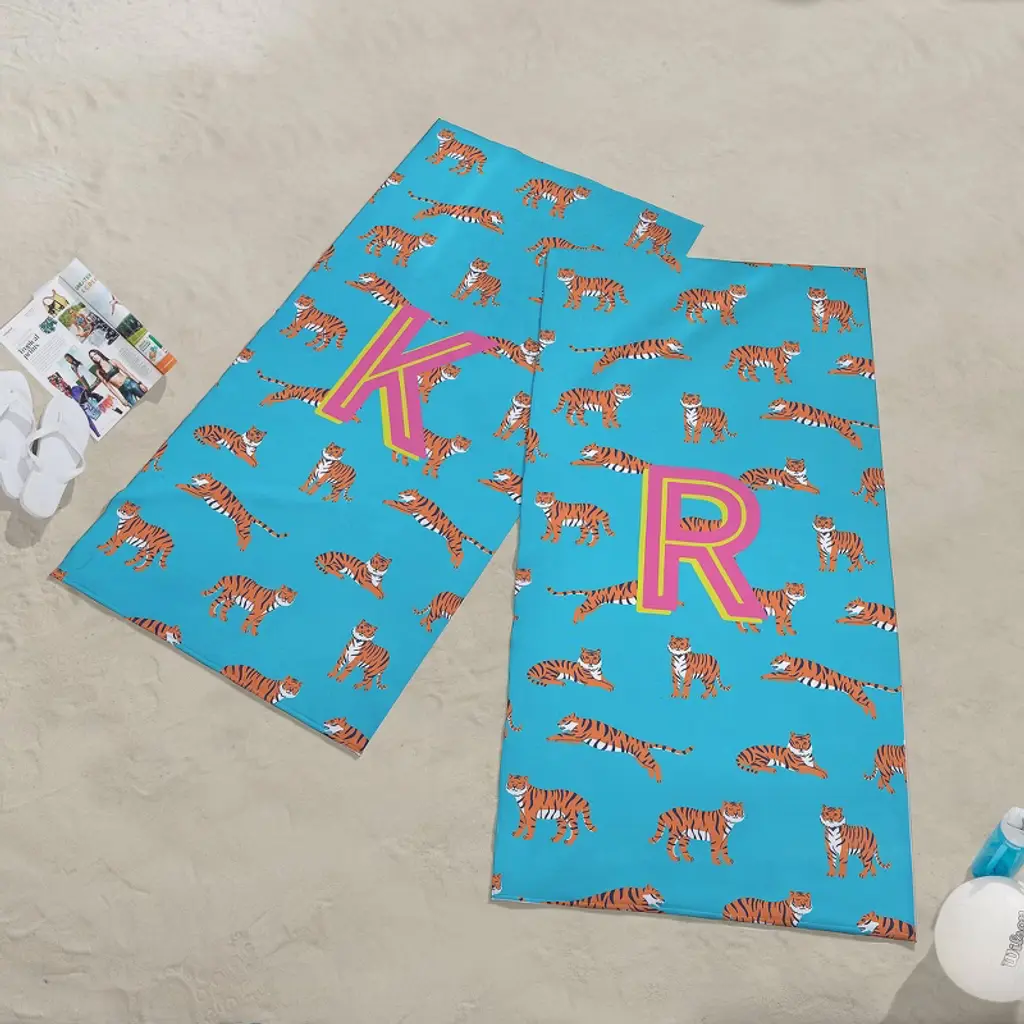 Unleash your inner spirit animal with the Personalization Mall Tiger Print Initial Beach Towel. This vibrant towel is designed for those who aren’t afraid to stand out. With a striking tiger pattern, it adds a splash of personality to your beach day essentials. The towel offers a unique blend of polyester and cotton velour, ensuring softness and durability. Its generous size of 30" W x 60" L provides comfort and ample space to lounge. Fully printed on the front with your chosen initial, the reverse side remains classic white for added versatility. Effortlessly machine washable, it's as easy to care for as it is eye-catching. Make it uniquely yours and redefine wild in style.