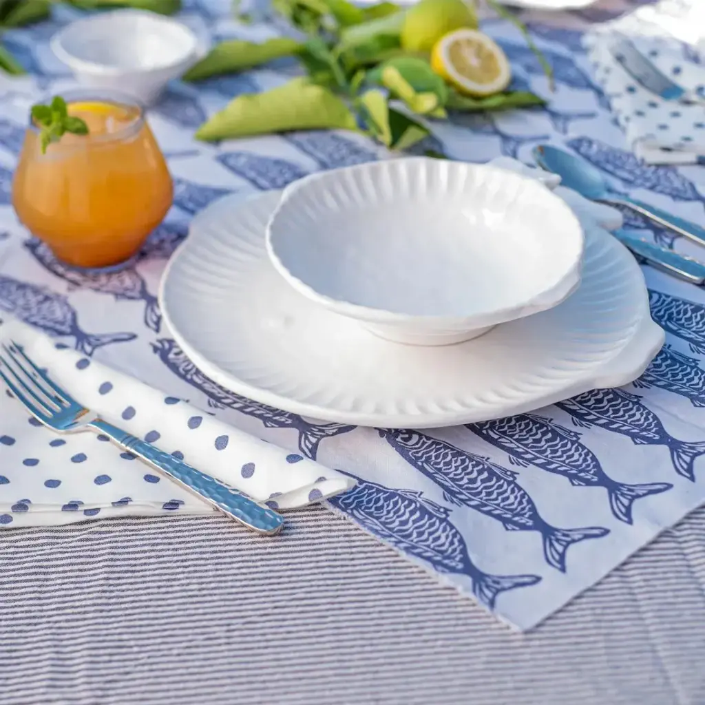 Playing off the handpressed edges of Pietra Serena, Pesce Serena recreates unique silhouettes of the playful fish painting your table in a coastal story. Since 1983, Vietri has specialized exclusively in Italian handcrafted ceramics, stainless and pewter flatware, mouth blown glassware, lamps, urns and planters. Families of artisans with 3 or 4 generations of history create these special pieces using centuries-old techniques. The subtle color from a paintbrush and the curving stroke of the artist's hand are never repeated in quite the same way, making each piece truly unique.